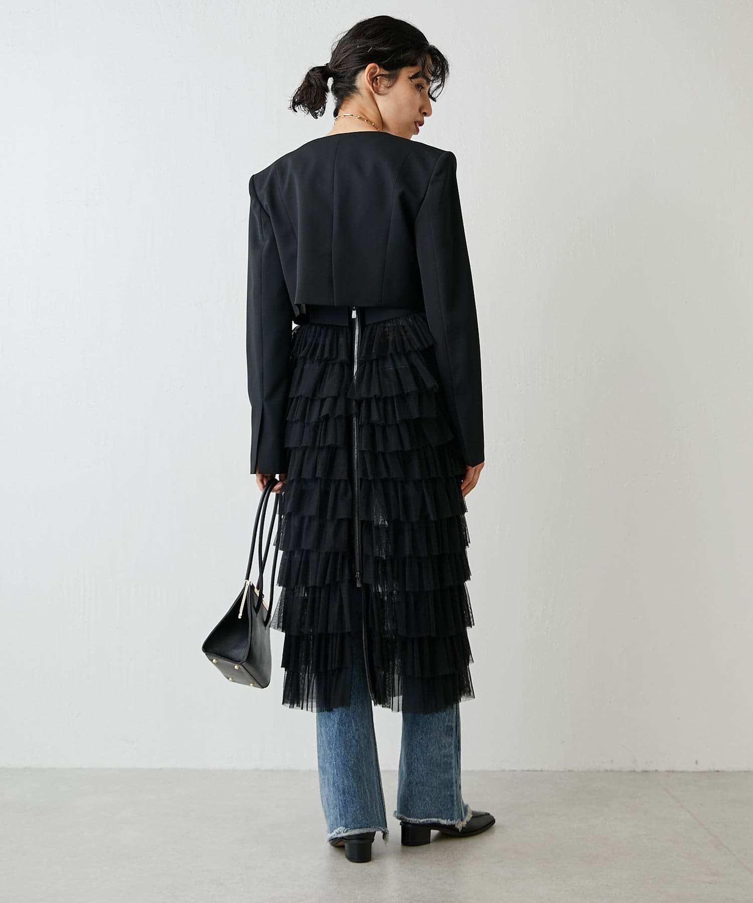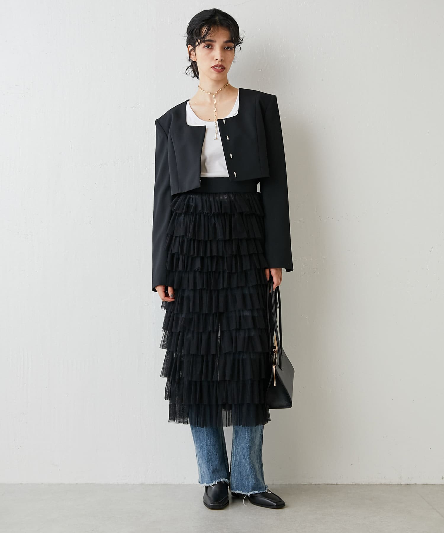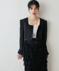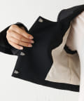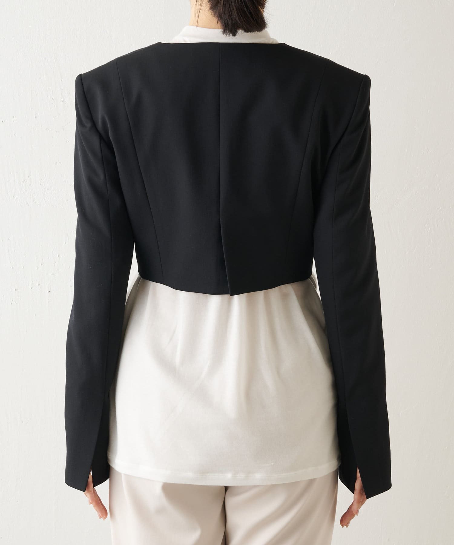 ■短丈デザインでトレンド感たっぷりに仕上げたショートジャケット。
