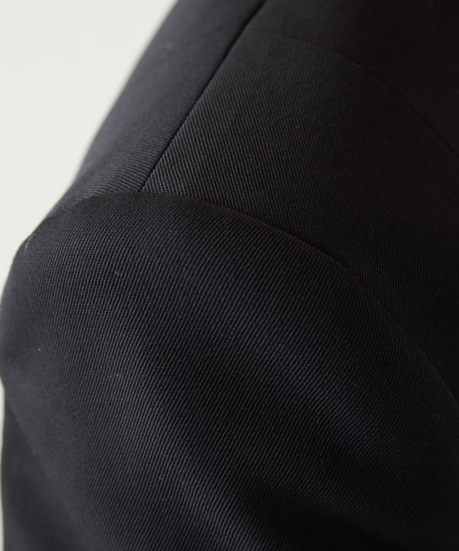 含浸加工をしながら、強撚のドライなタッチが共存したギャバ素材に、樹脂加工をすることでハリコシがあり構築的なフォルムを出やすくした生地。