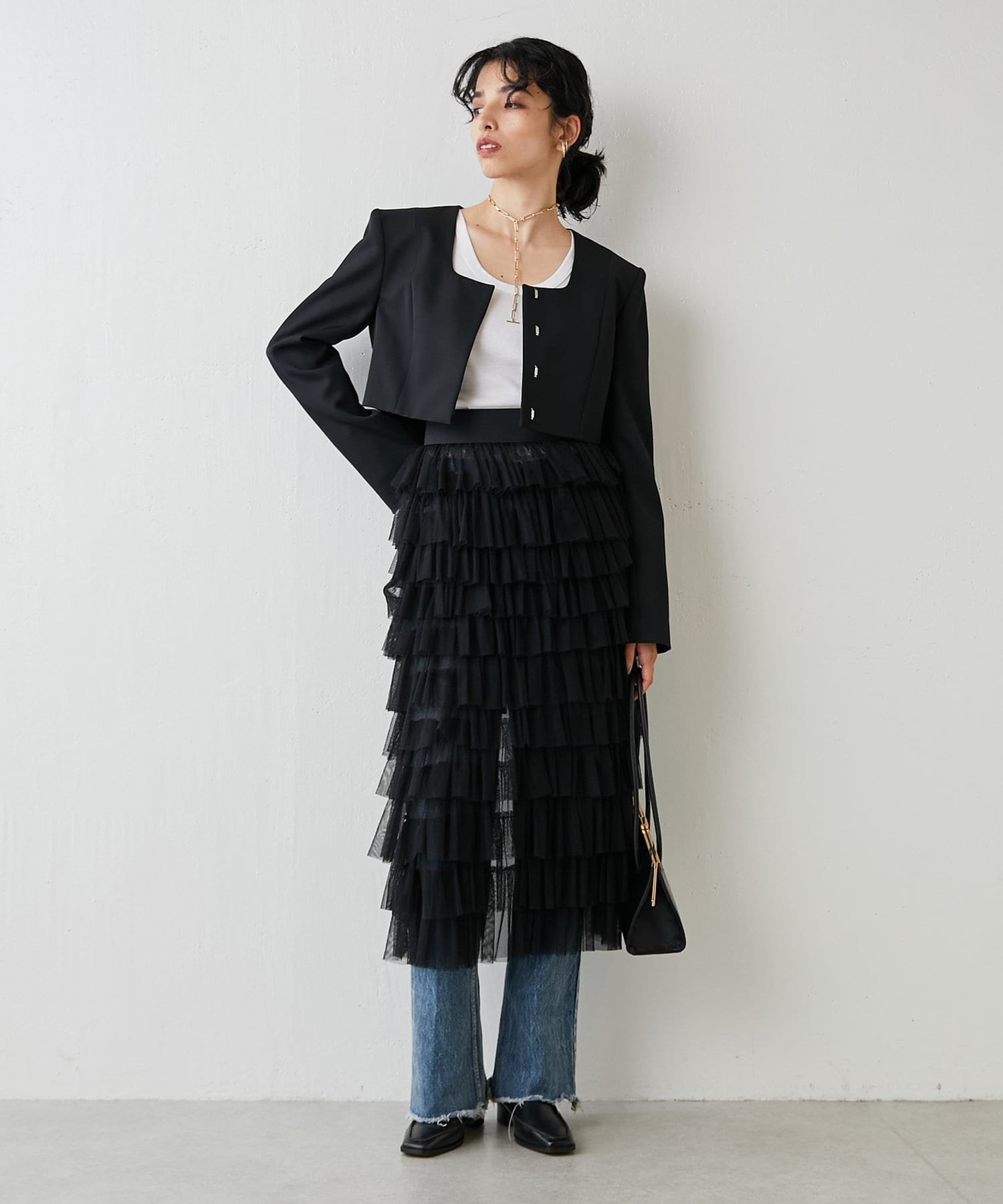 ■腰の位置を高く見せてくれるクロップド丈は、さらりと羽織るだけでスタイルアップ効果も。