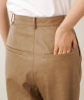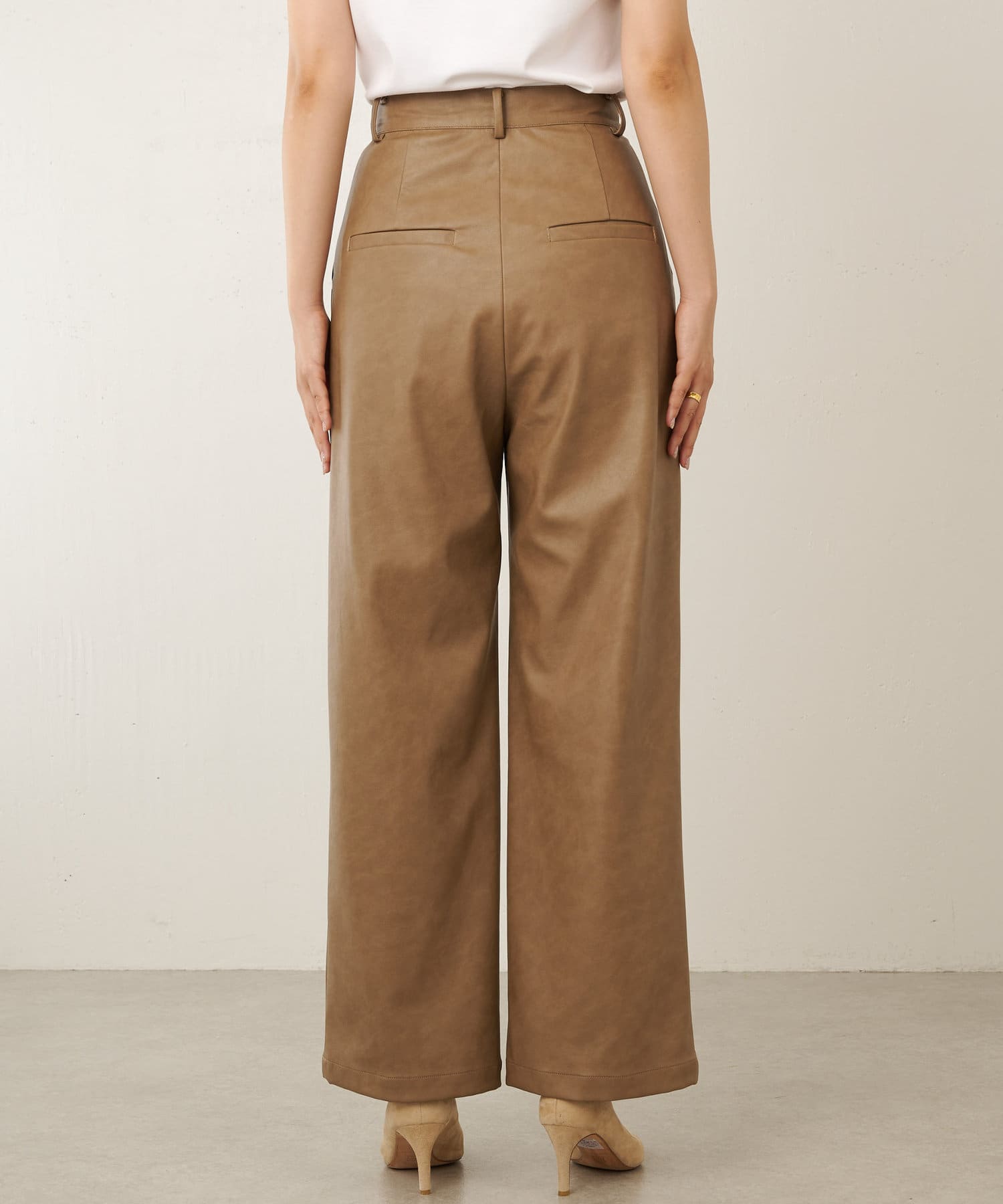 程よい太さでこなれ感のでるフェイクレザーパンツ。タックがマニッシュさをプラス。風合いが上品です。季節を感じられるオシャレアイテムで、Tシャツ合わせから、秋冬はニットとの相性も抜群です。