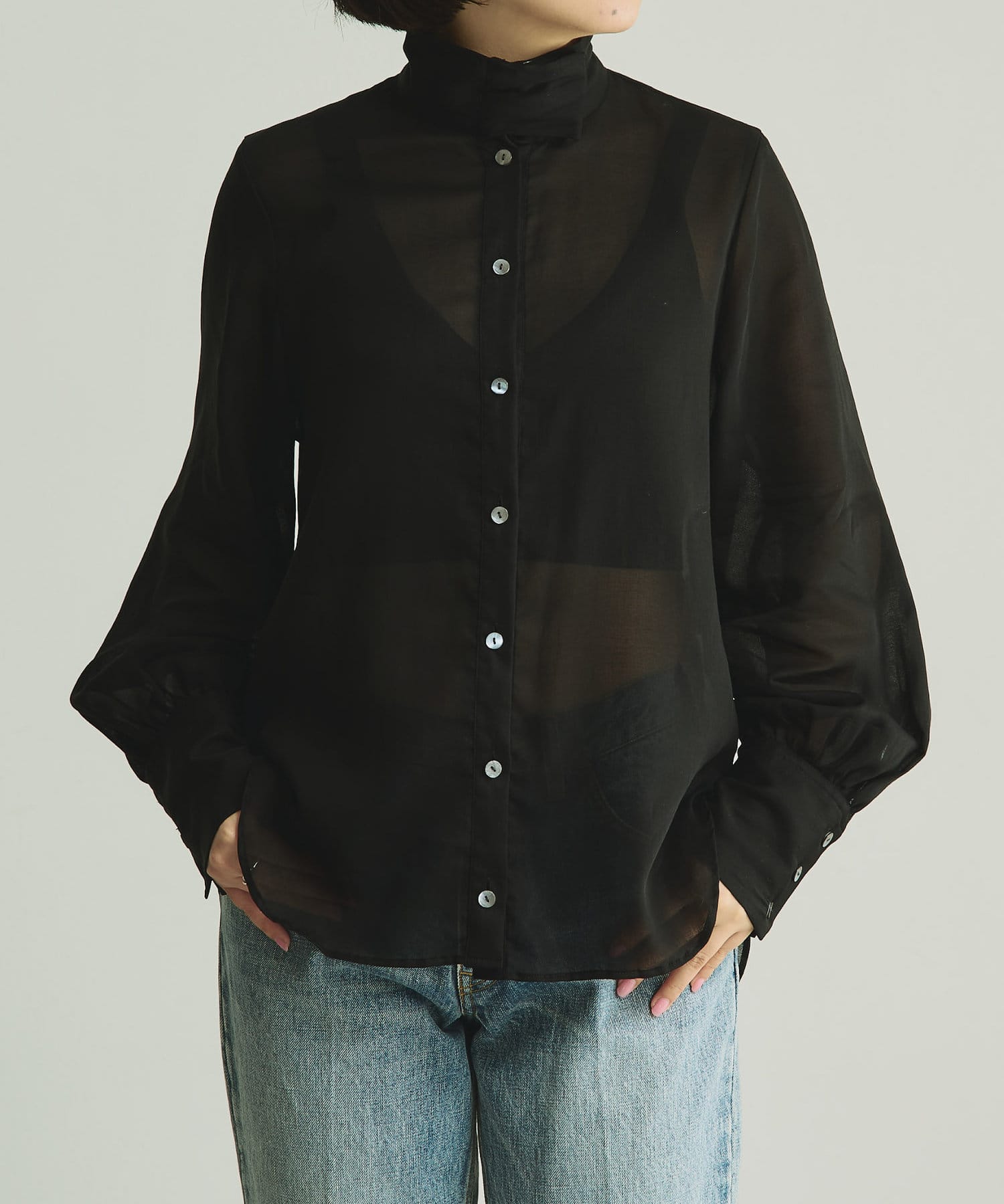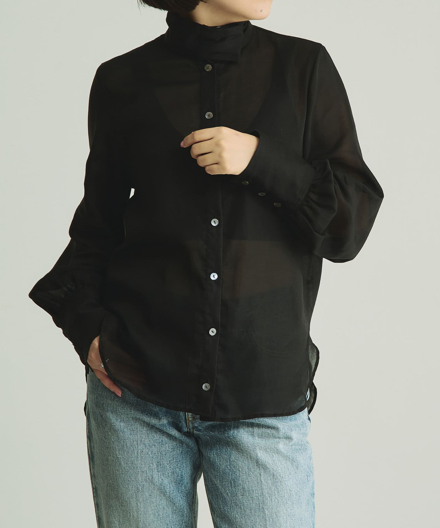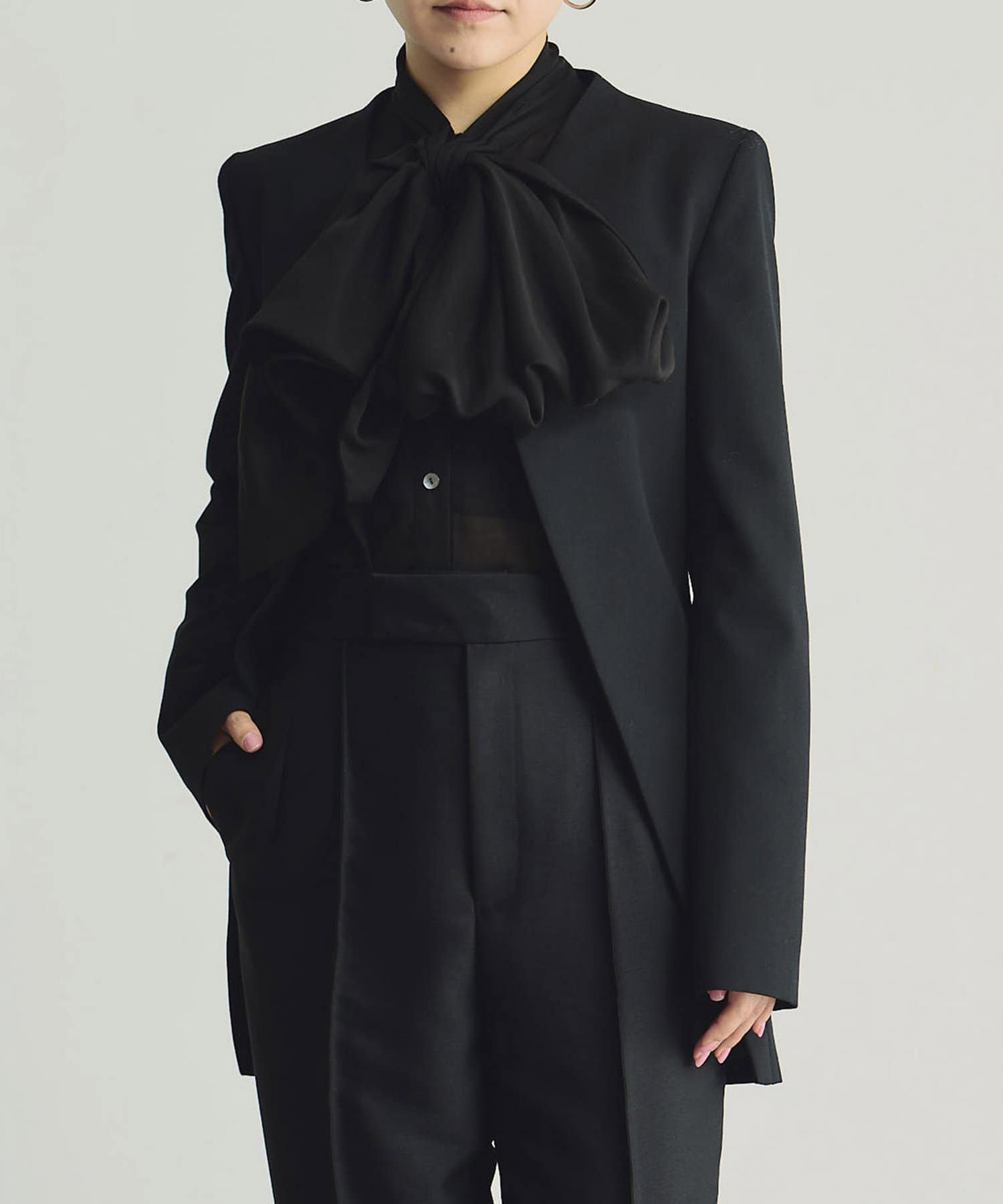 ■ボウタイを付けずにスタンドカラーとしても着用でき、一枚あれば幅広いスタイリングに着回しの効くアイテム。