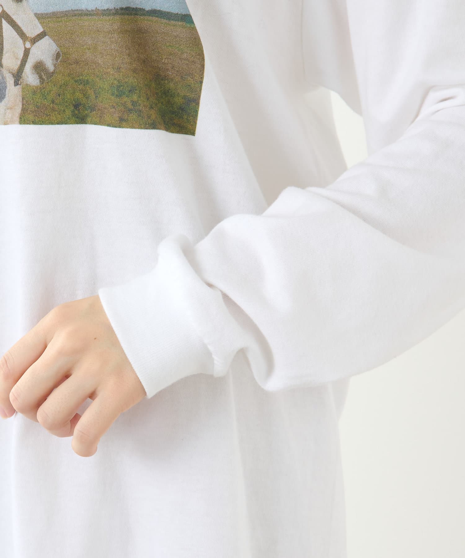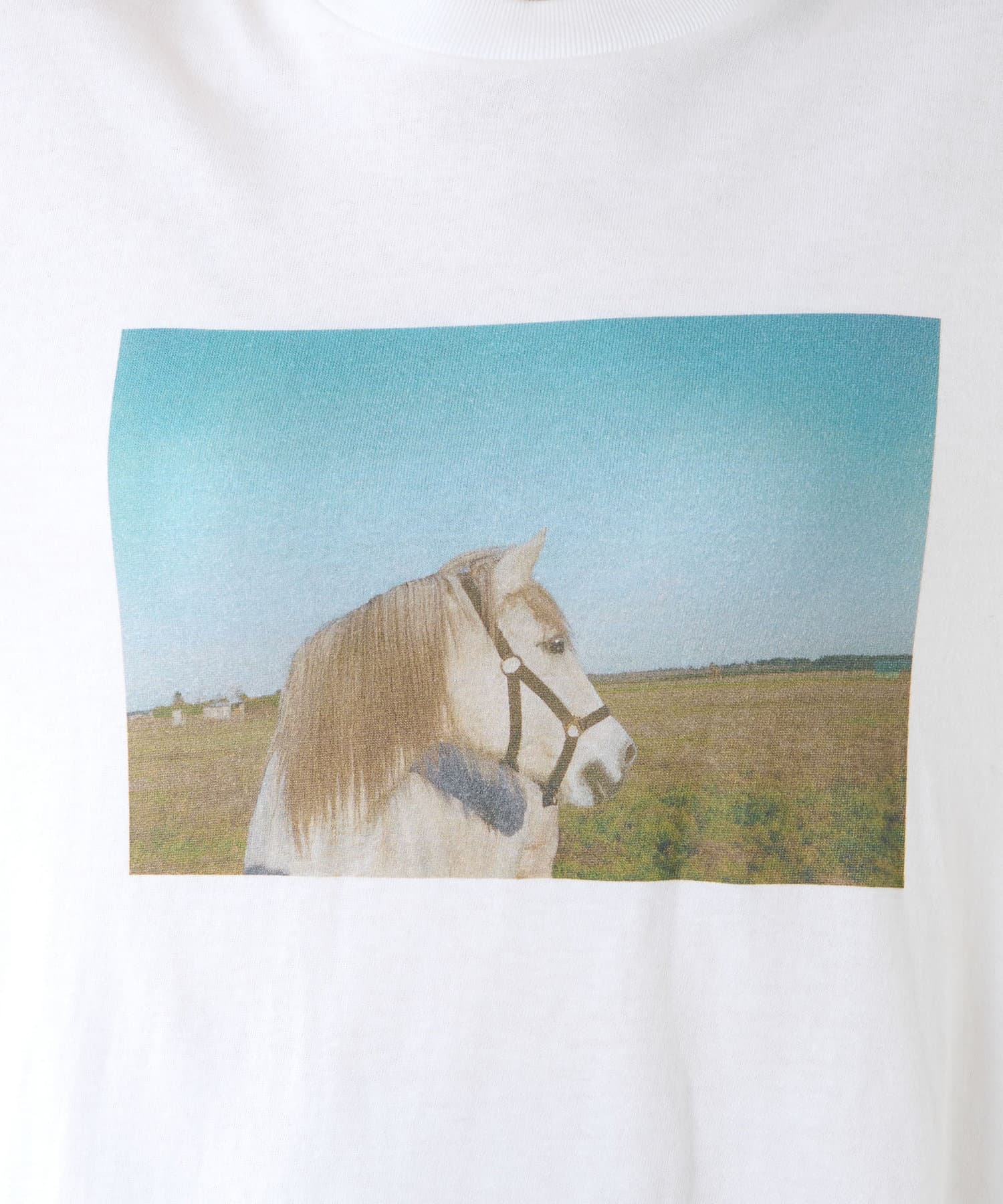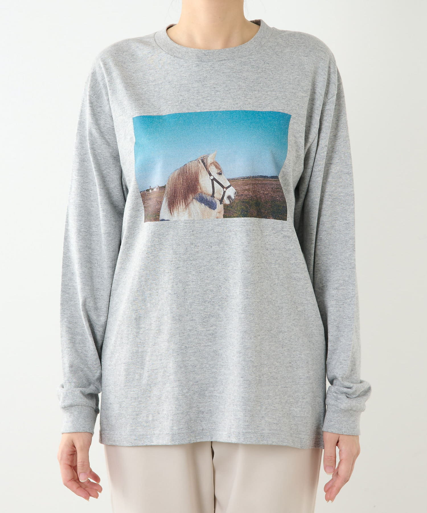 白馬のフォトが目をひくロンT。コーディネートにさり気なくポイントを作ってくれ、馴染むデザイン。ややゆったりめなフォルムがおしゃれなアイテム。一枚で綺麗めなボトム合わせも素敵ですし、カーディガンやジャケット合わせもおすすめです。