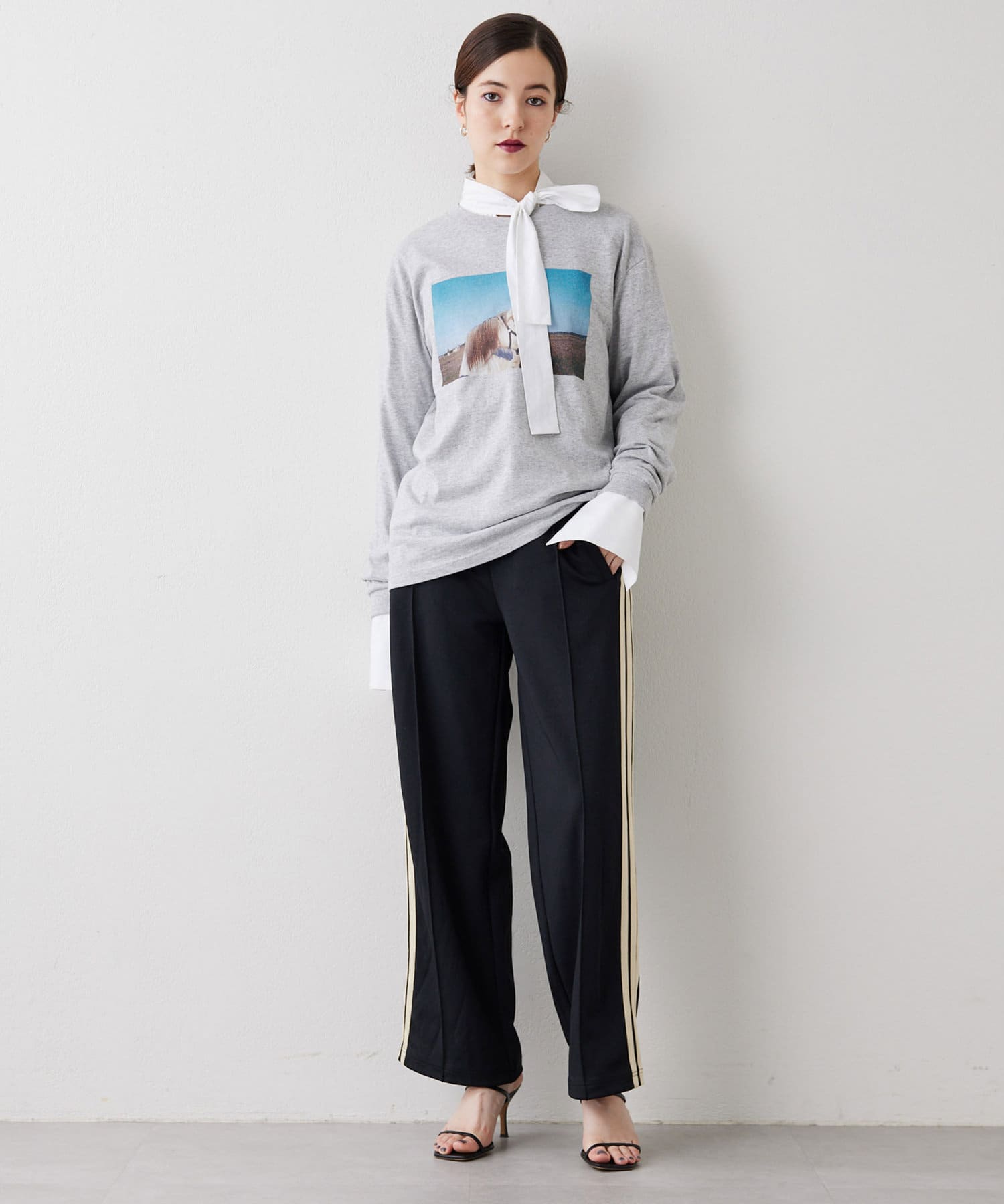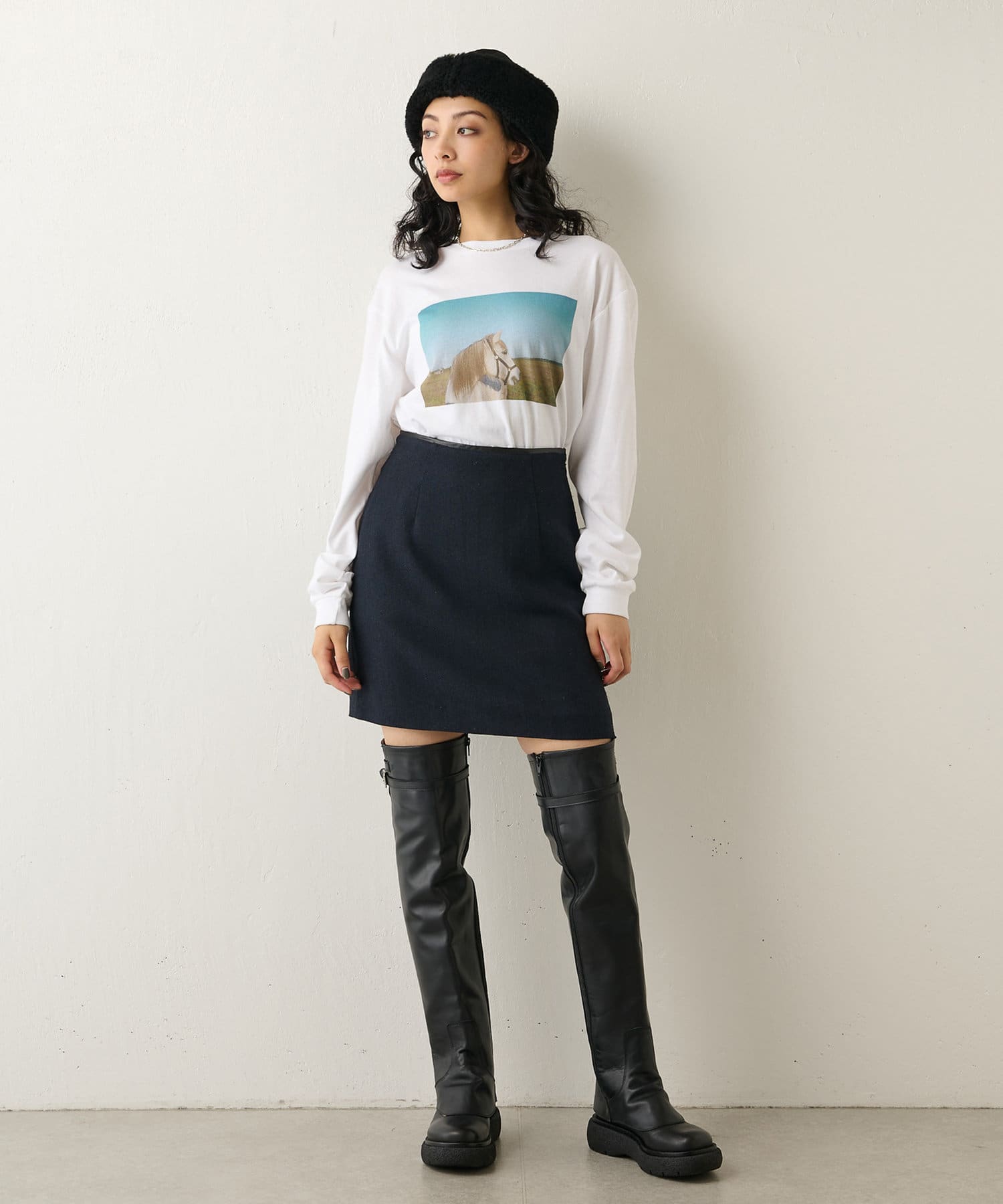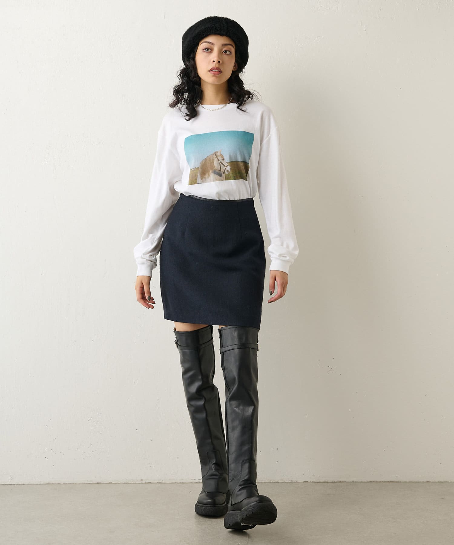 白馬のフォトが目をひくロンT。コーディネートにさり気なくポイントを作ってくれ、馴染むデザイン。ややゆったりめなフォルムがおしゃれなアイテム。一枚で綺麗めなボトム合わせも素敵ですし、カーディガンやジャケット合わせもおすすめです。