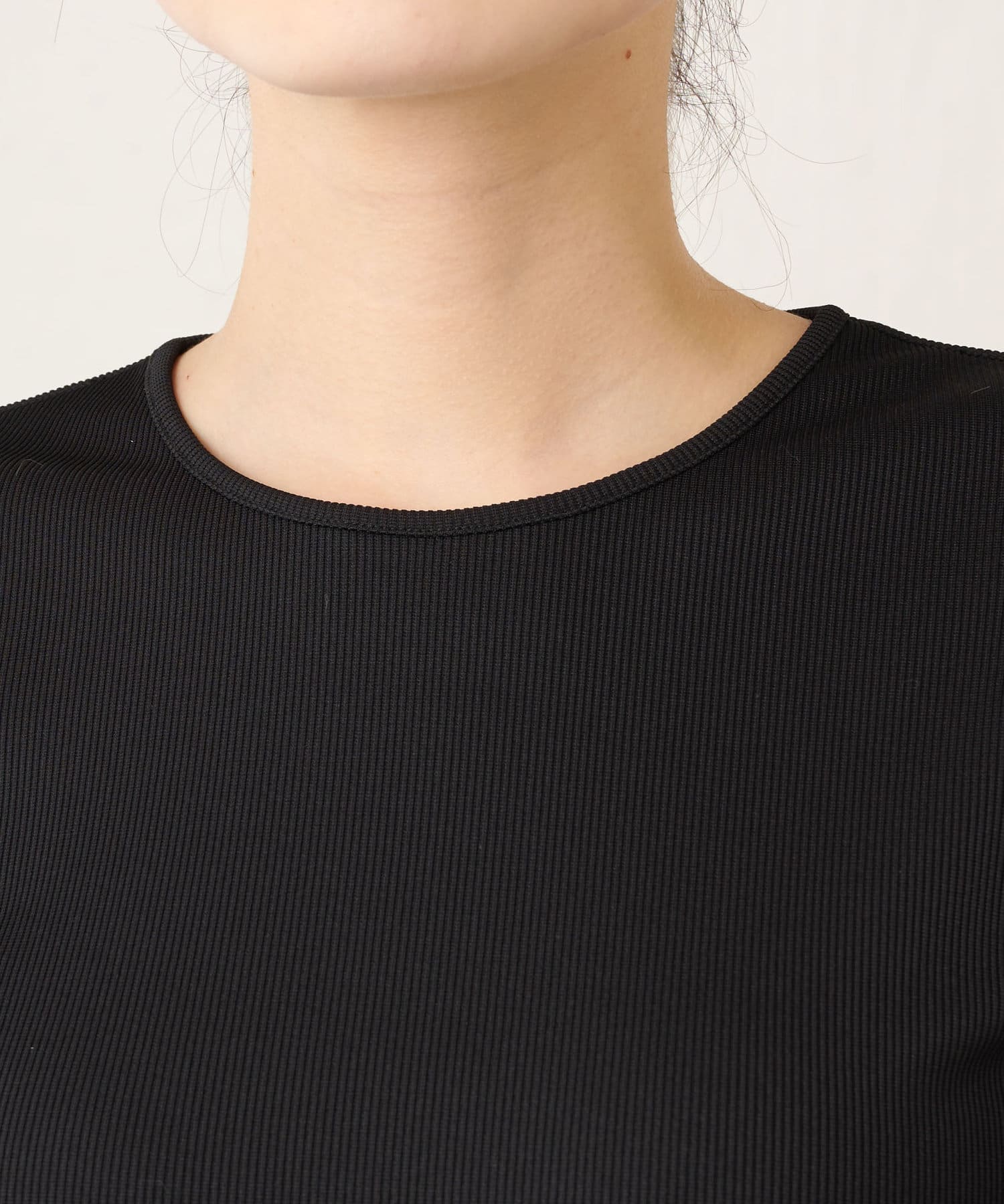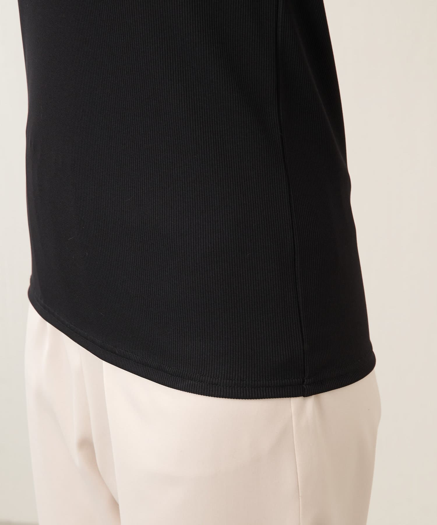 ■ポリエステル素材のリブカットソーは、コットン素材よりも伸びやヨレに強くタイトなシルエットをキープ。