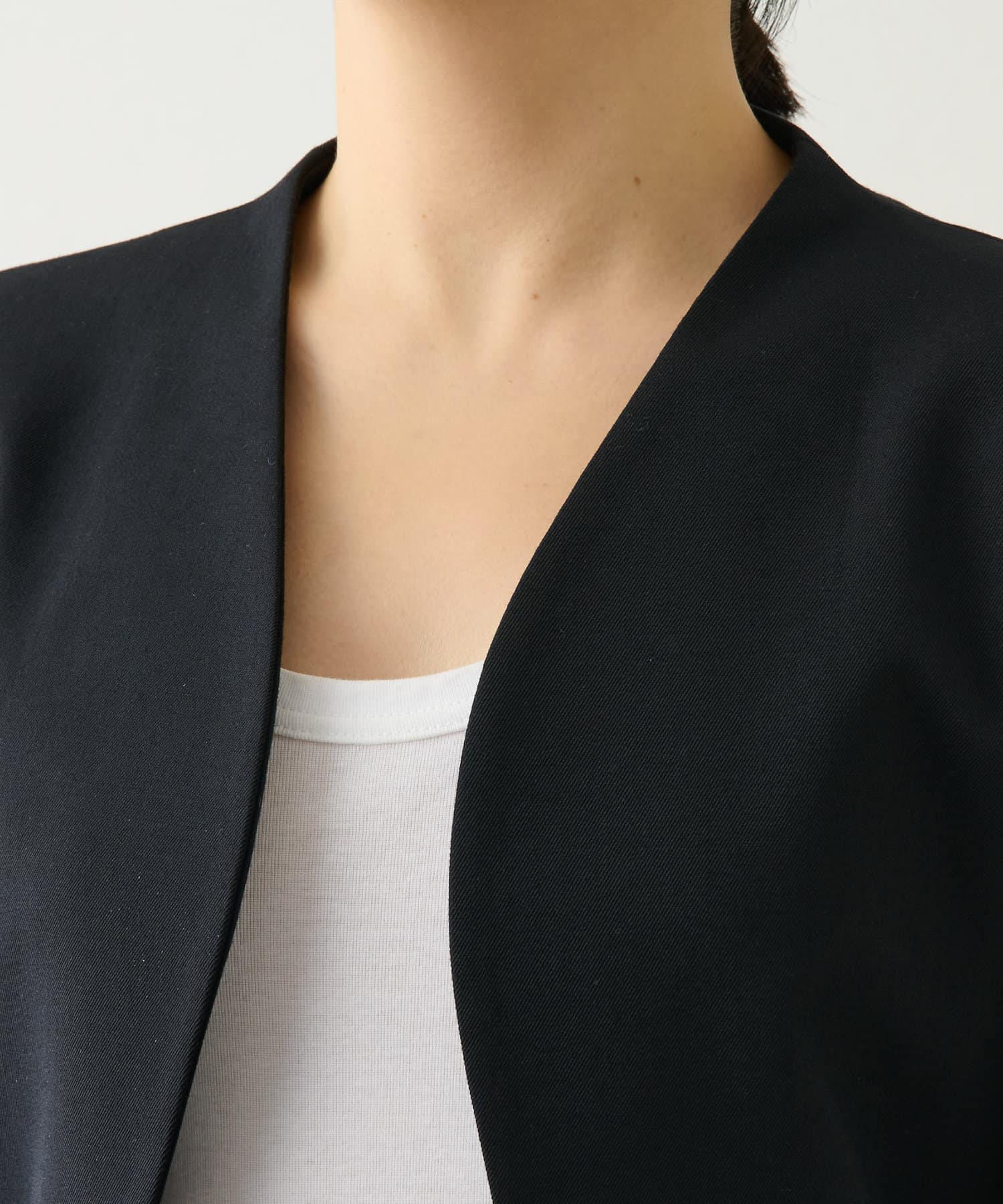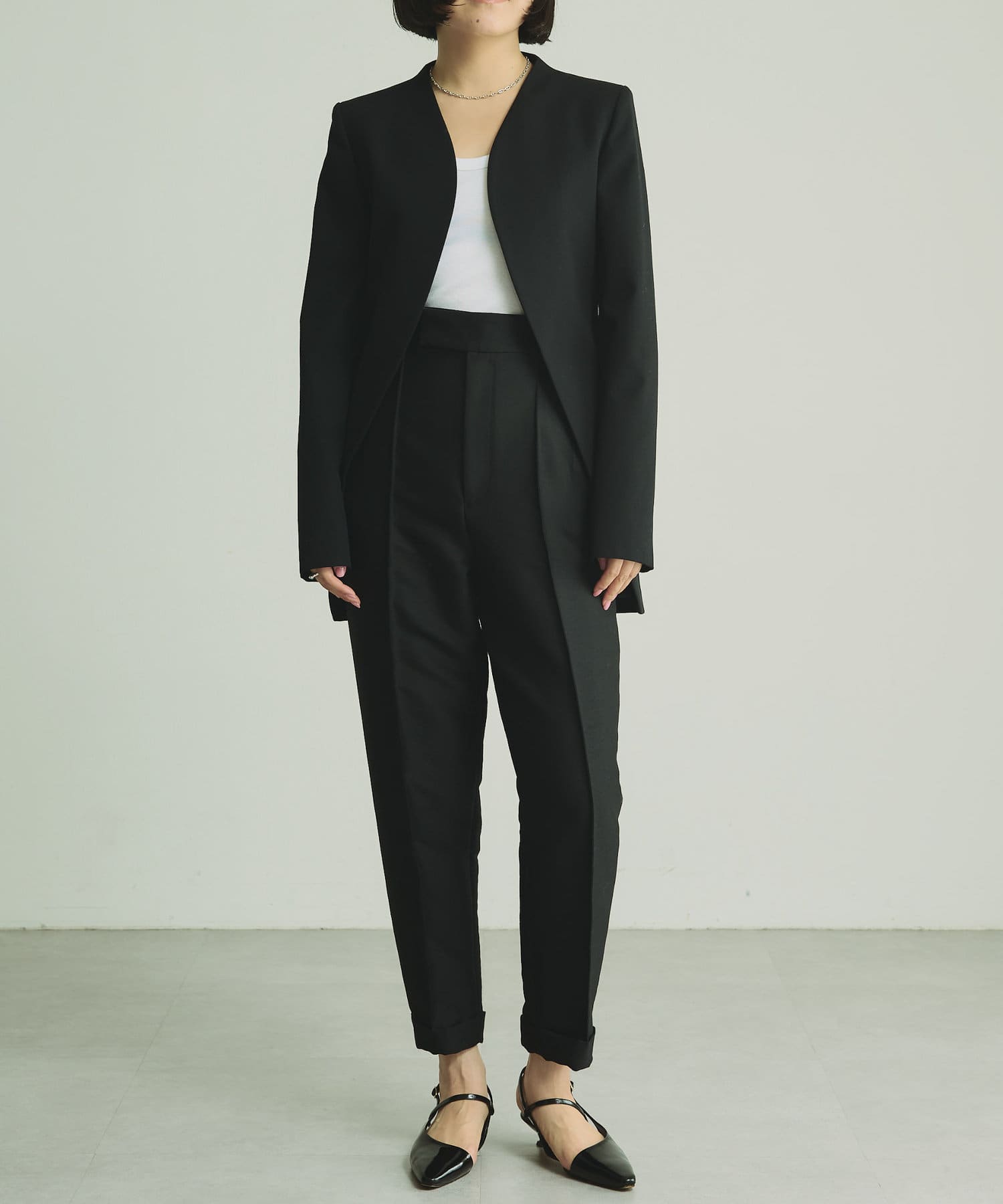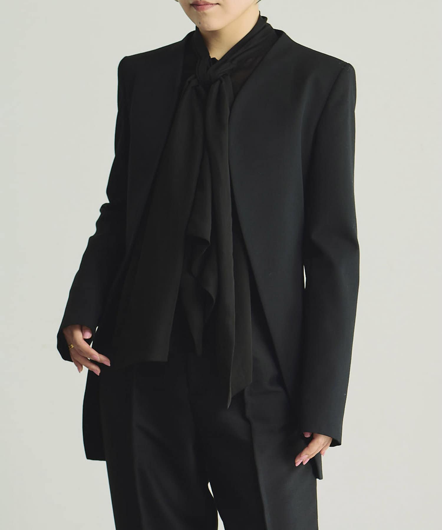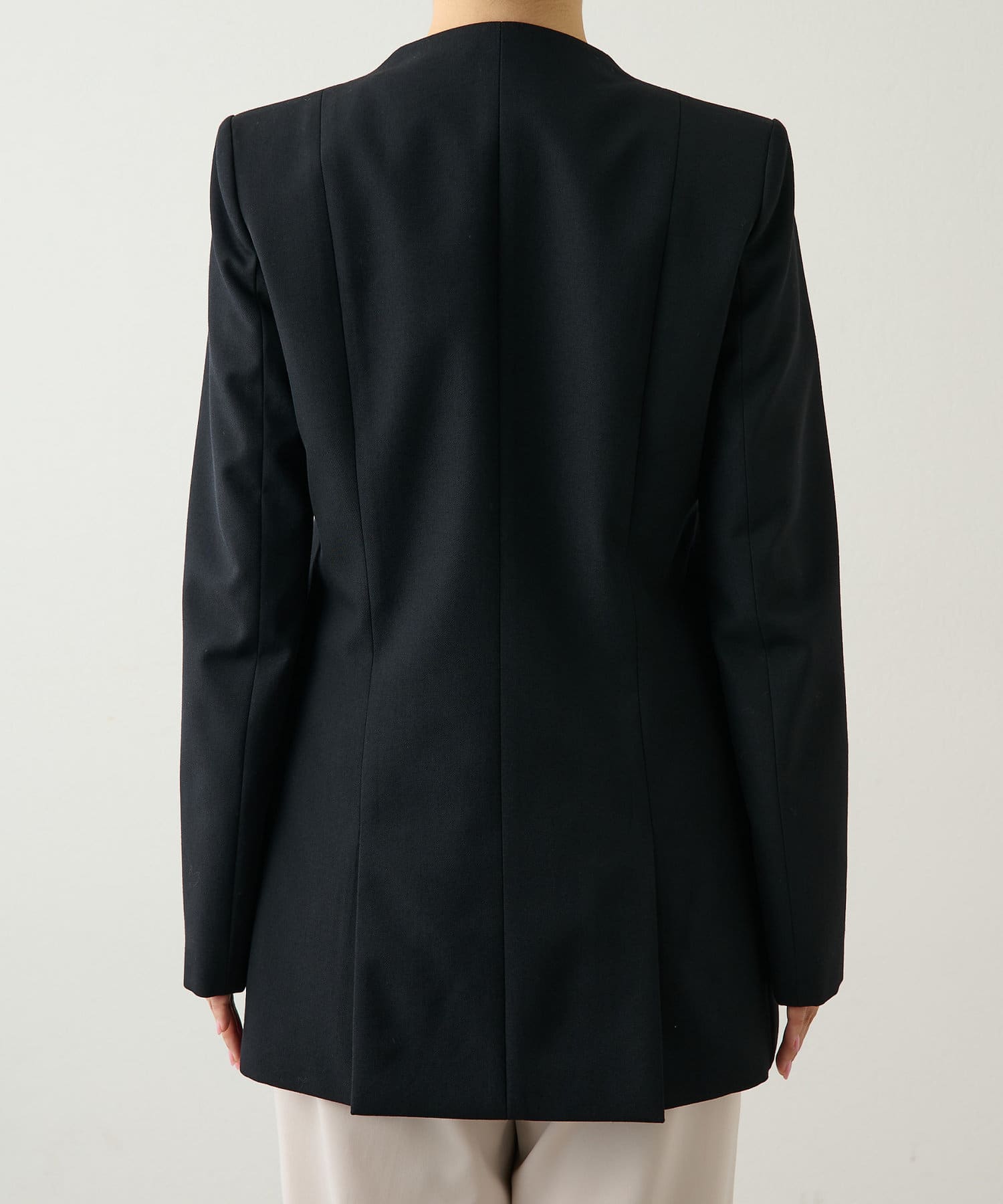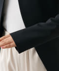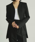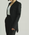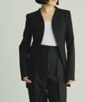■タキシード風のシルエットがマニッシュなカラーレスジャケット。