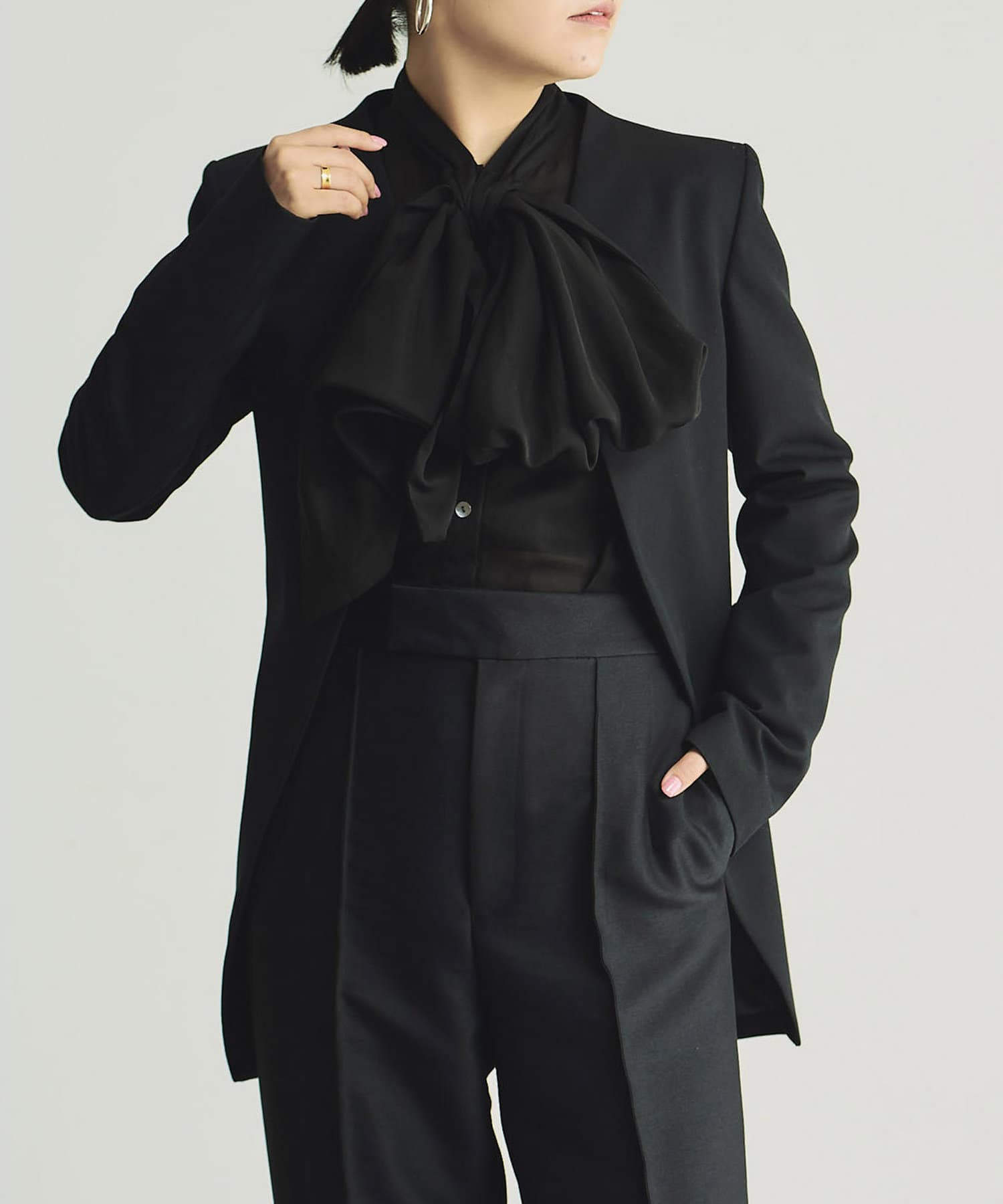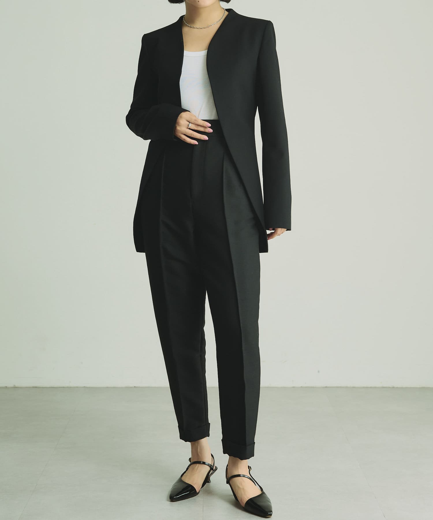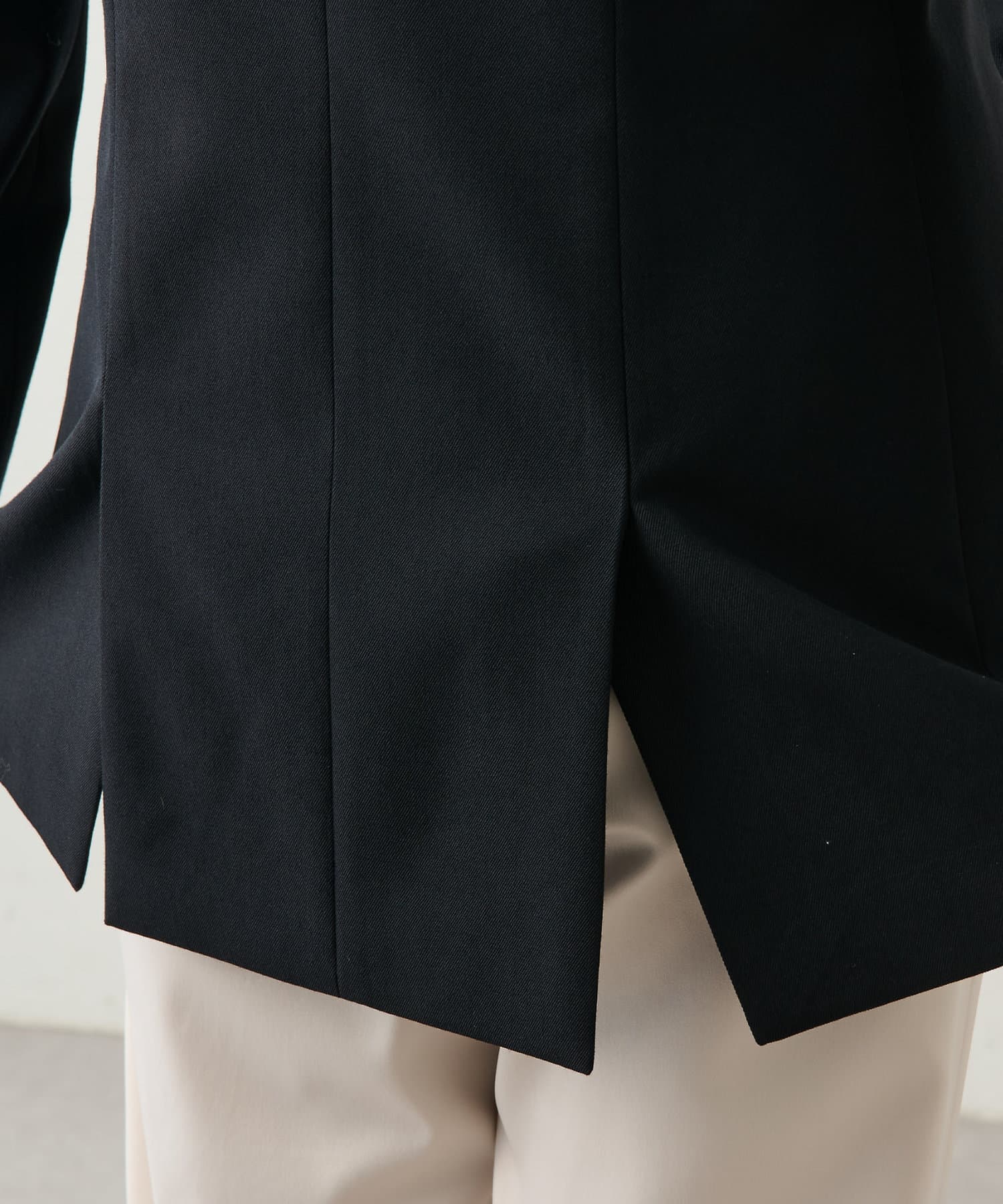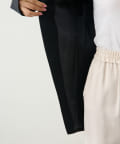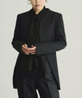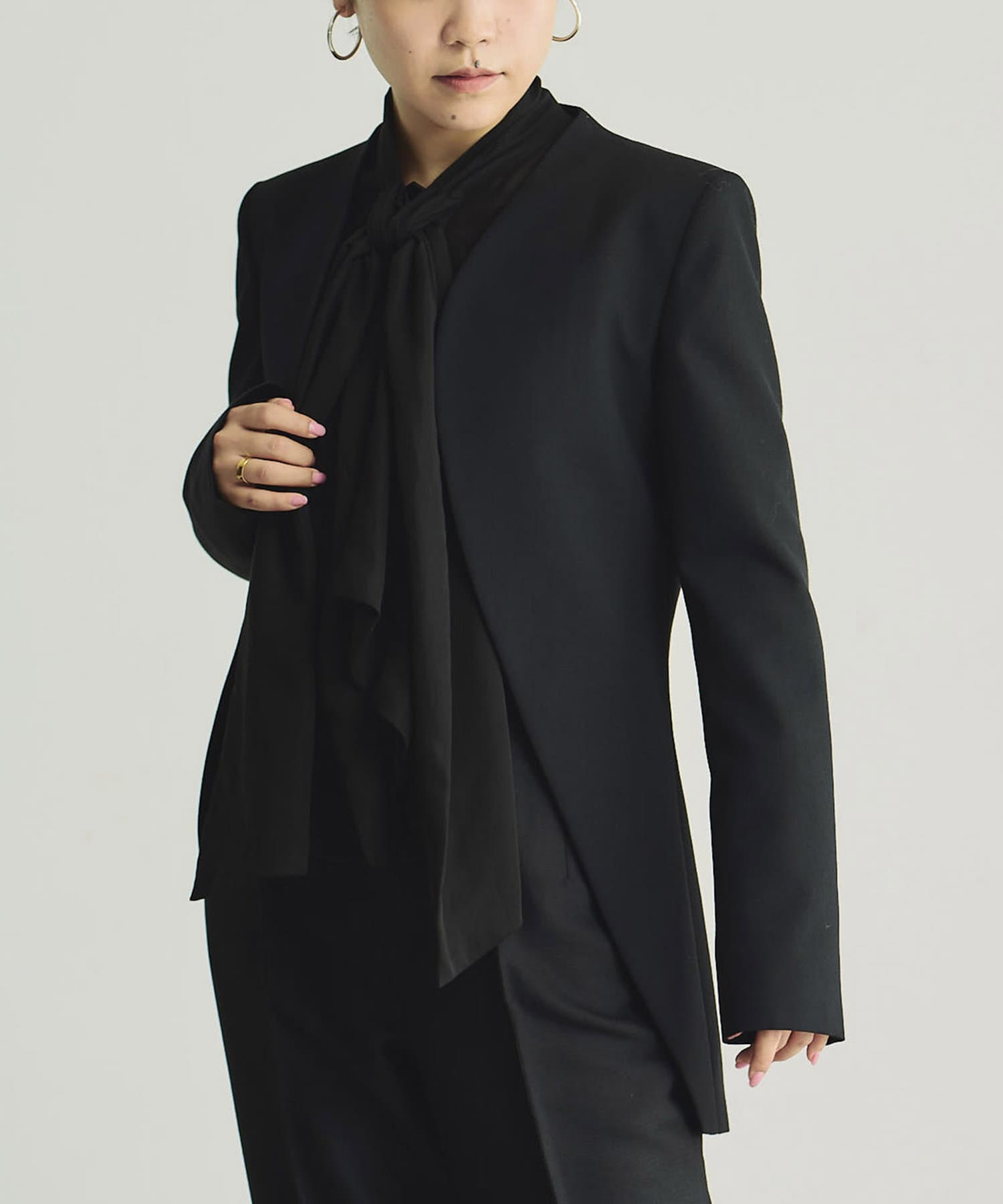 ■タキシード風のシルエットがマニッシュなカラーレスジャケット。