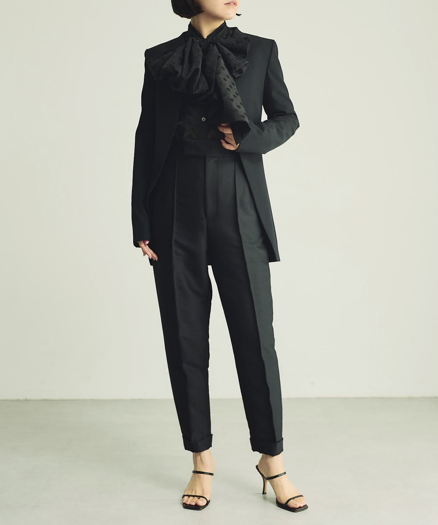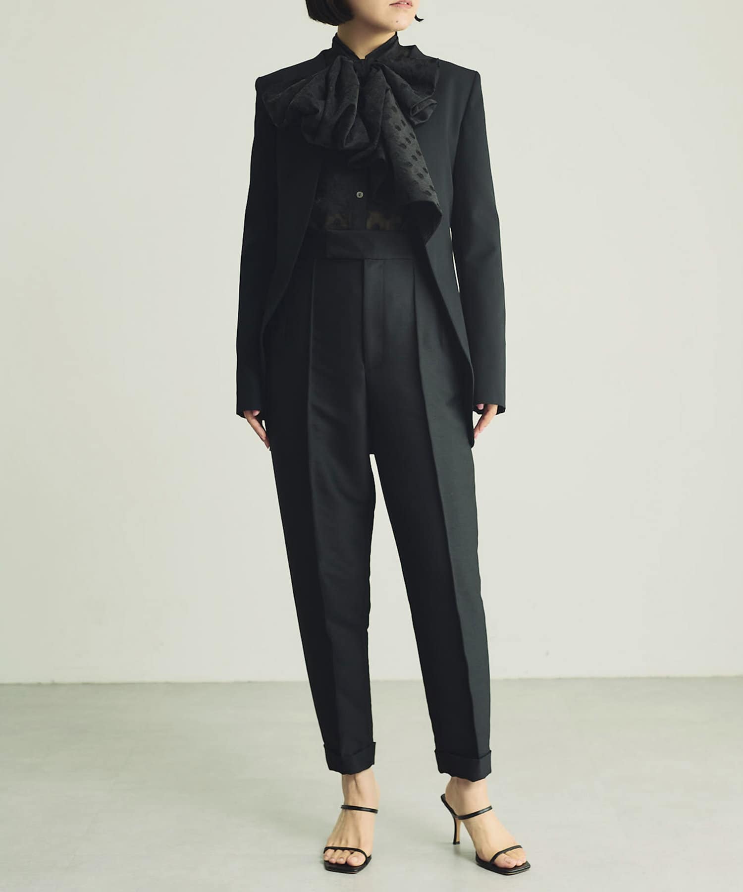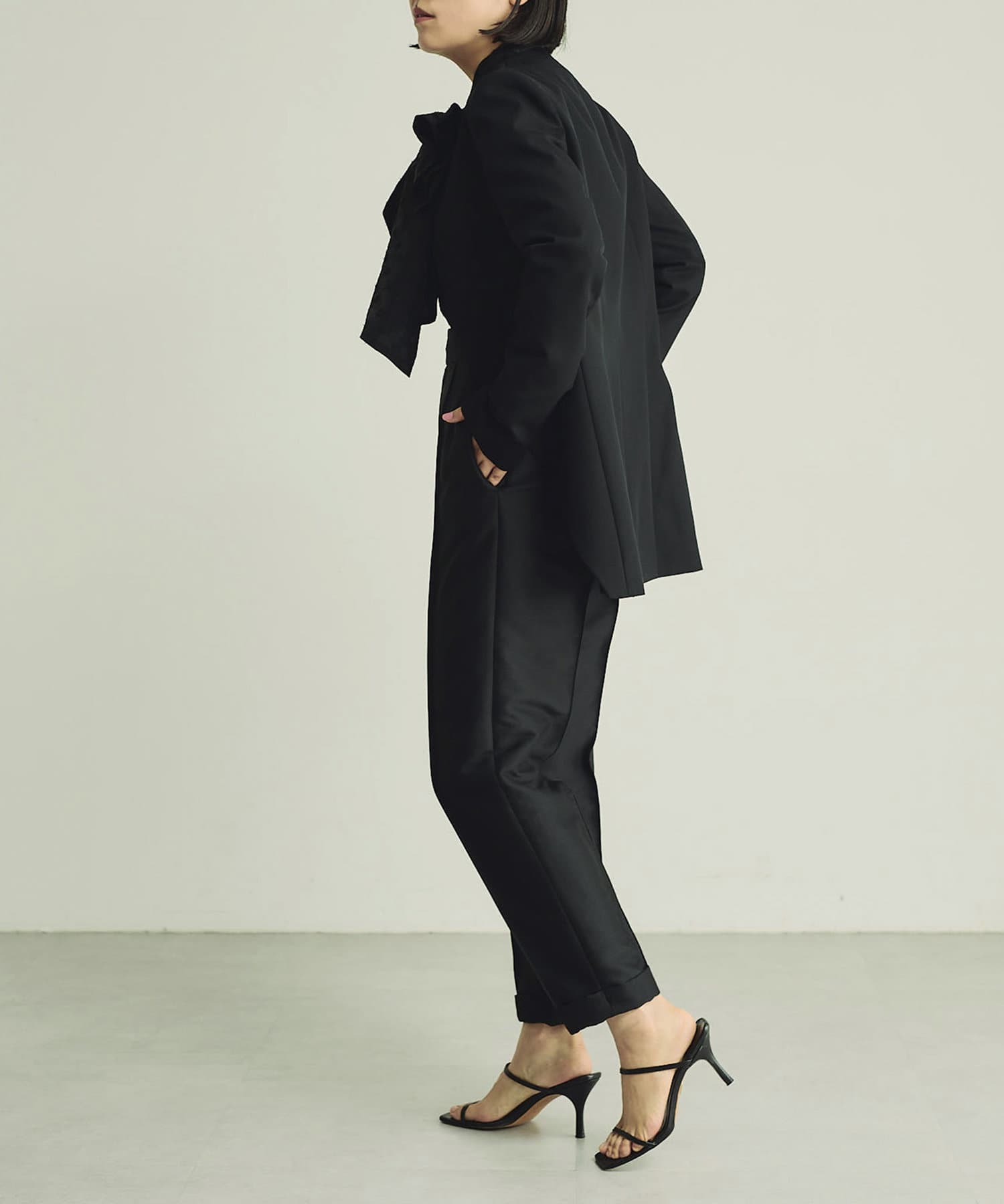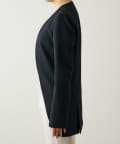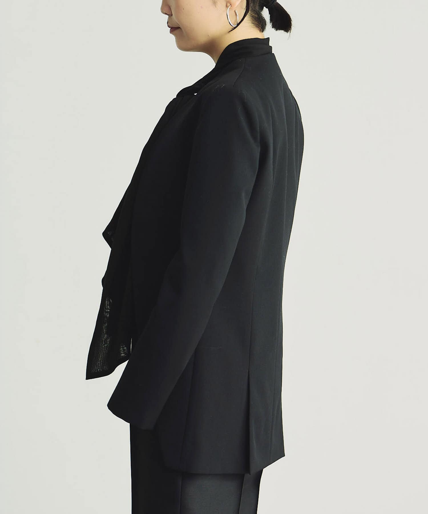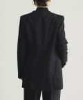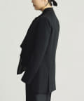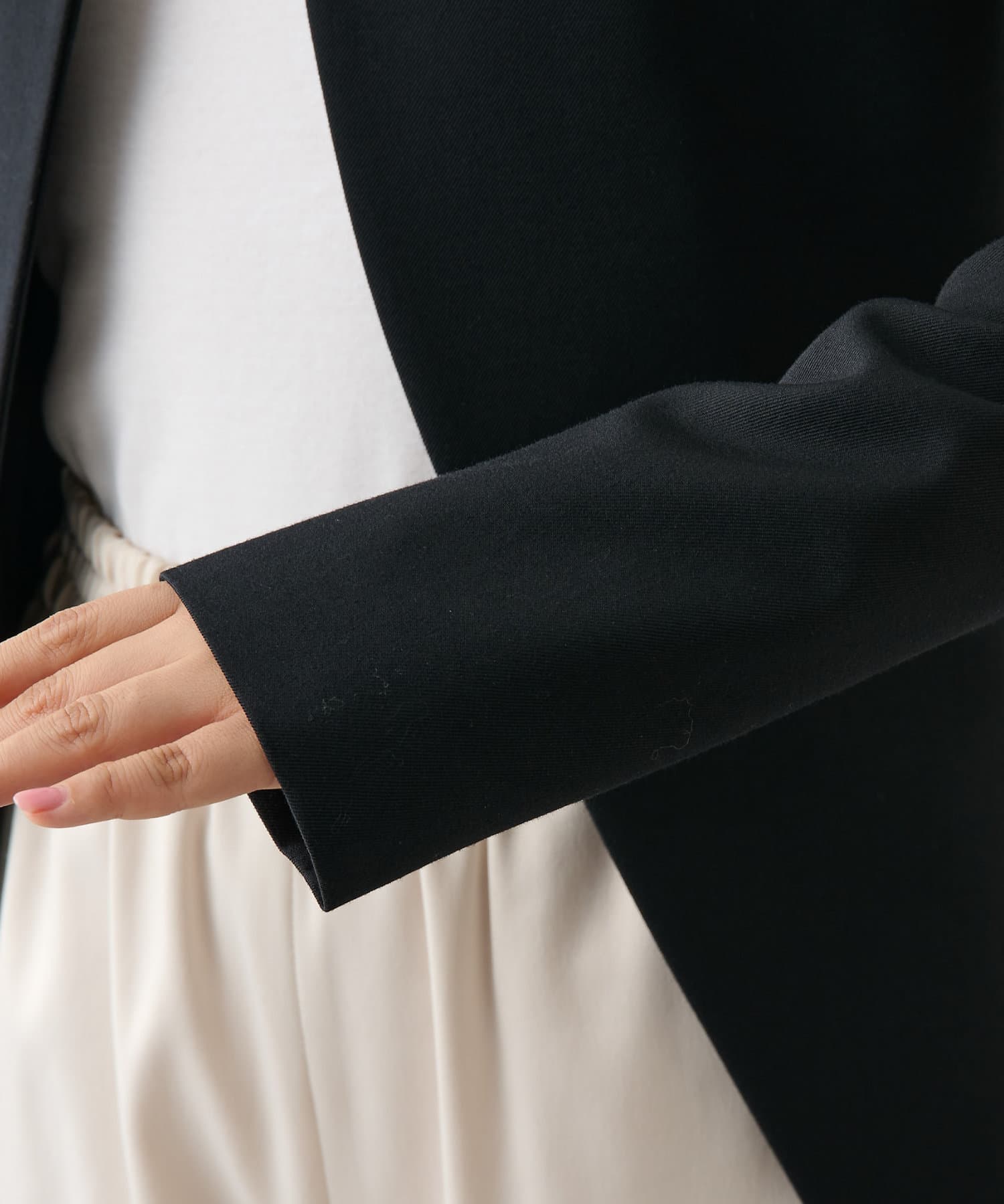■タキシード風のシルエットがマニッシュなカラーレスジャケット。
