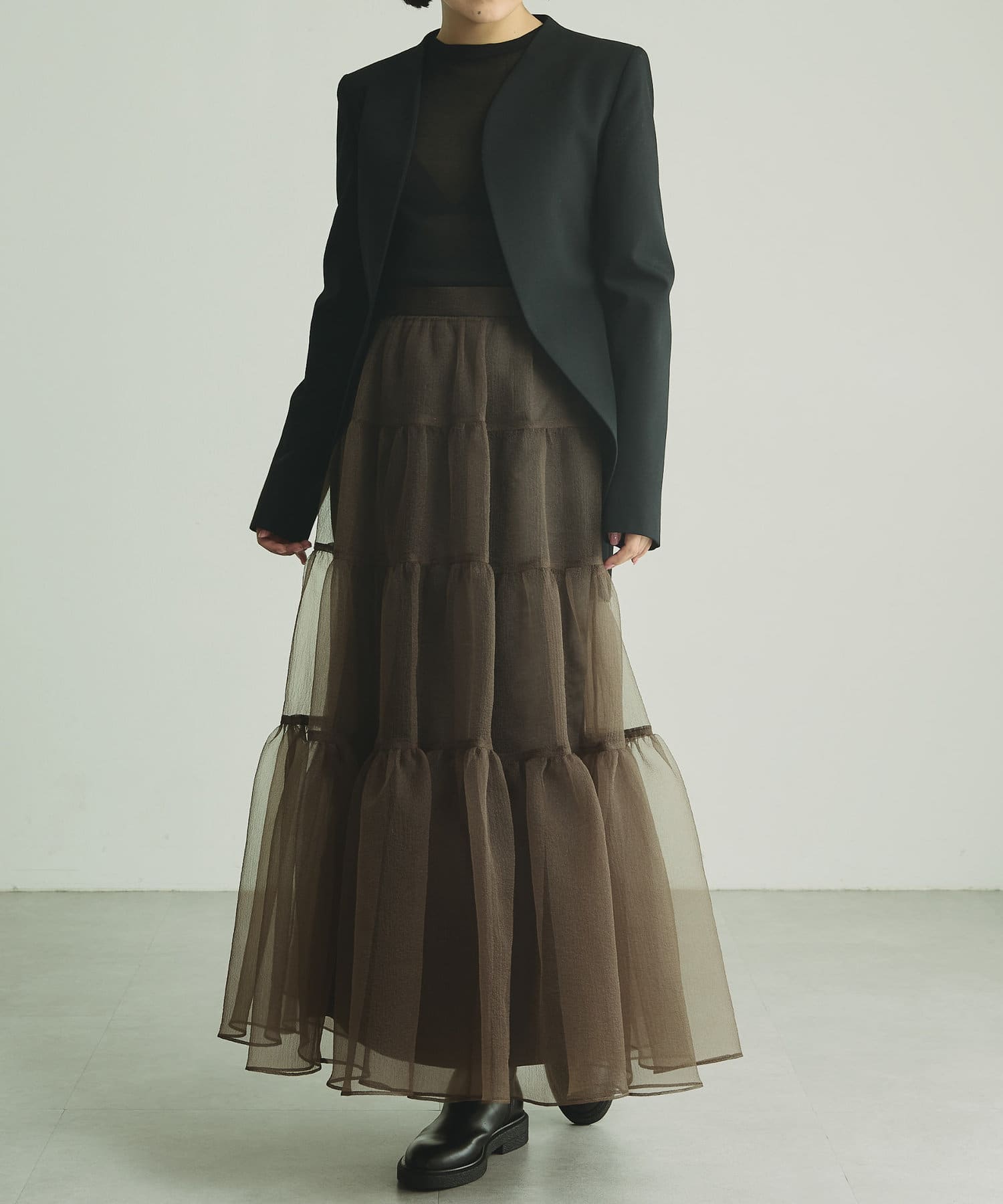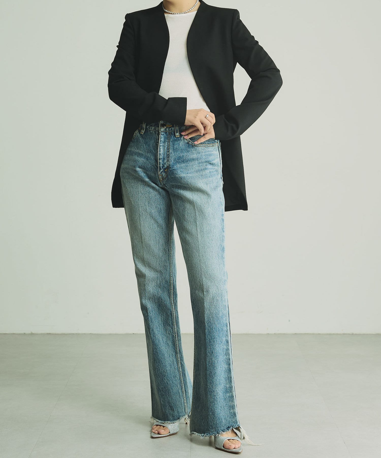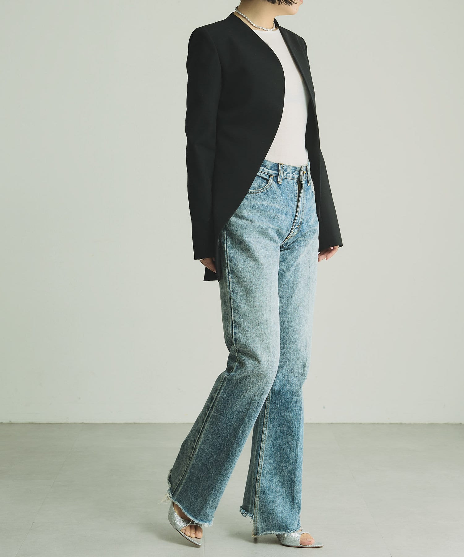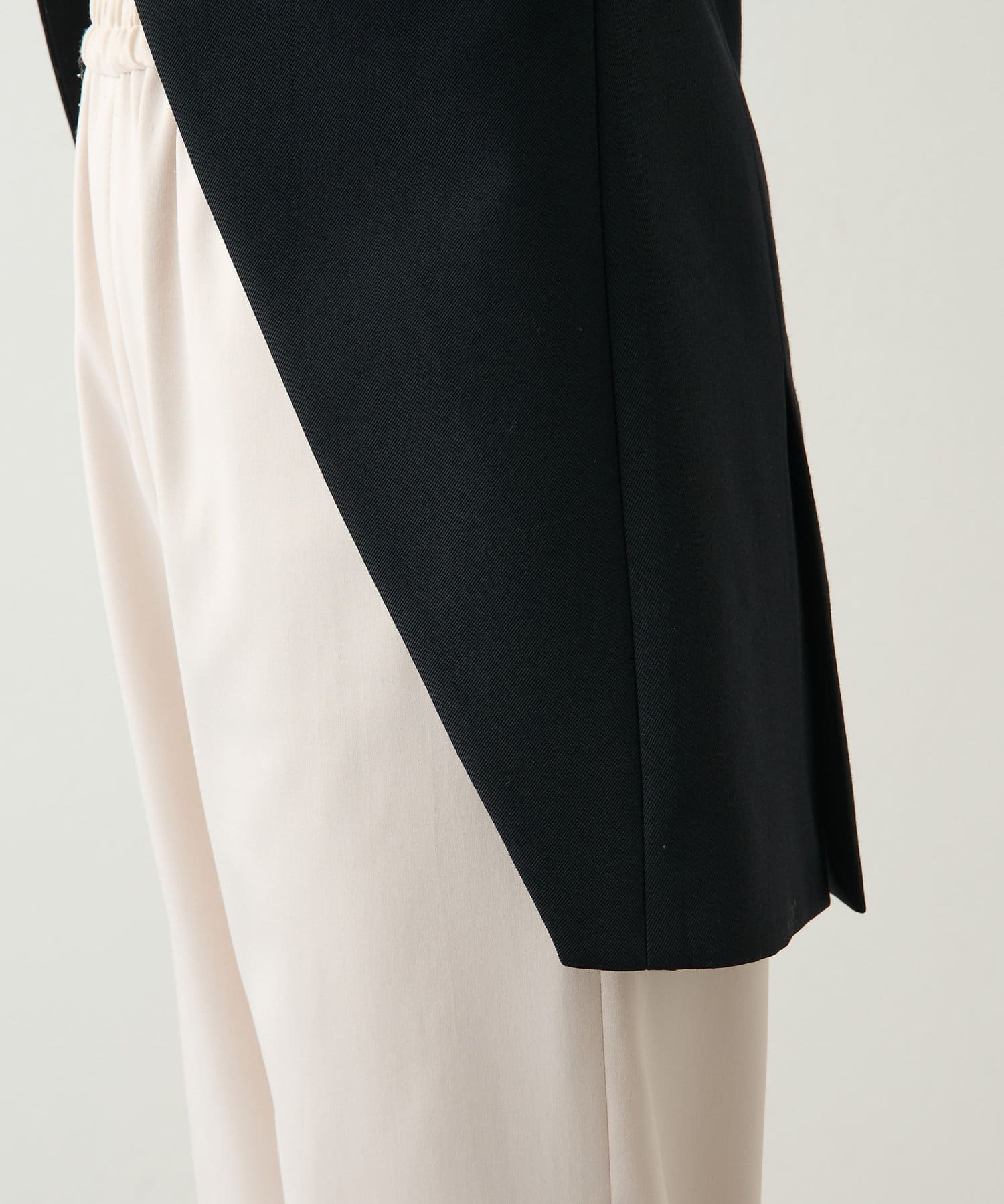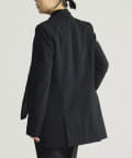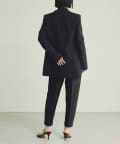 ■タキシード風のシルエットがマニッシュなカラーレスジャケット。