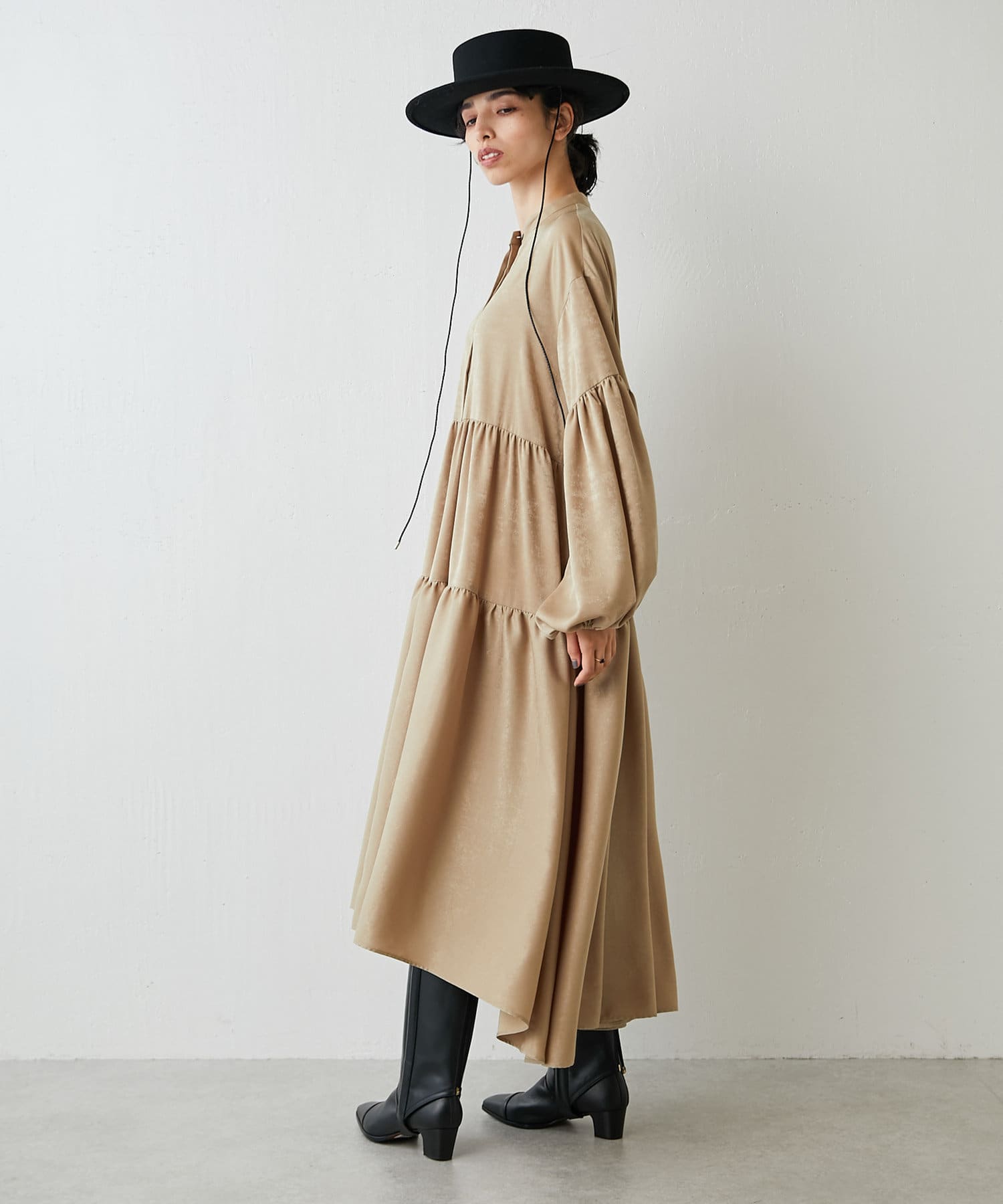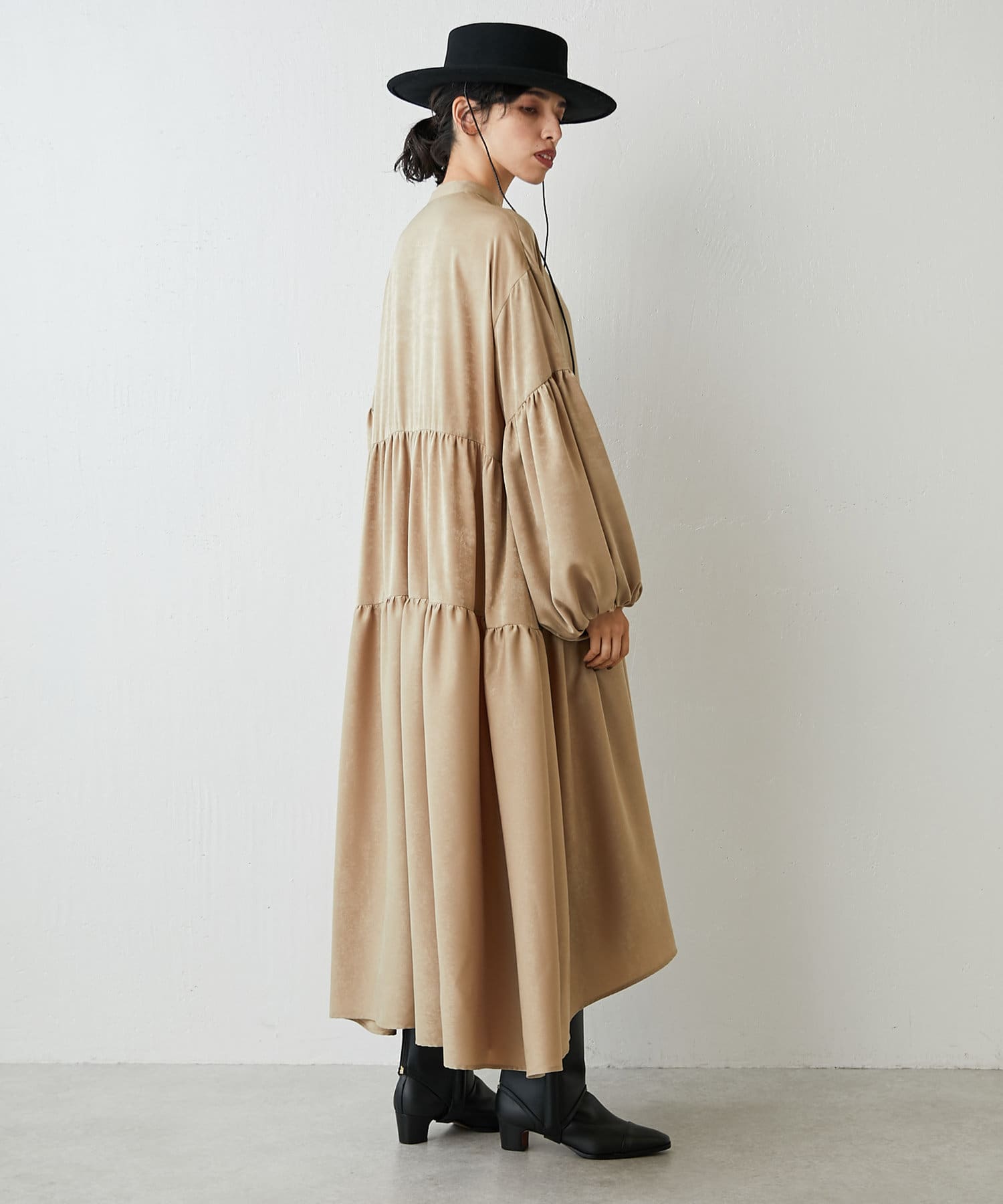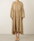 ■袖やスカートのギャザー使いやたっぷりの生地が生むドレープ感が華やかな一着。