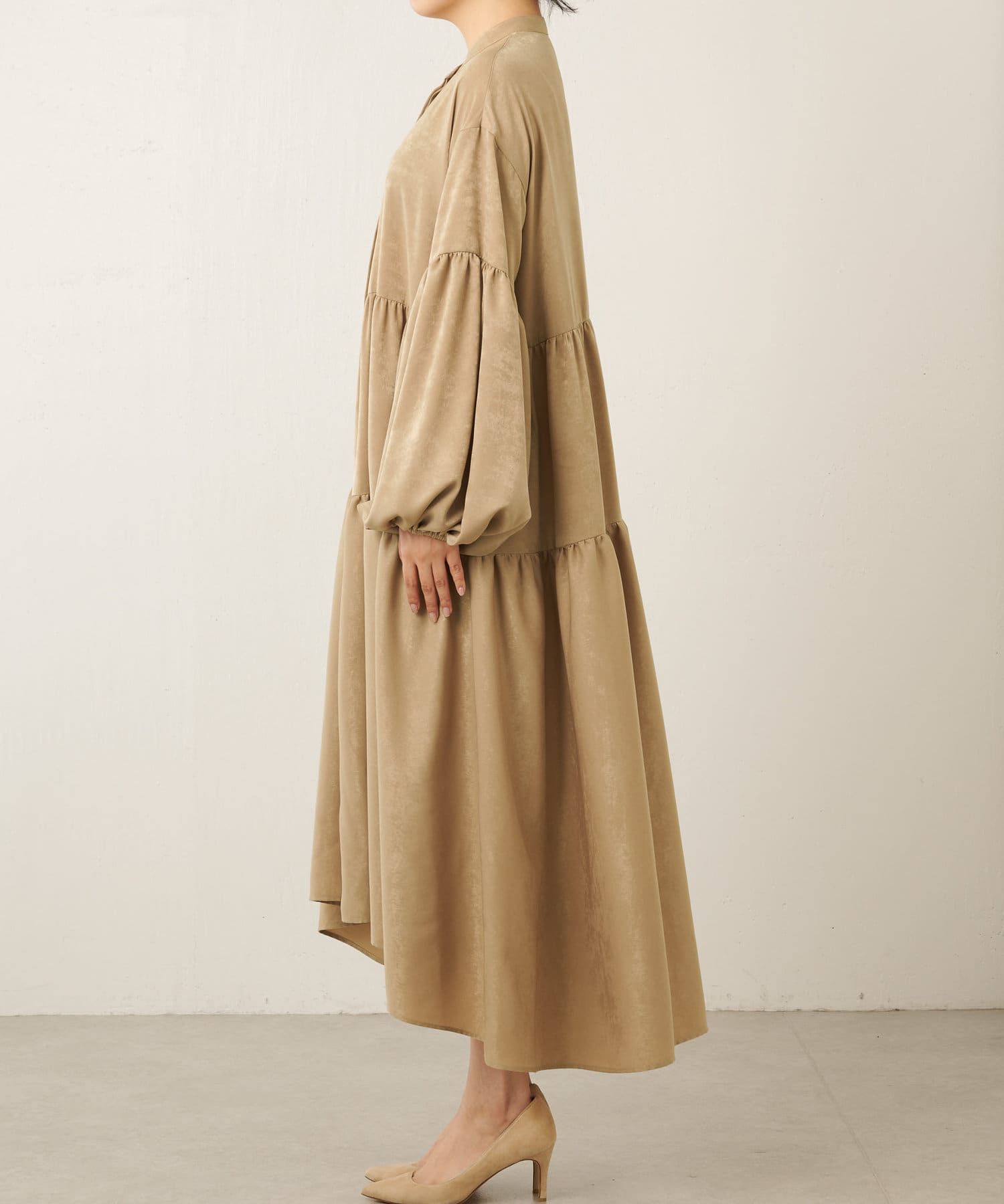女心擽るティアードのデザインが、フェミニンに着られます。前後差のある裾は、歩く度に程よく揺れて、華やかに魅せてくれます。