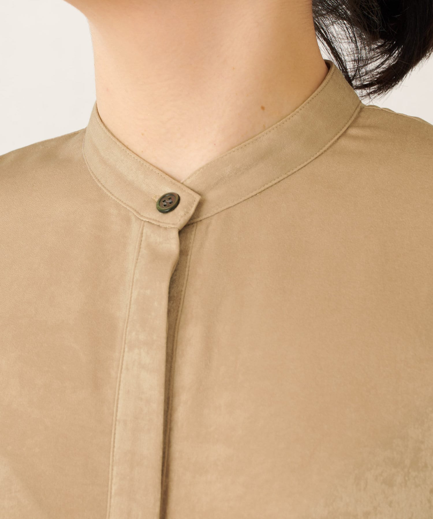 ■顔回りをすっきりと見せてくれるバンドカラーで甘さを抑えた印象に。