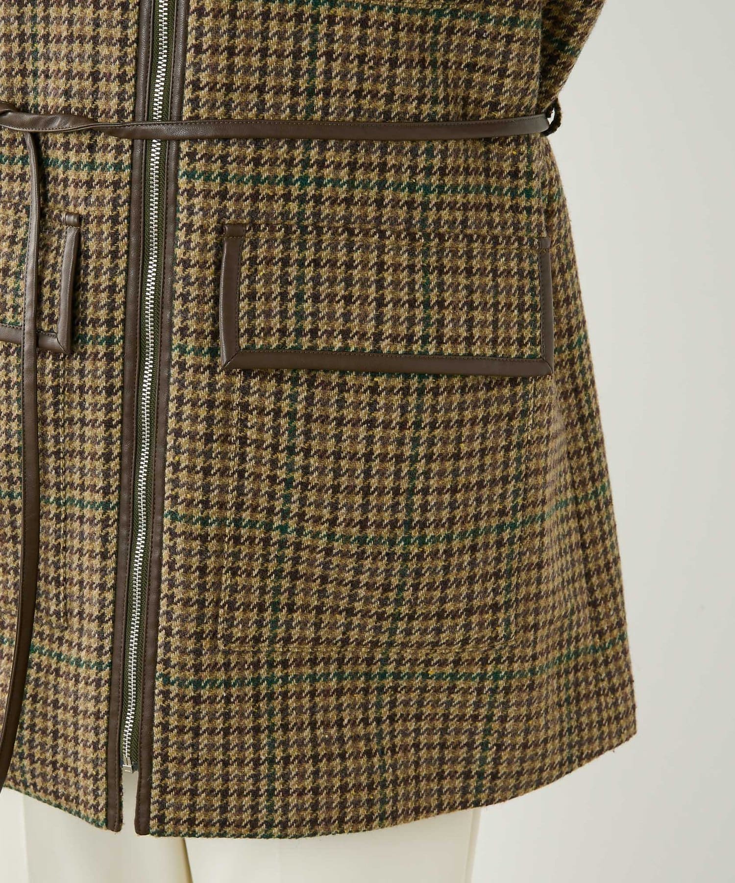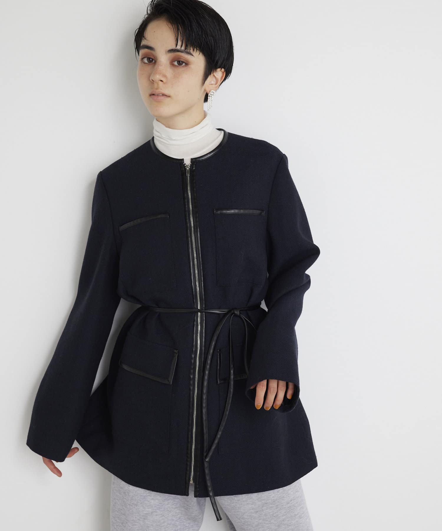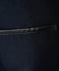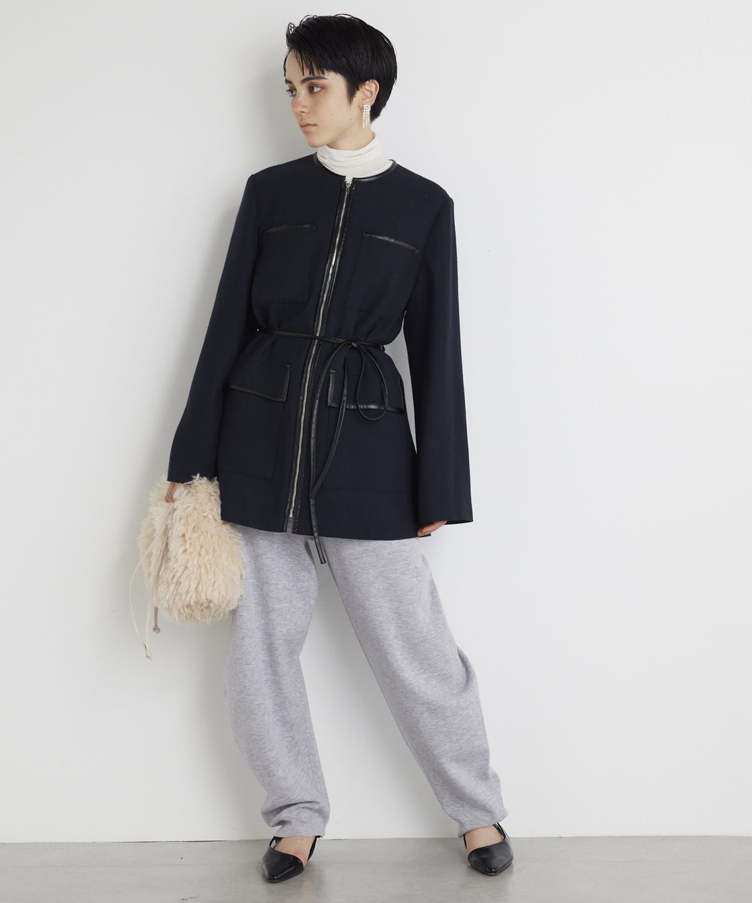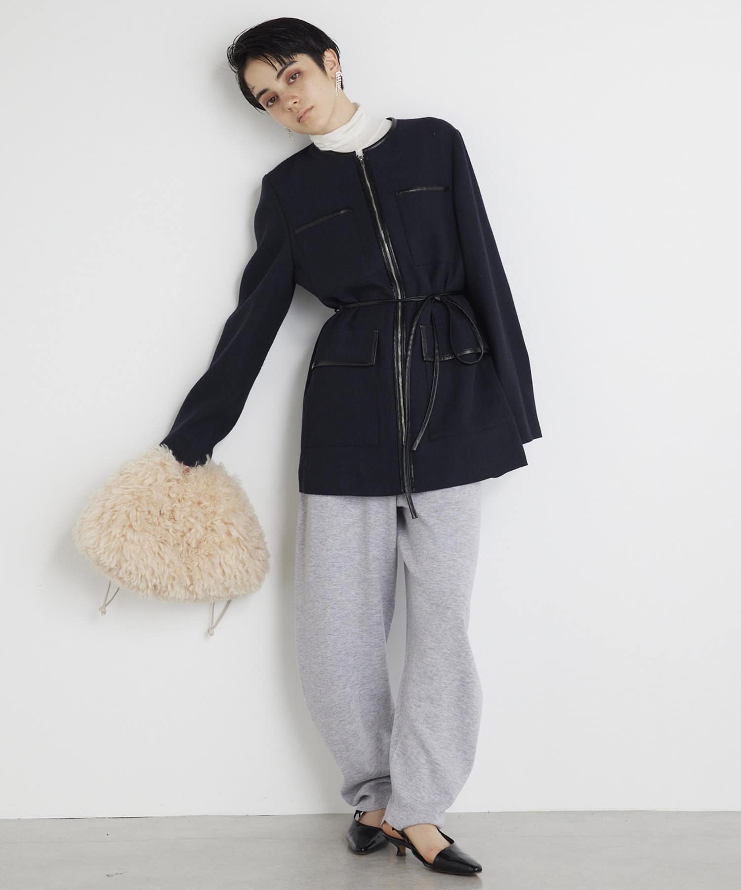 ■ポケットや前開き部分に入ったフェイクレザーのパイピングがアクセントをプラス。