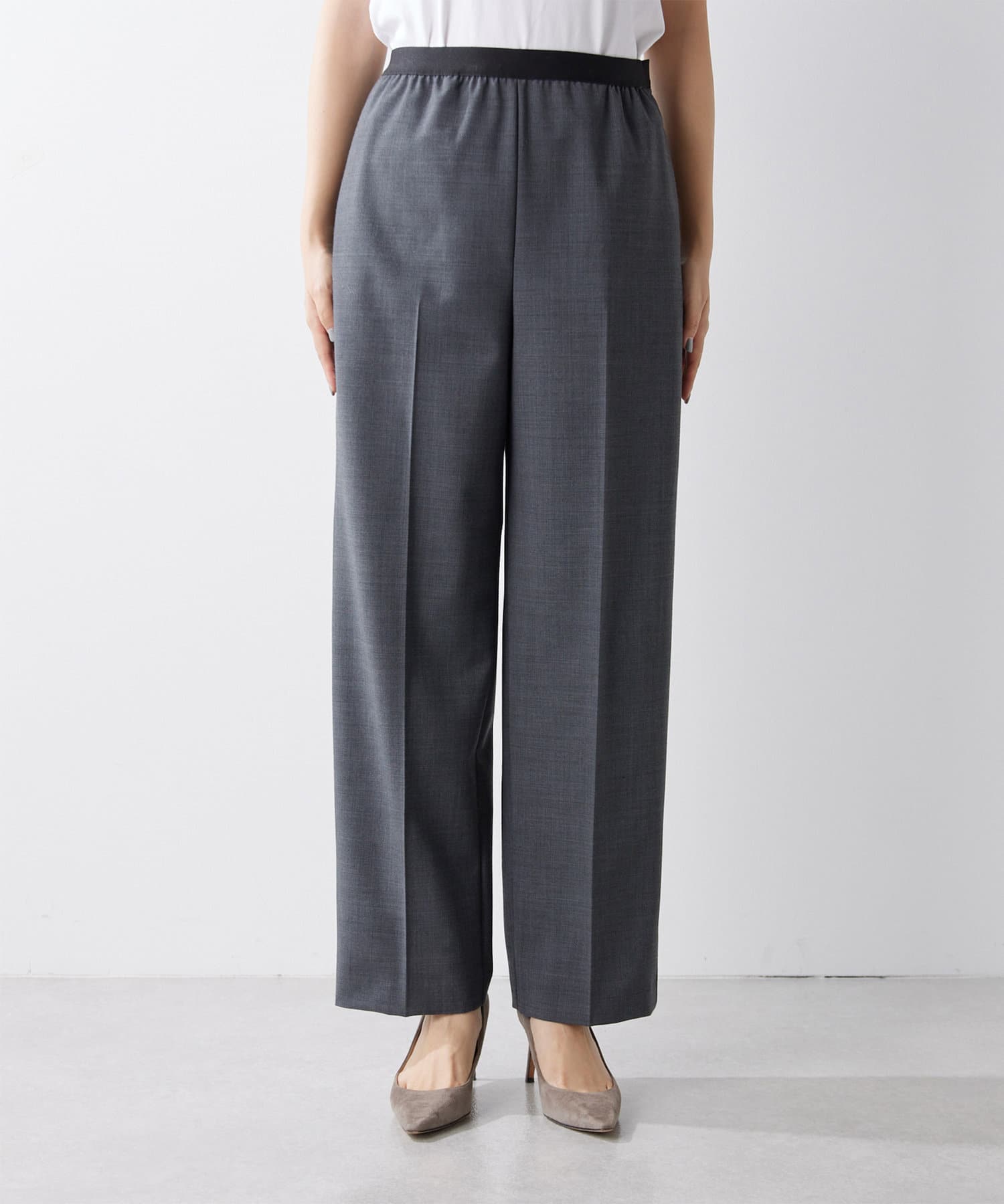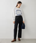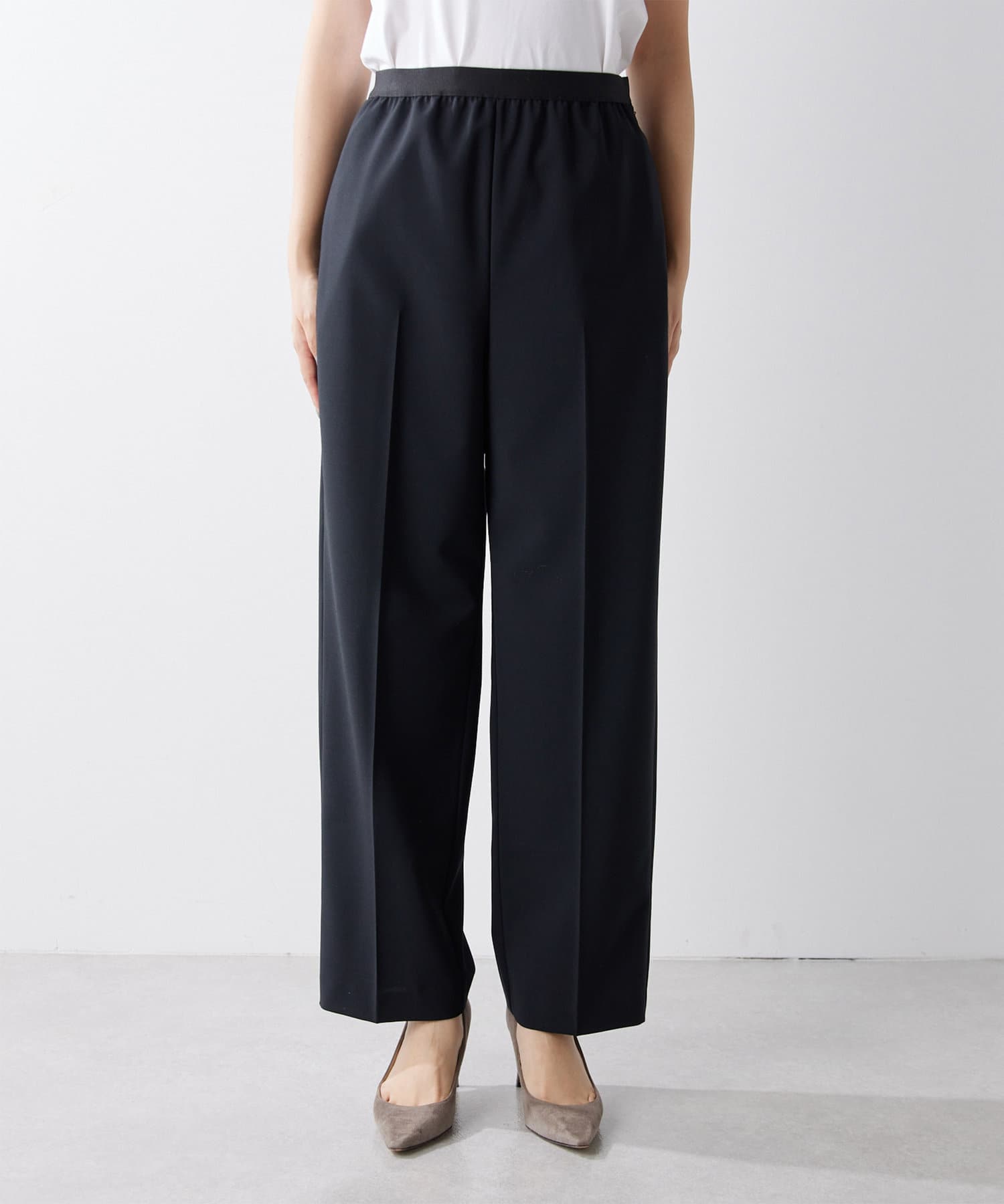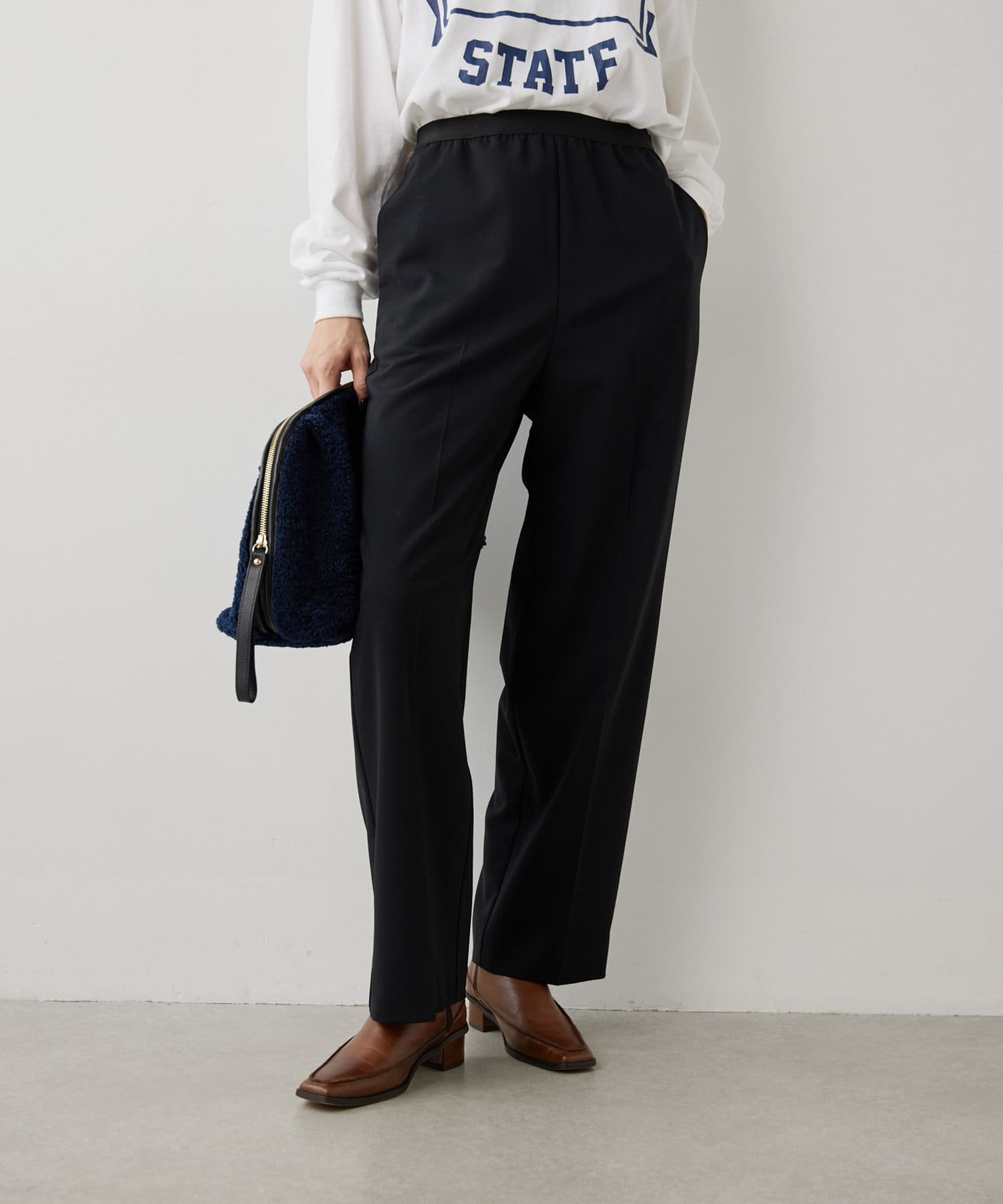 ■微光沢のウエストゴムがアクセントになったストレートパンツ。