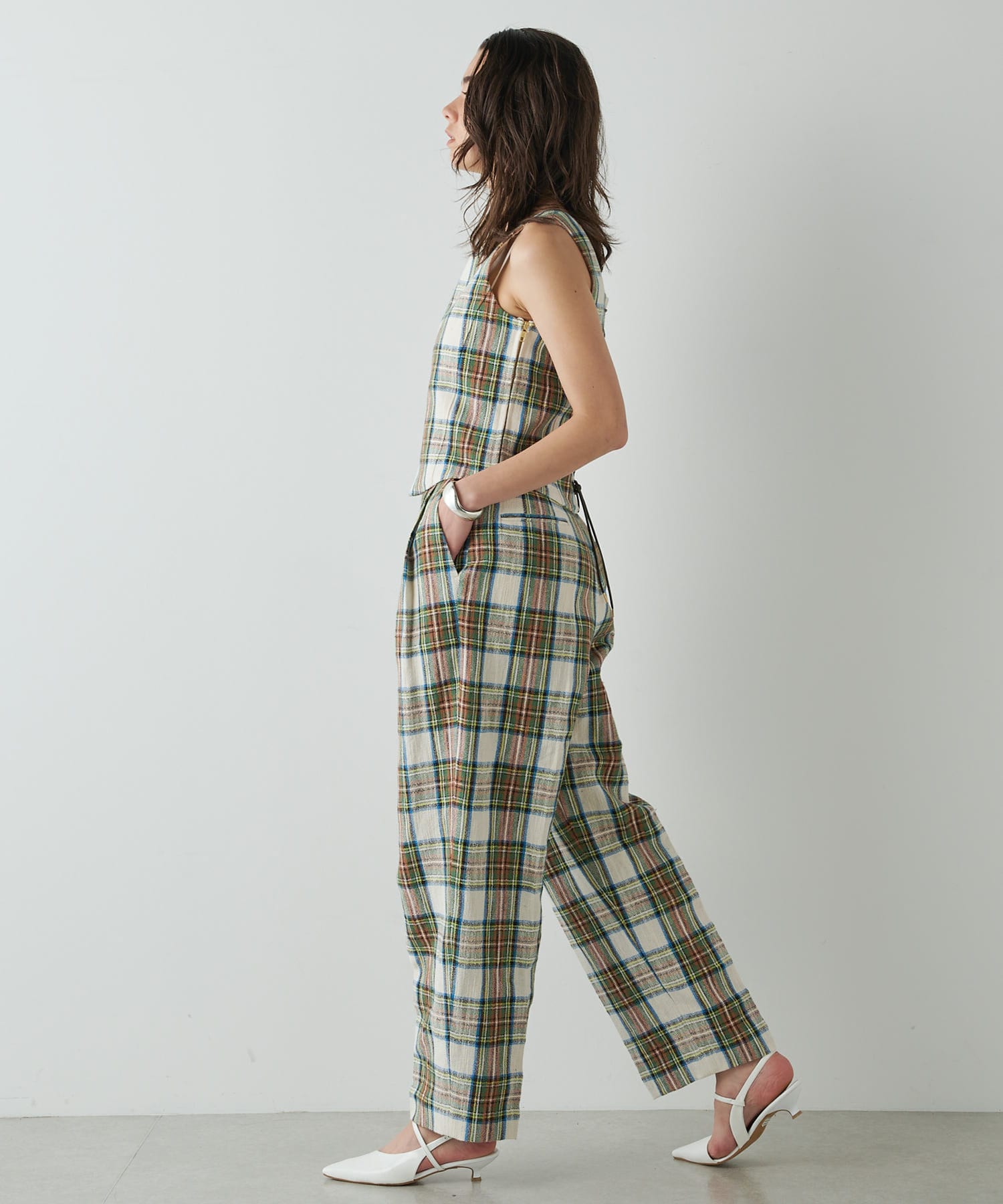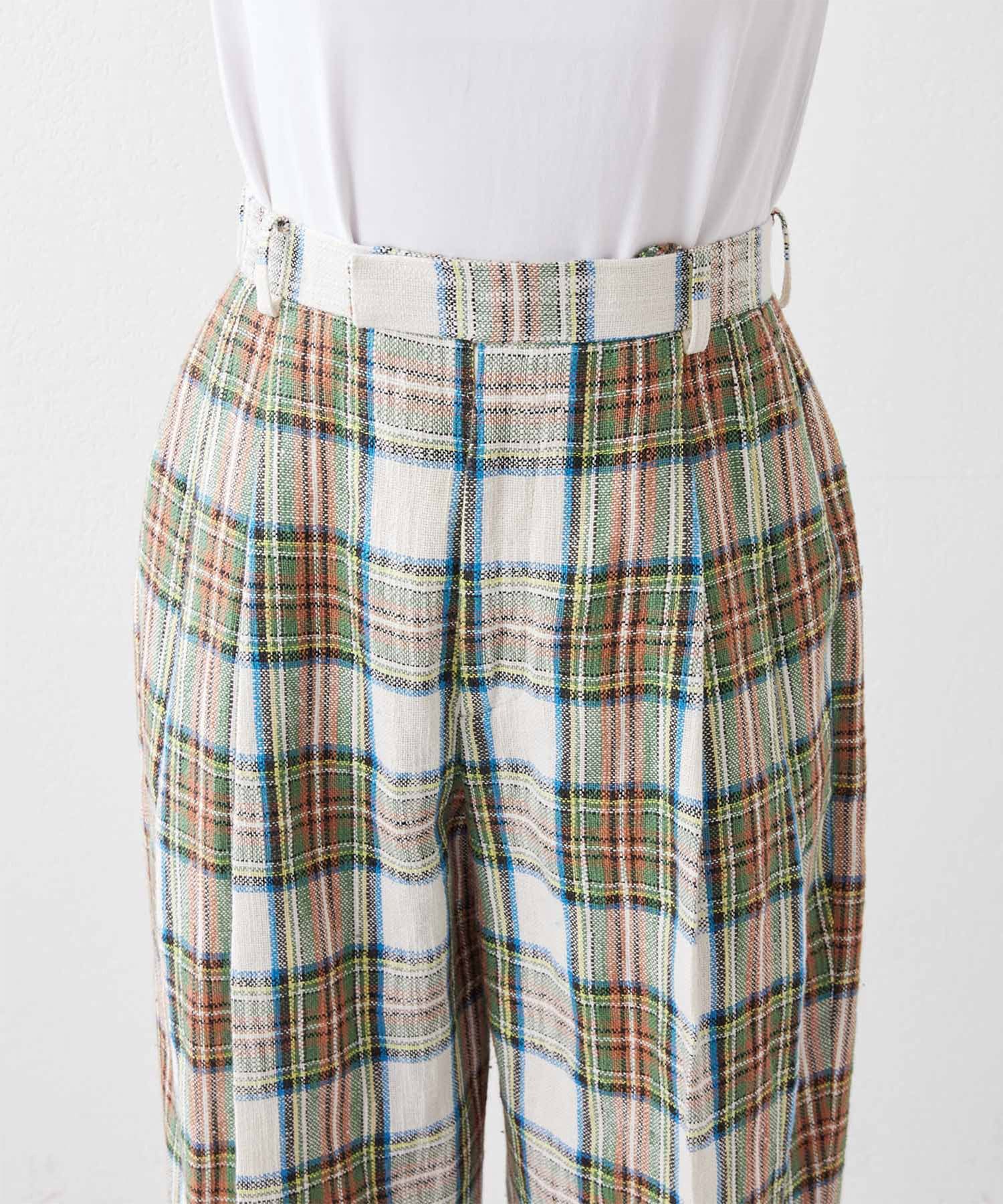チェックパンツは綿と麻素材ですが、薄手ではなく程よい肉感があり、しっかりとした生地です。このドライな雰囲気が、トラッドな印象になり過ぎず、普段使いしやすいと思います◎165㎝の私の身長でちょうど床に付くか付かないかの、ジャストな丈感です。