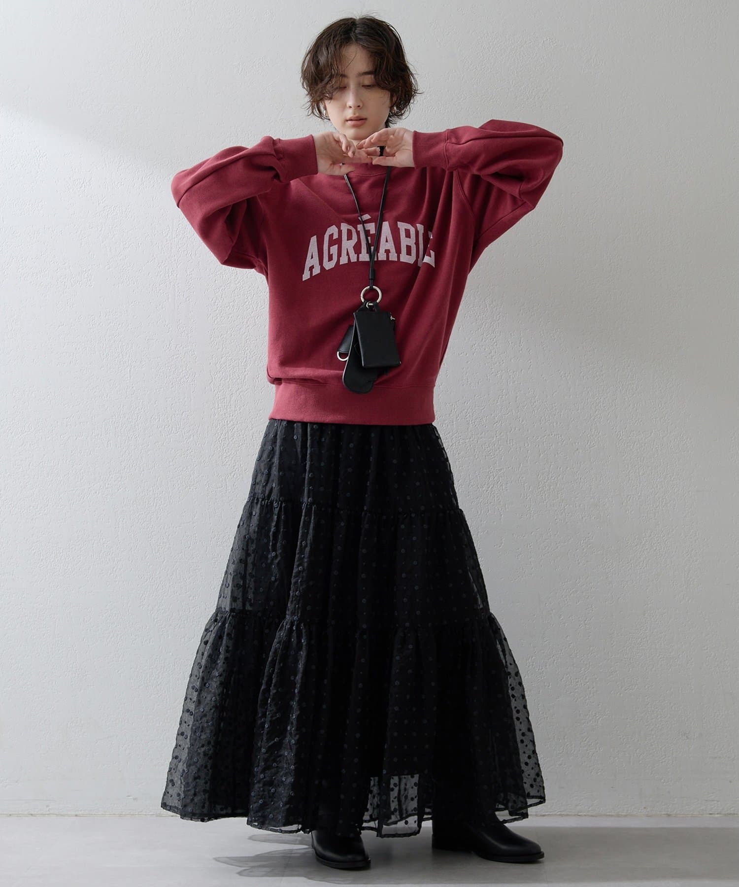■カジュアルなパンツや女性らしいスカート、きれいめなパンツなど、ボトムを選ばず幅広いコーディネートを楽しめるアイテム。