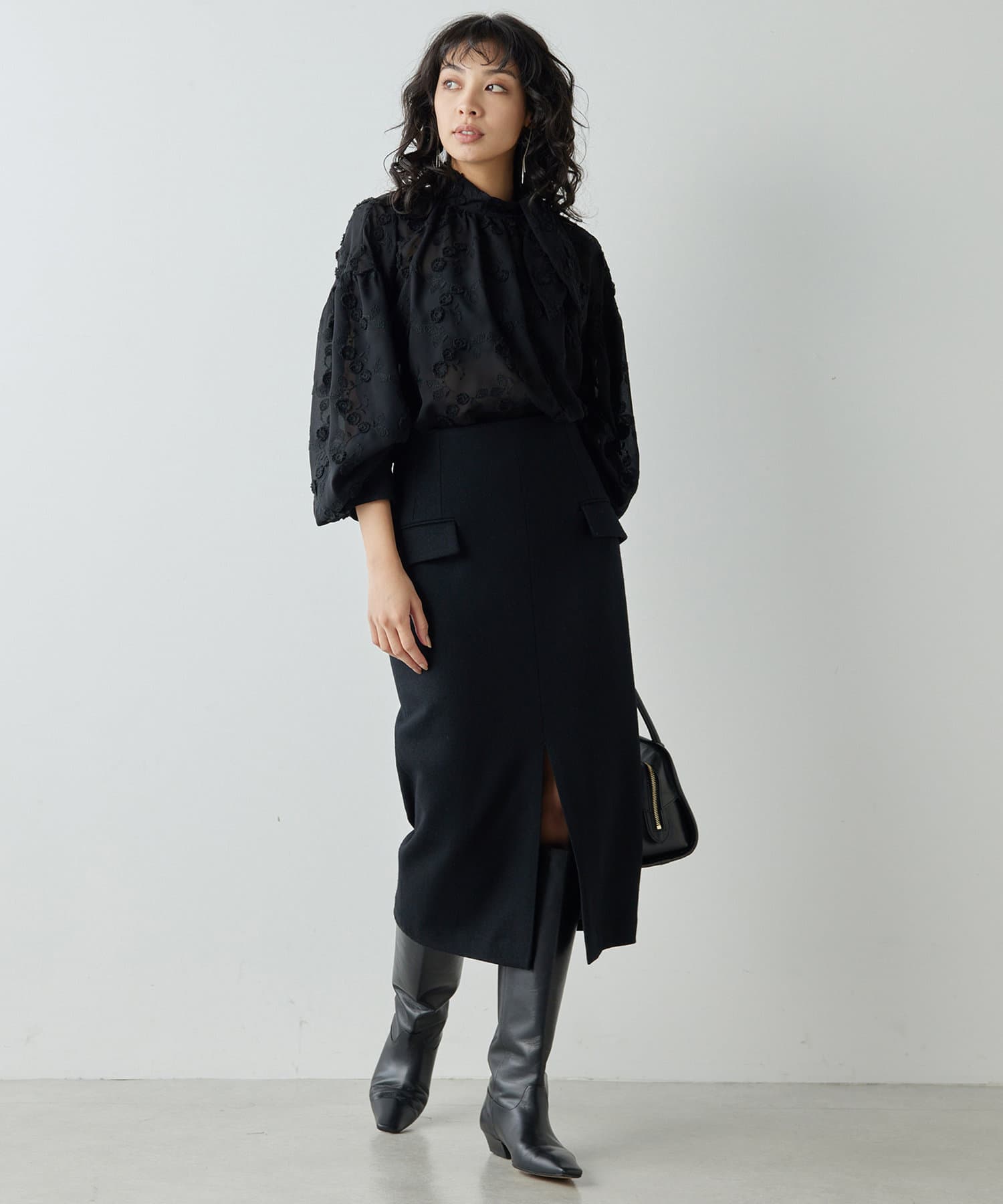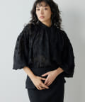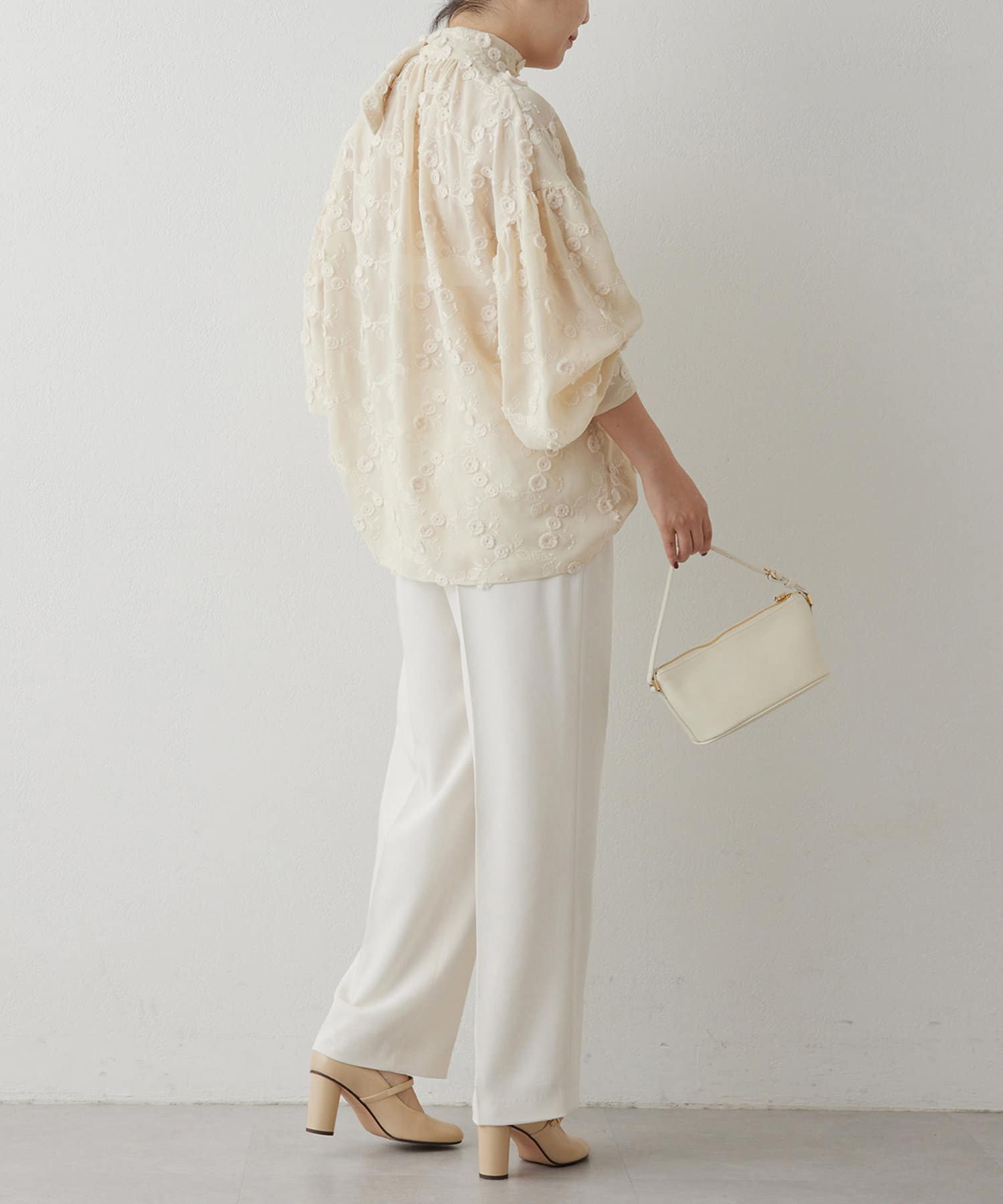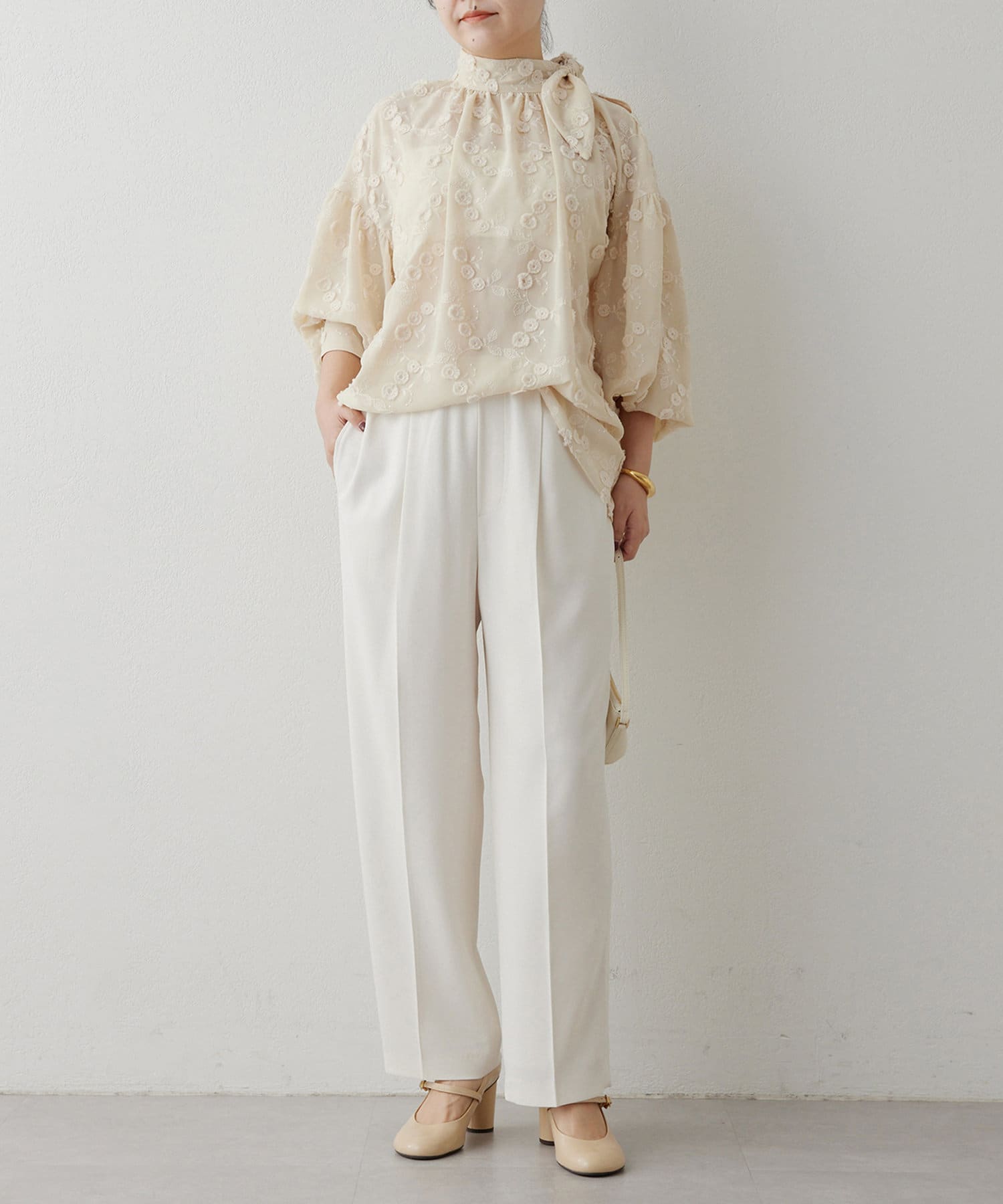 ■上品な梨地素材に刺繍を施した着映え感のあるボウタイブラウス。