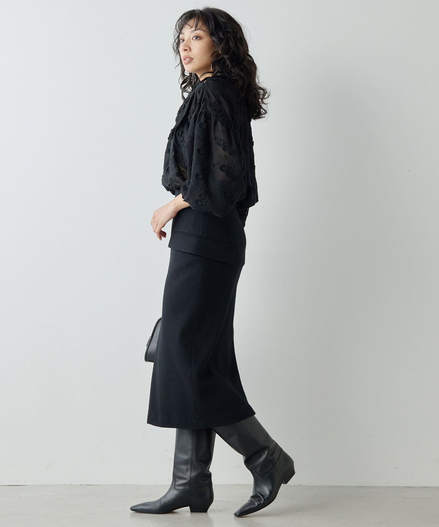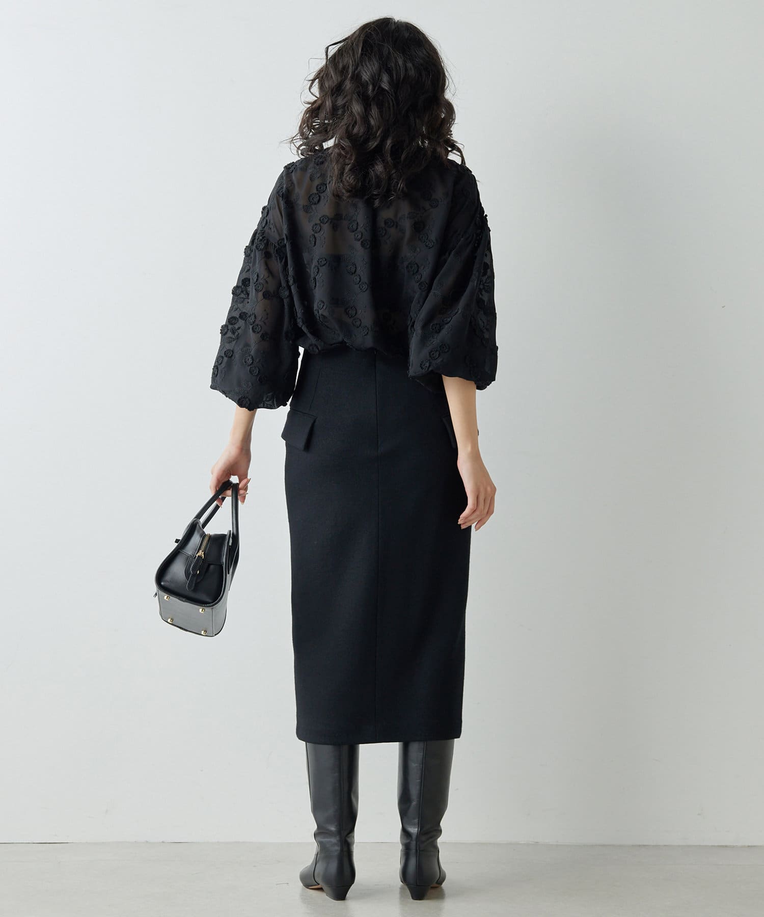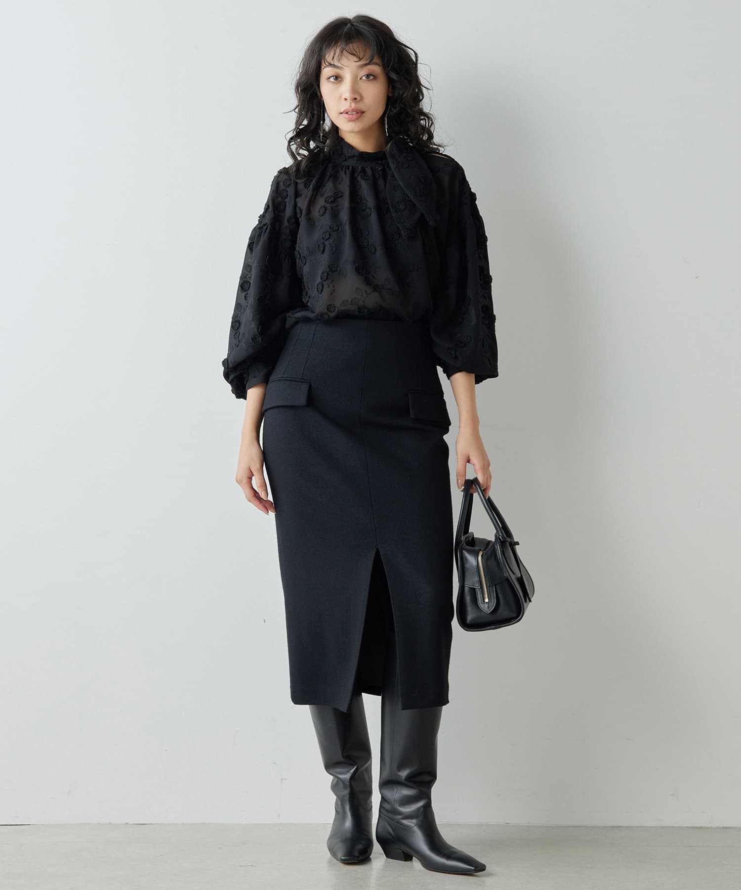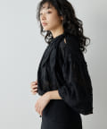 ■上品な梨地素材に刺繍を施した着映え感のあるボウタイブラウス。