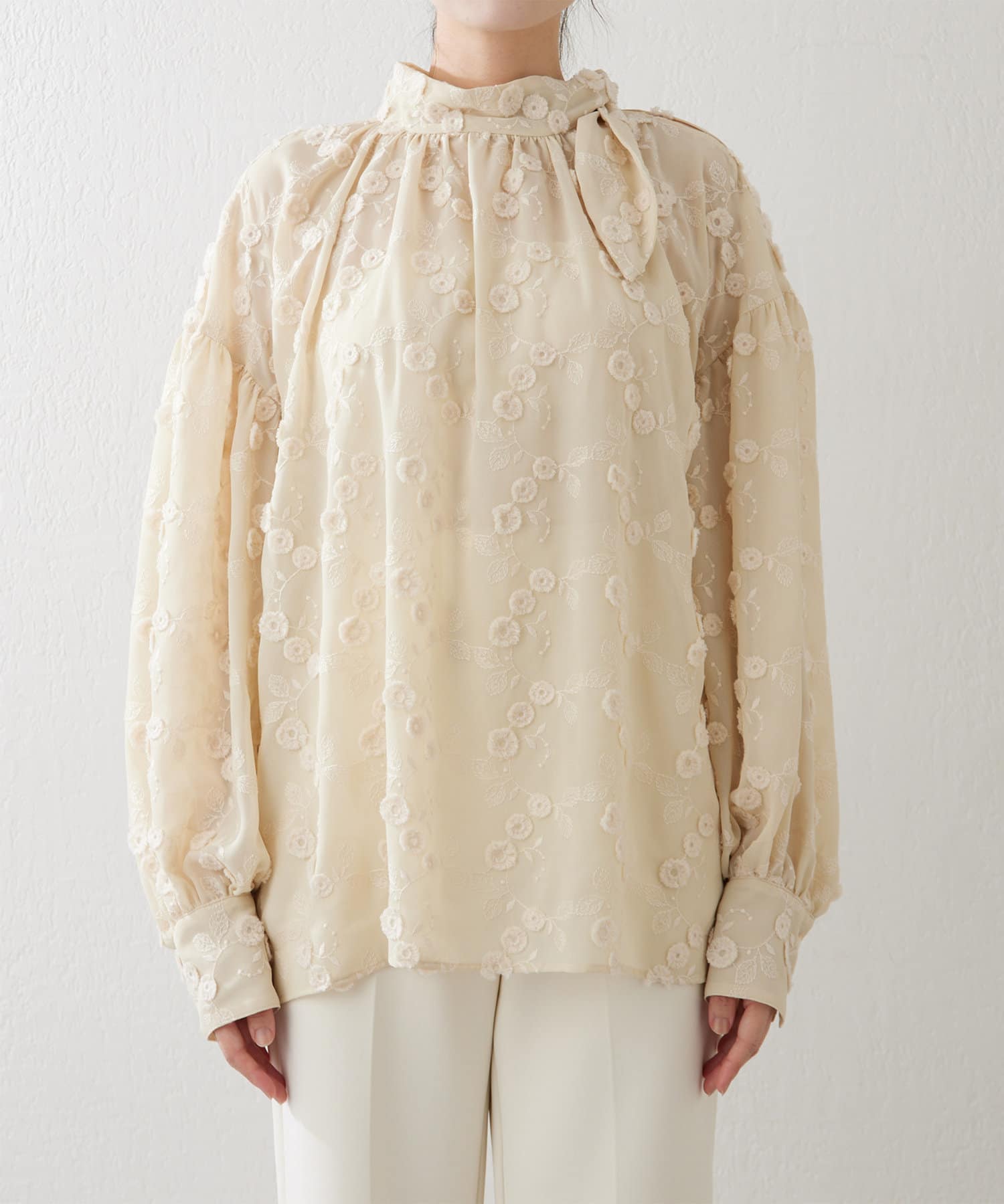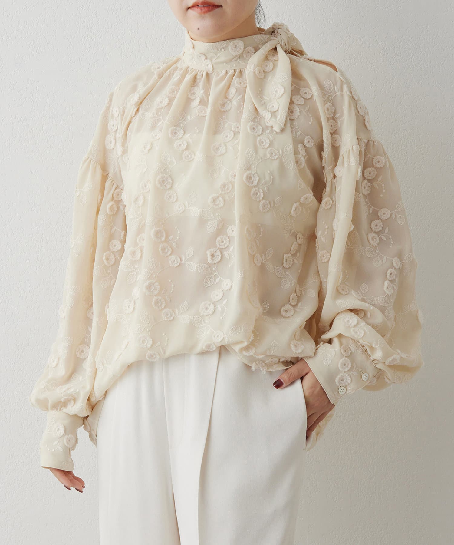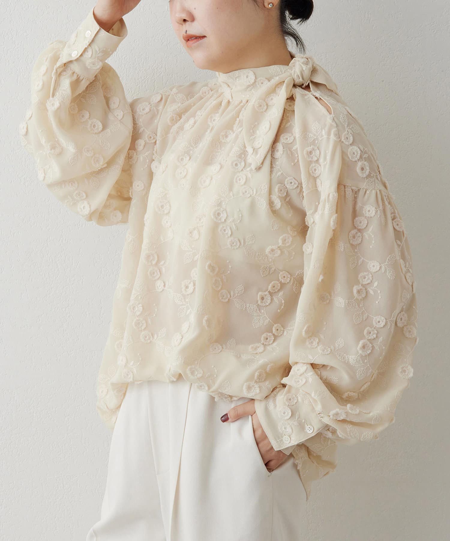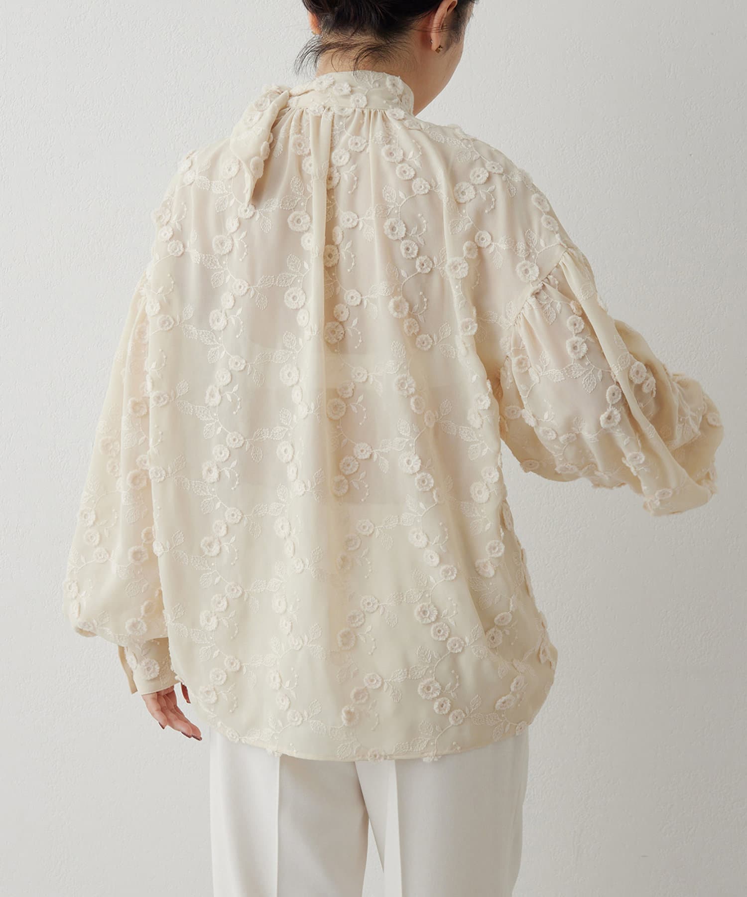 フラワー刺繍で全方位着映える、華やぎボウブラウス