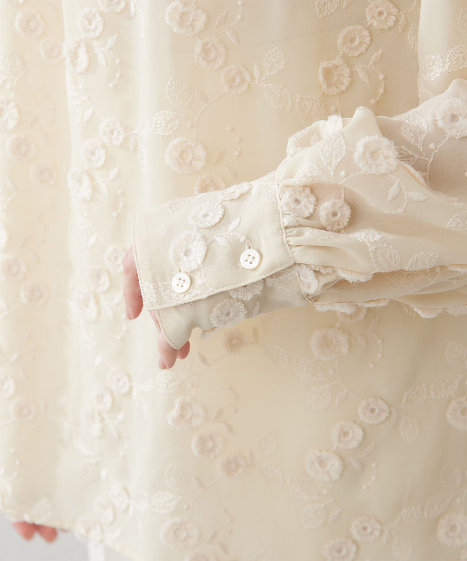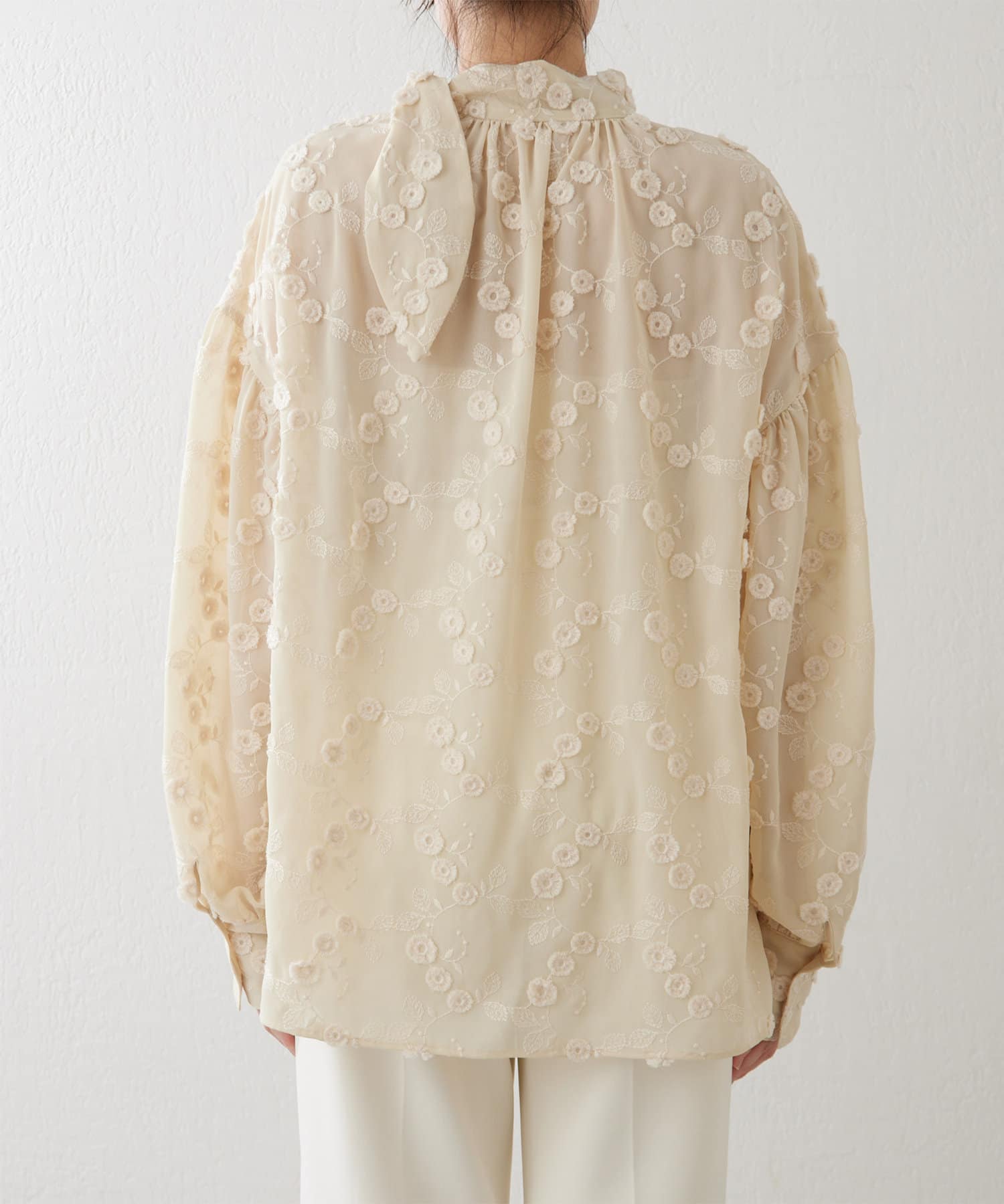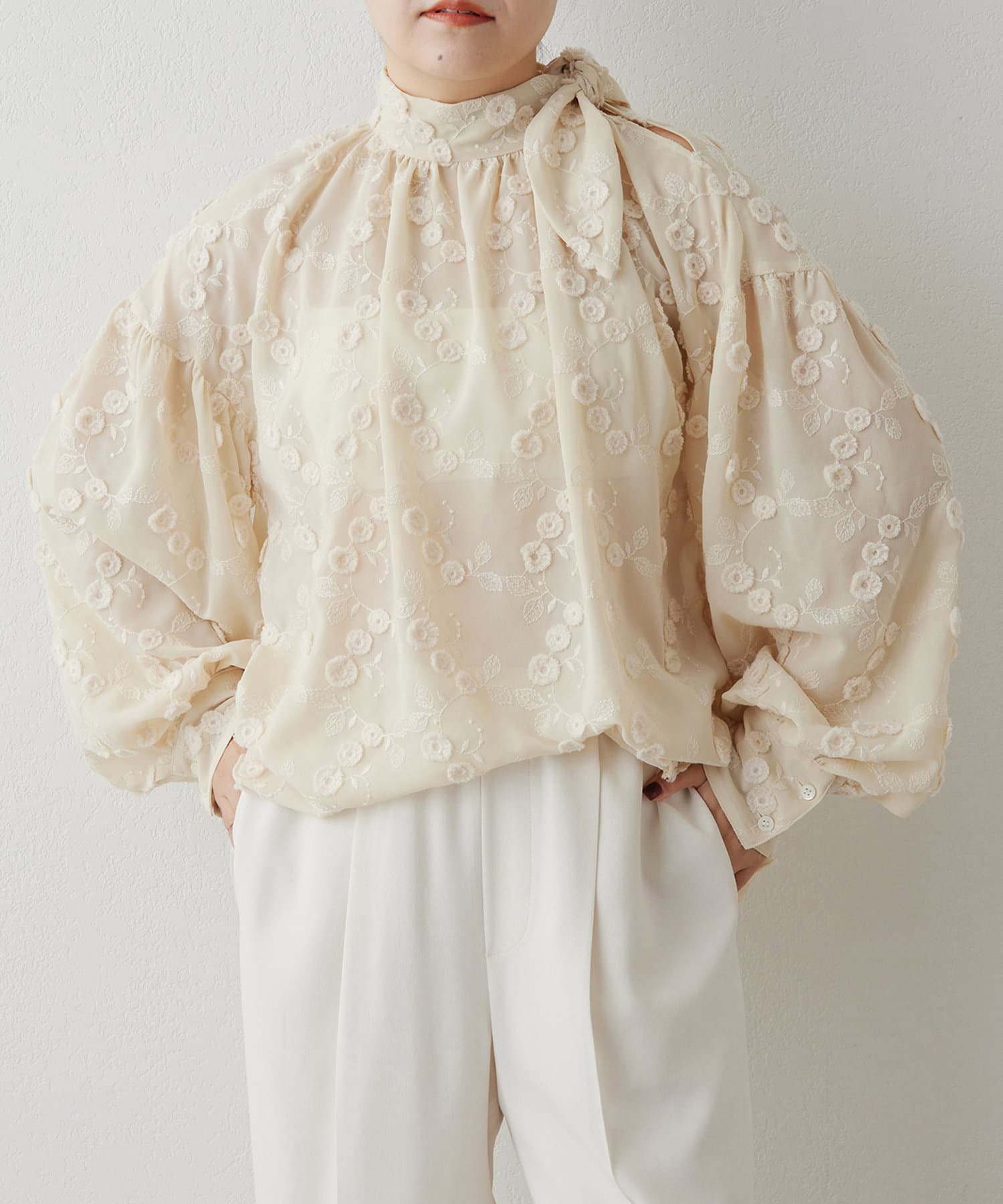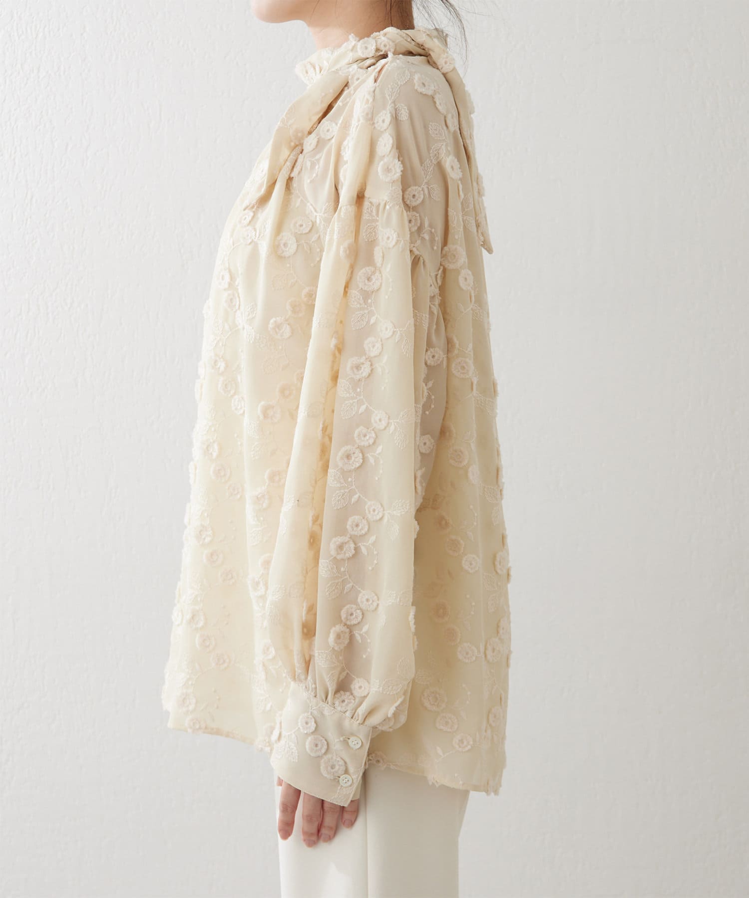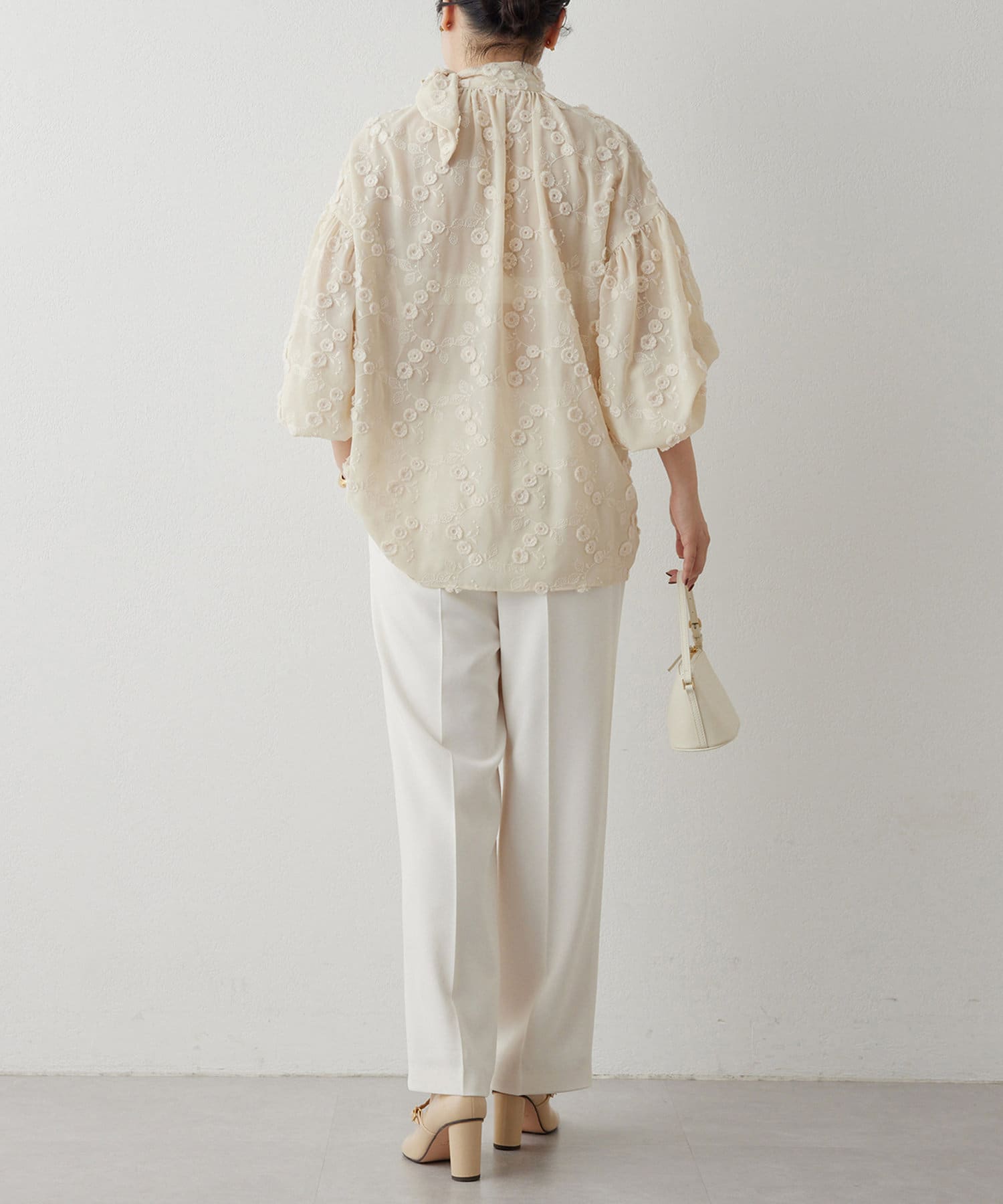フラワー刺繍で全方位着映える、華やぎボウブラウス
