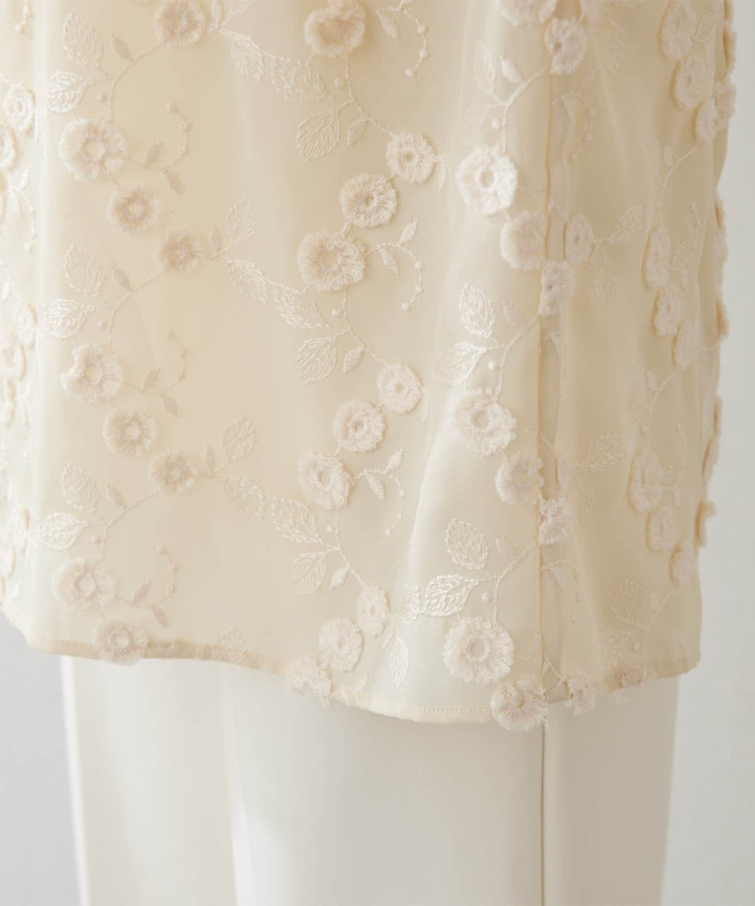 ■全体にあしらった甘すぎないフラワー刺繍がとサイドに施したリボンタイが華やかさと高級感をプラス。
