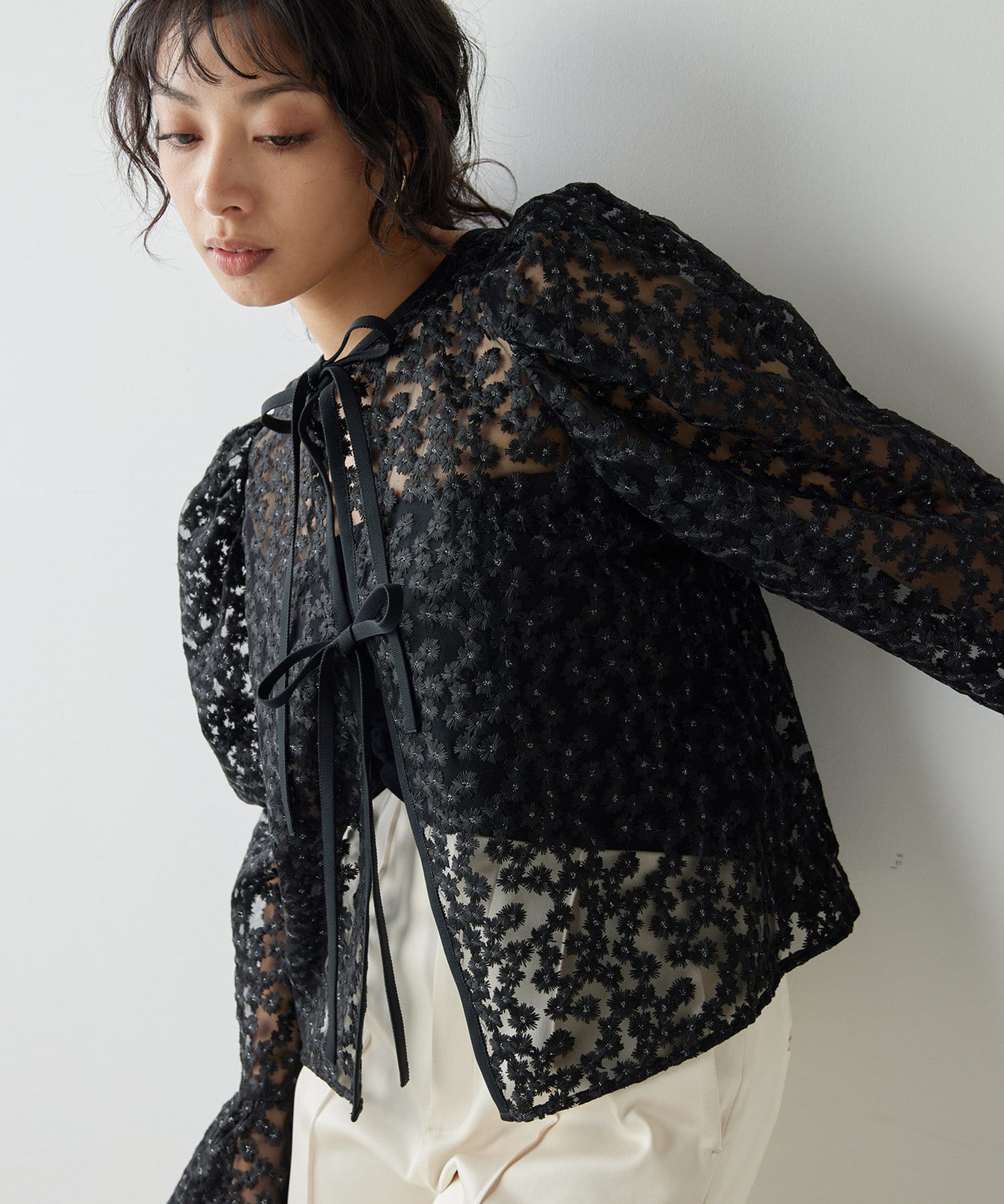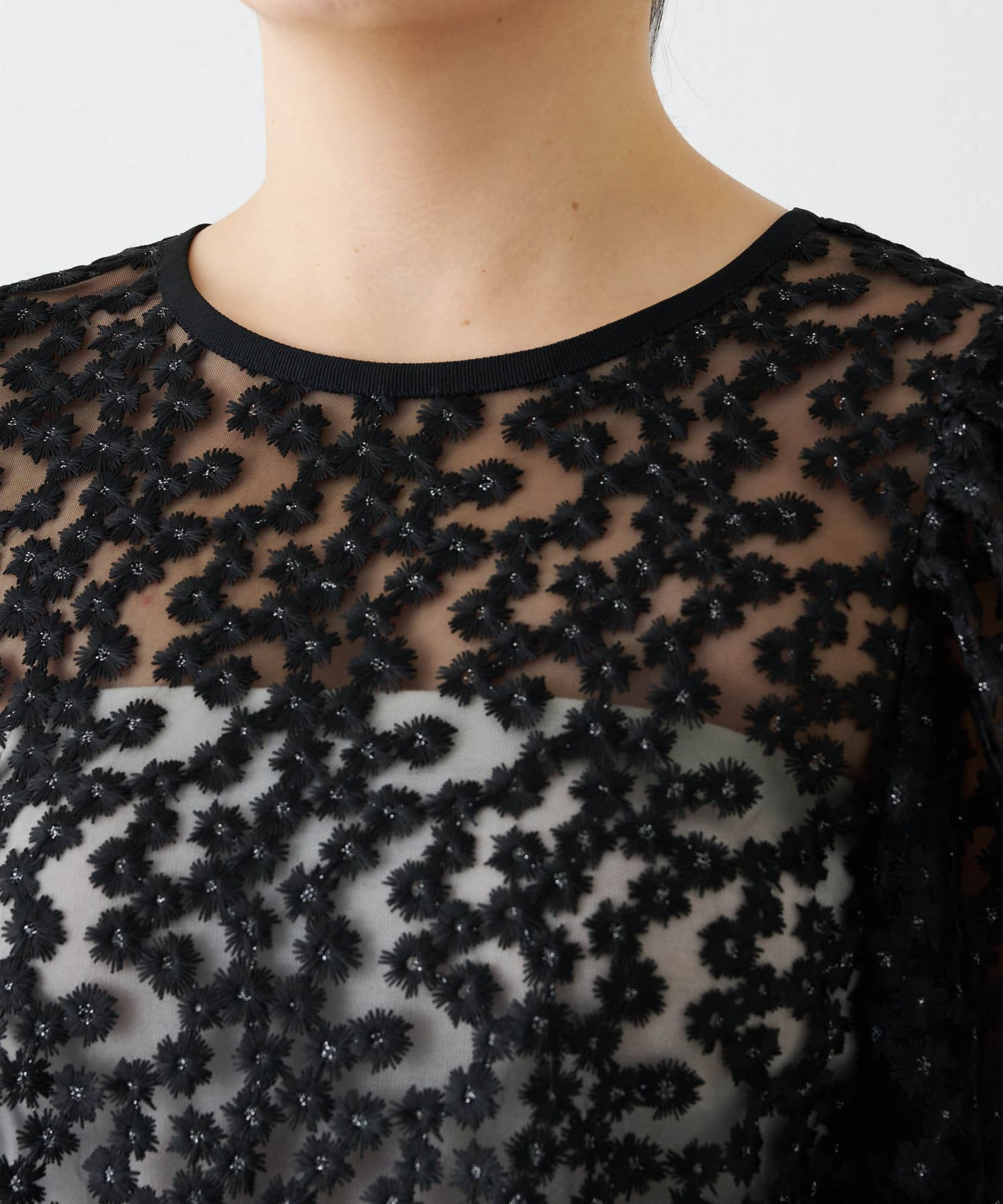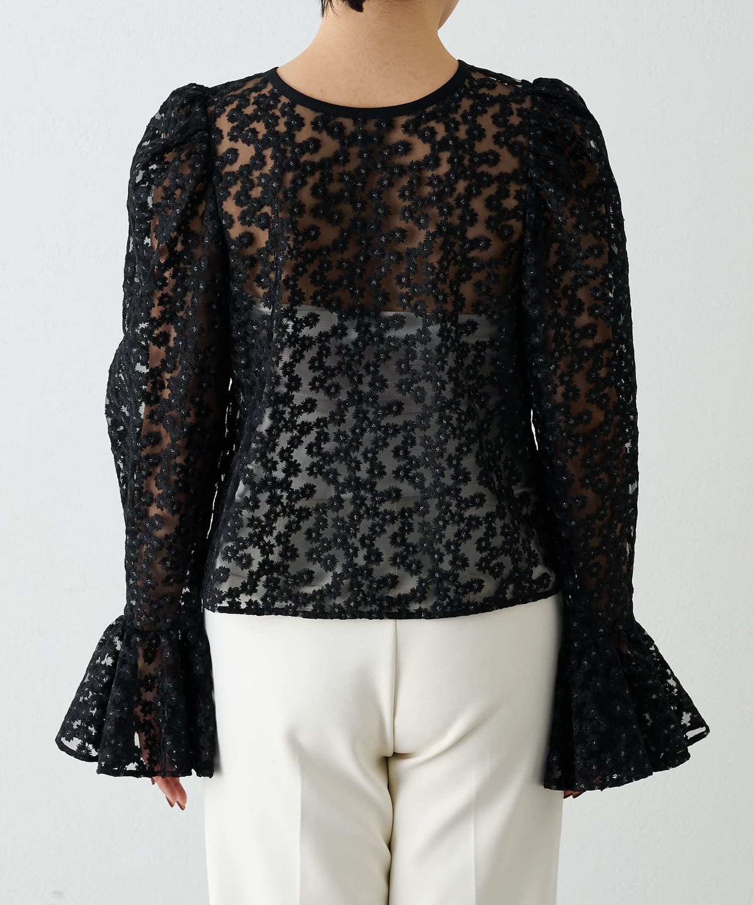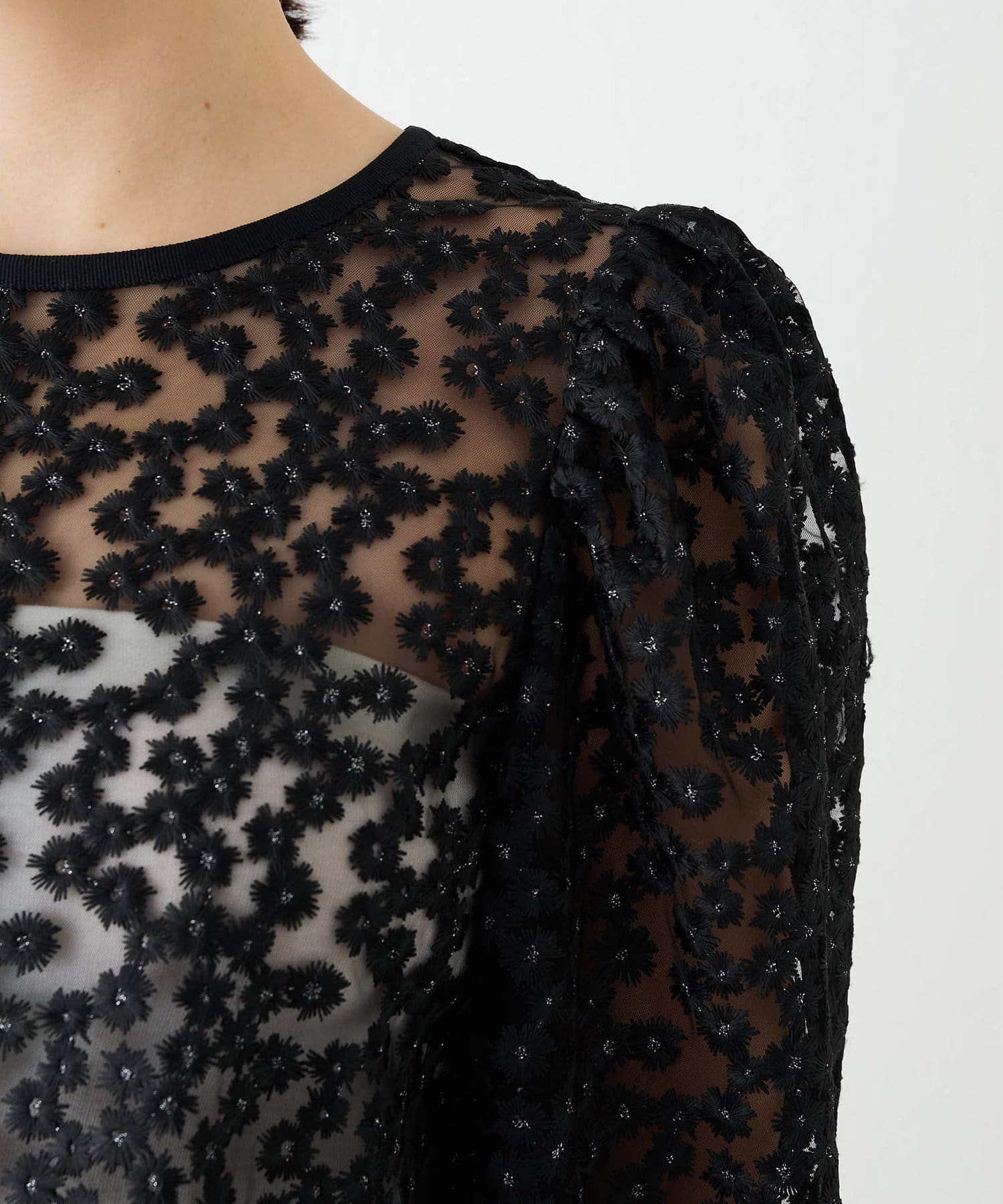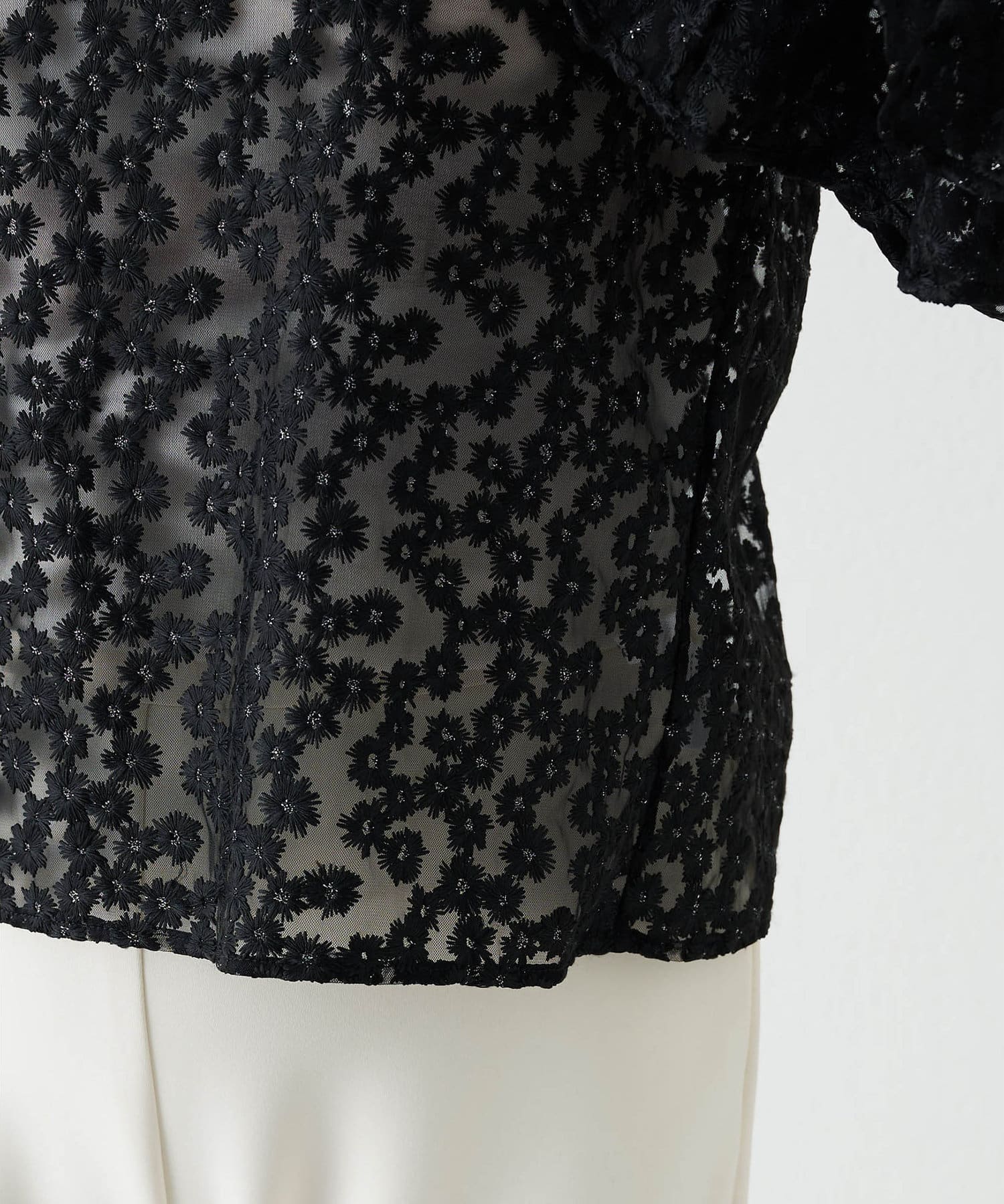 ■チュール素材に刺繍を施した透け感が軽やかなブラウス。