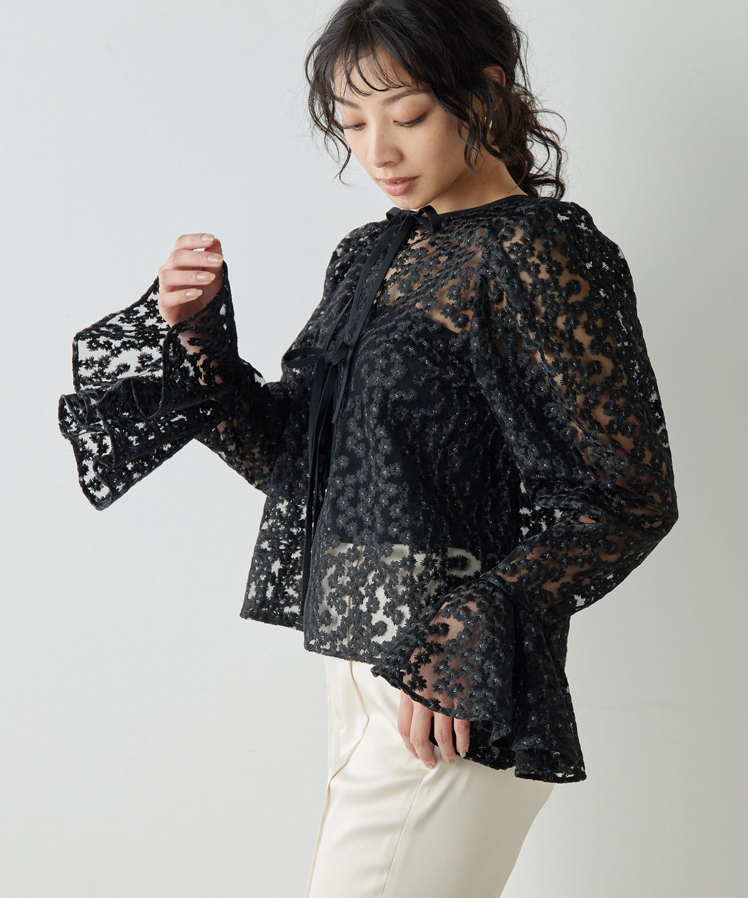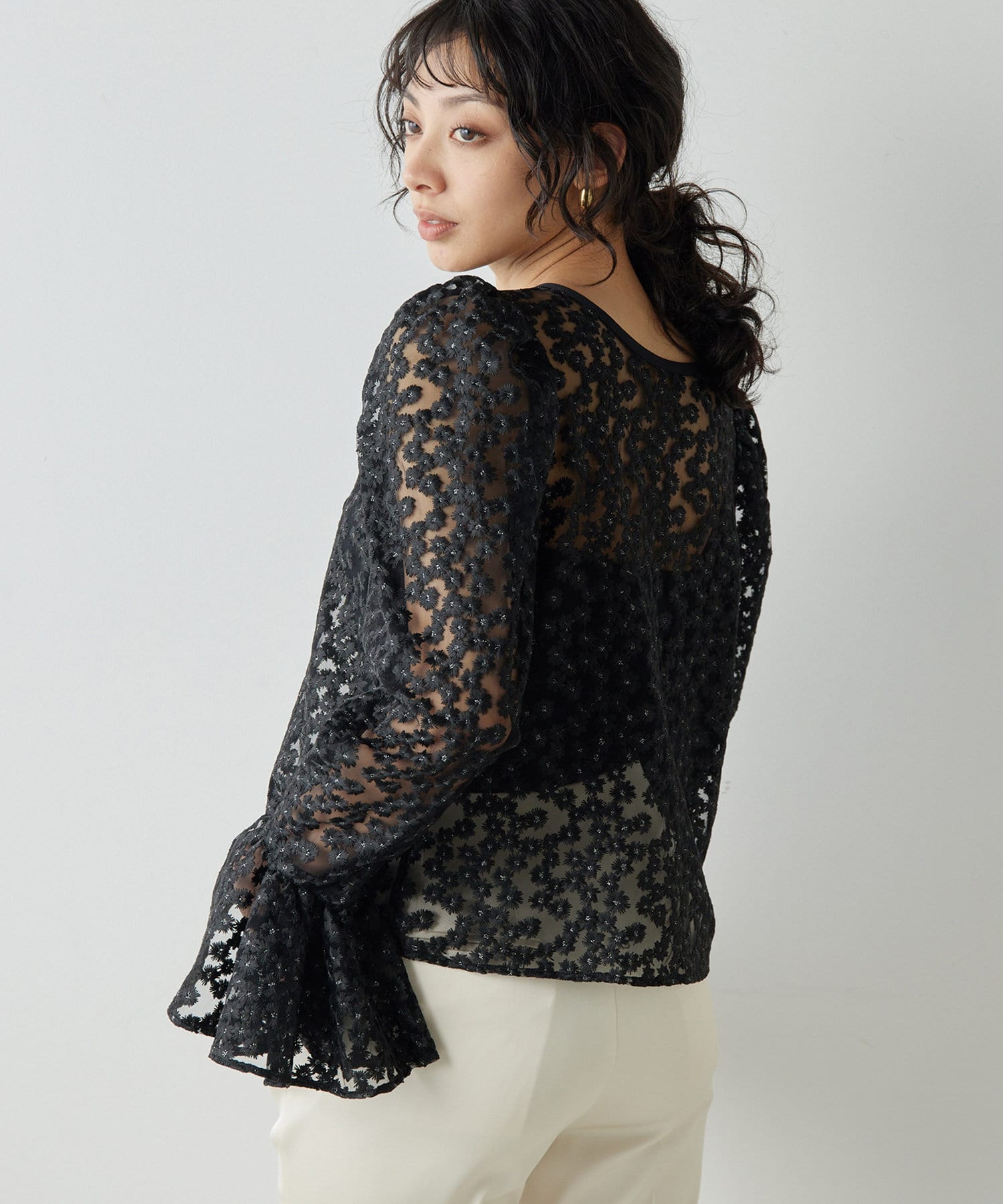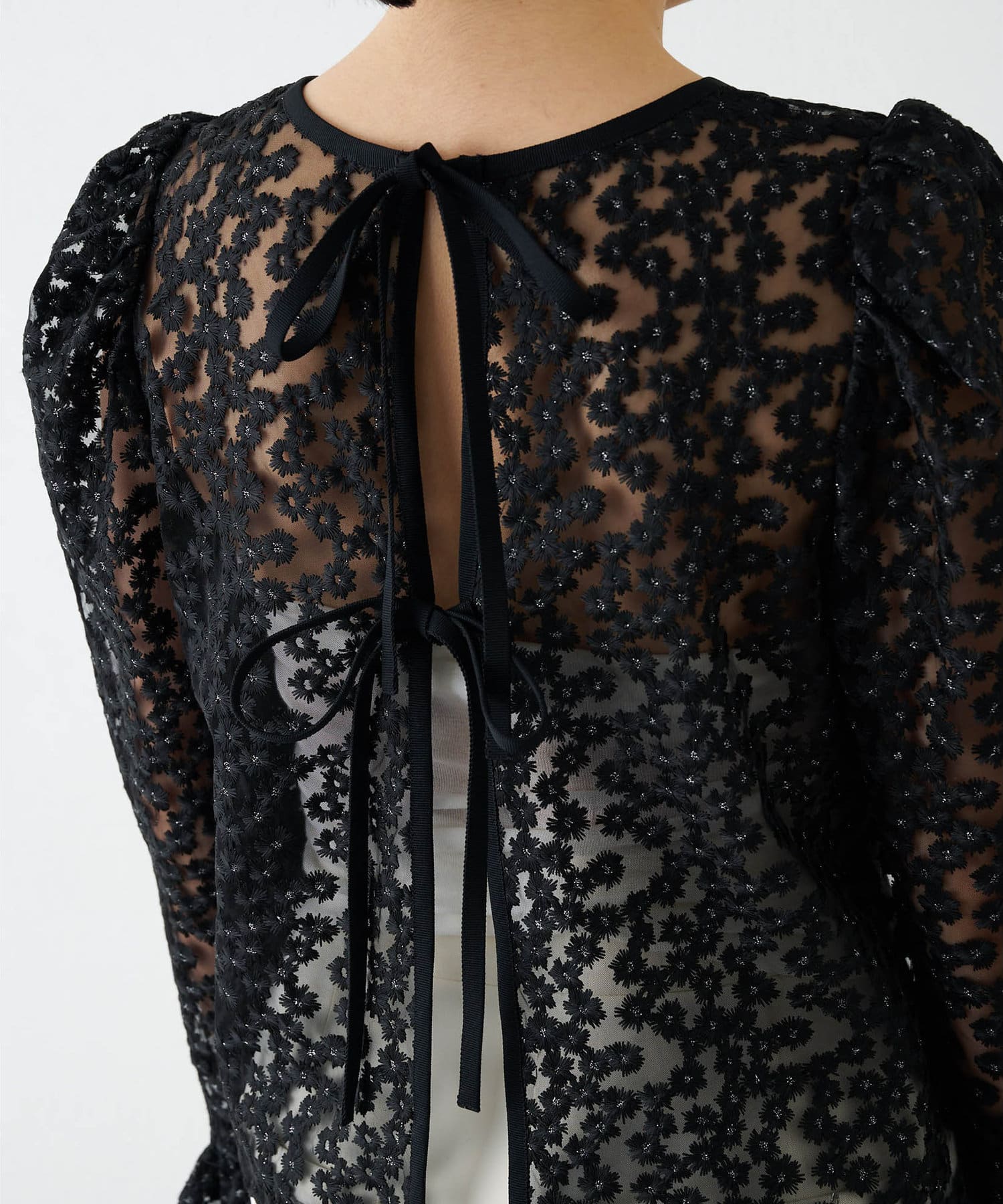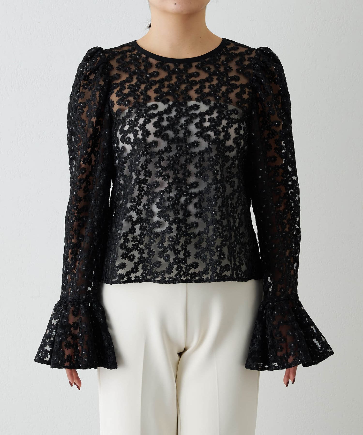 ■チュール素材に刺繍を施した透け感が軽やかなブラウス。