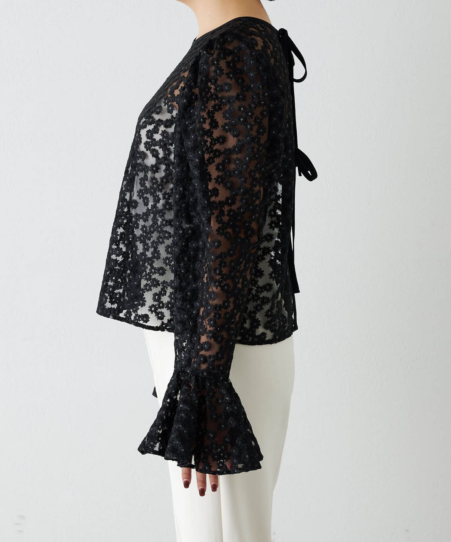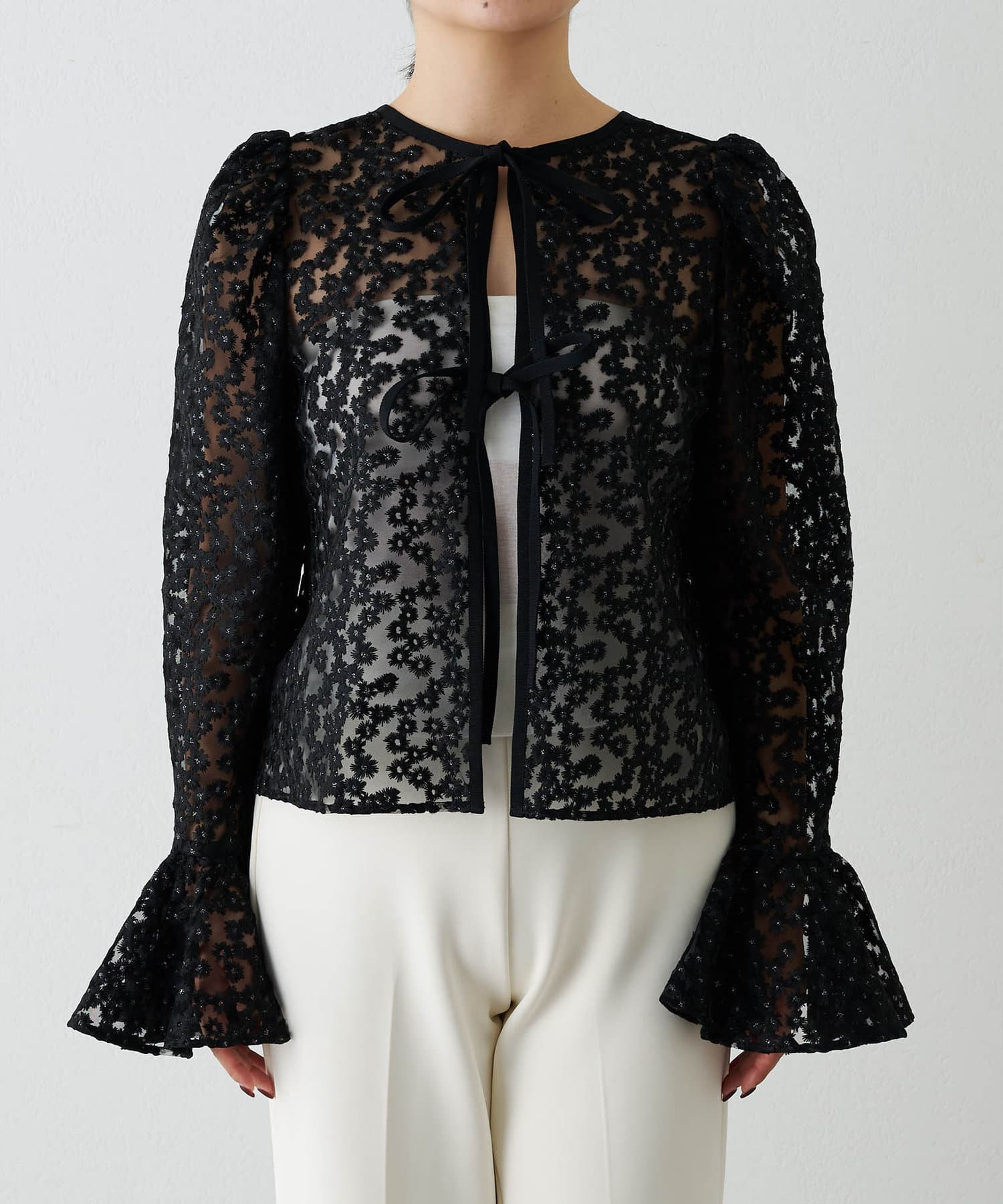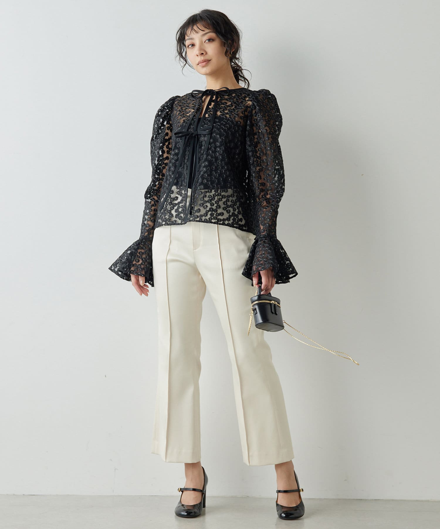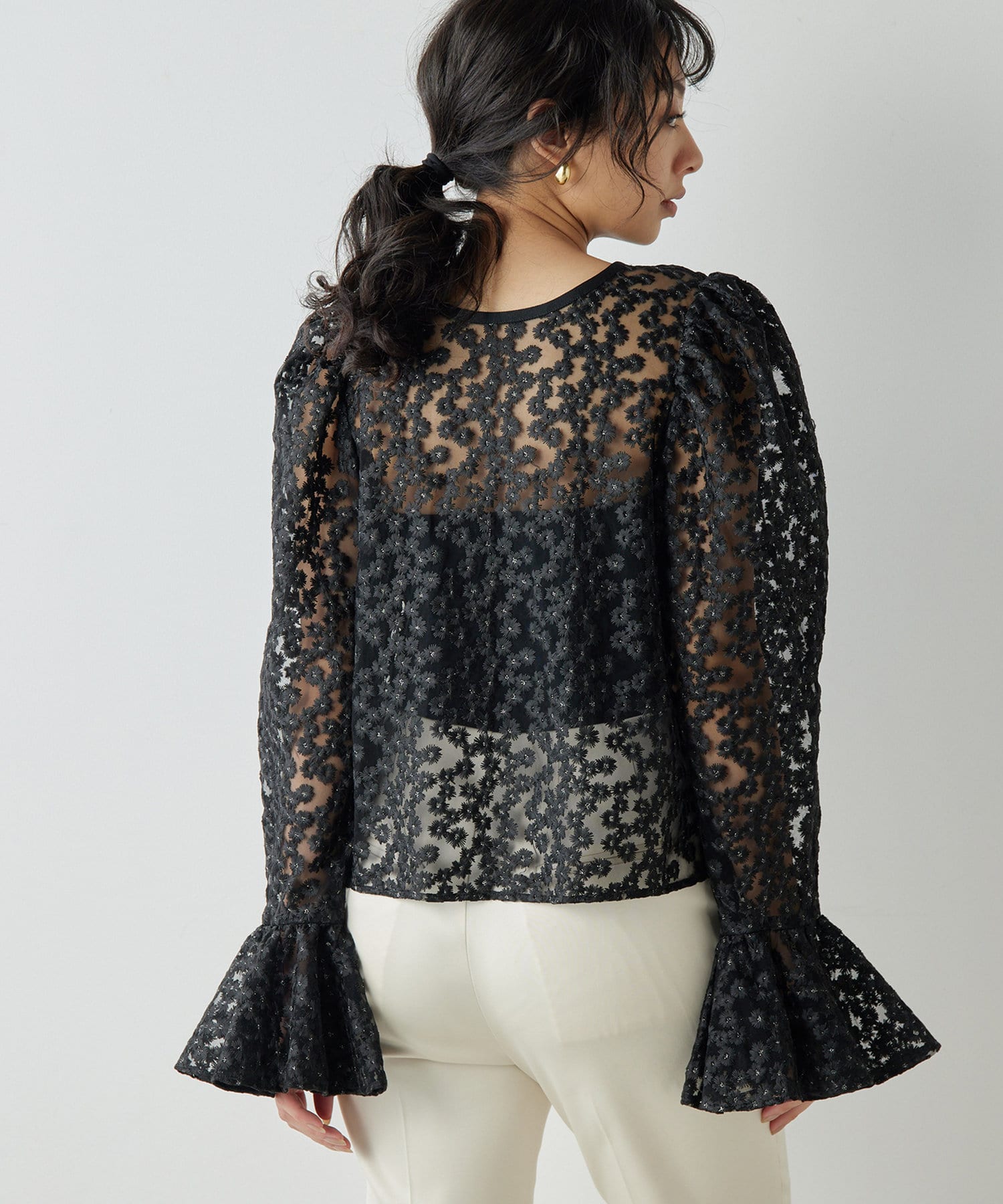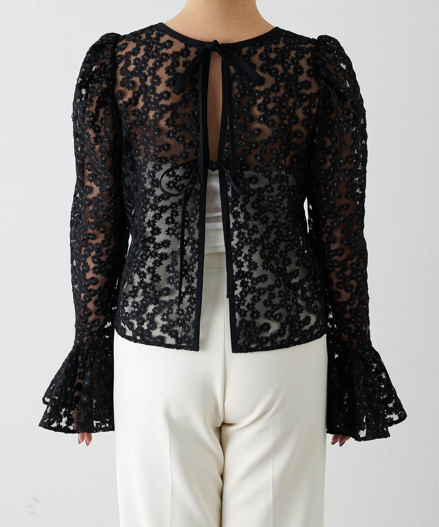 ■チュール素材に刺繍を施した透け感が軽やかなブラウス。