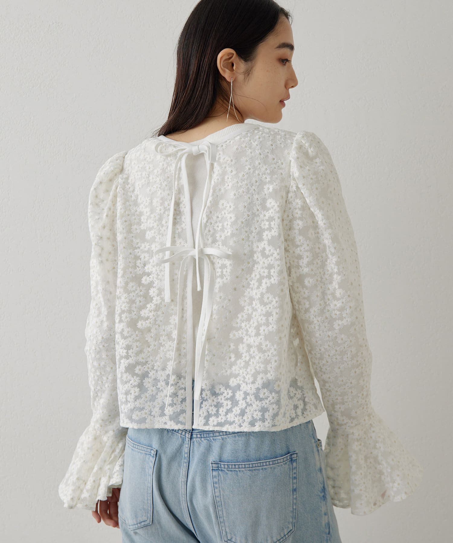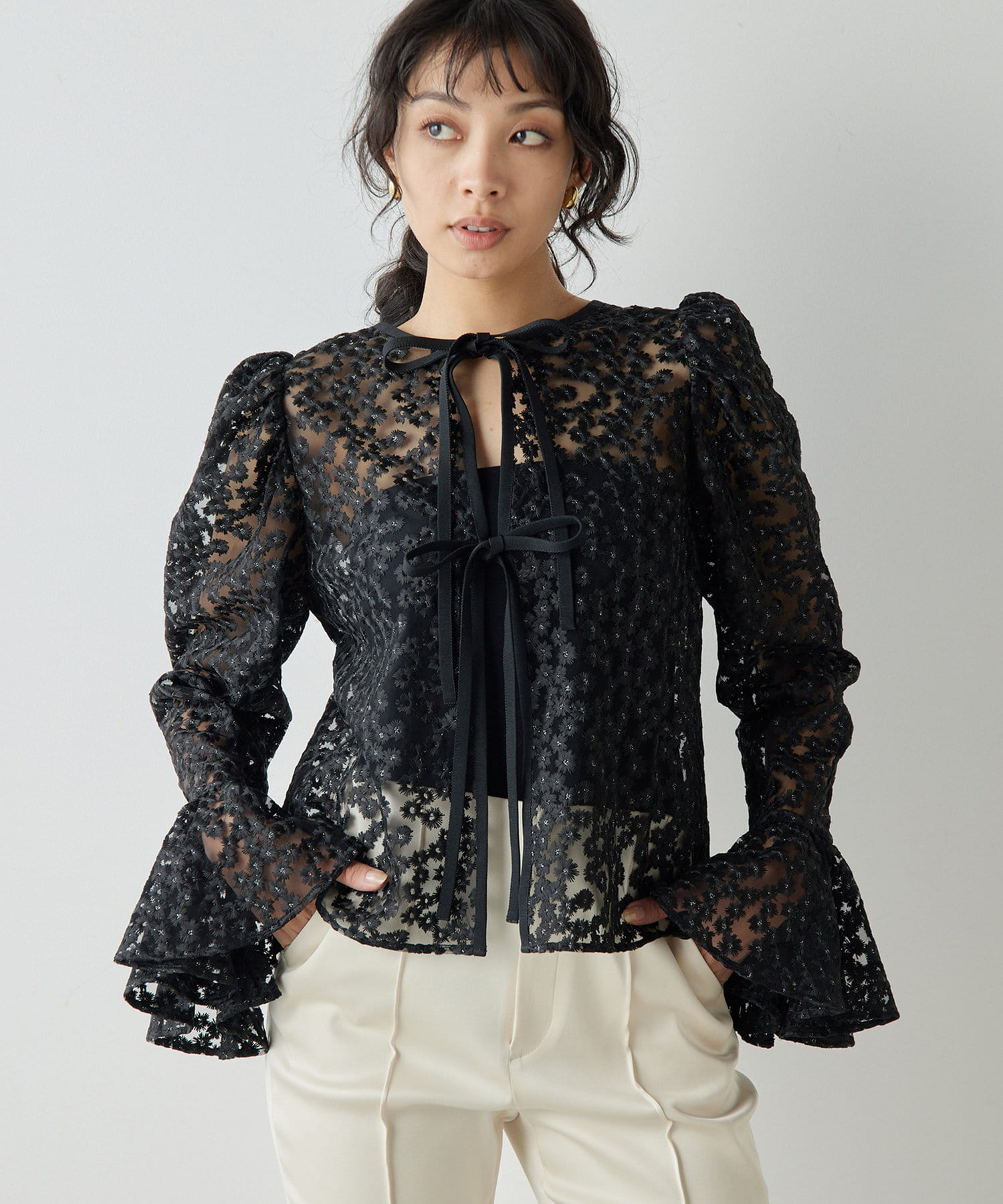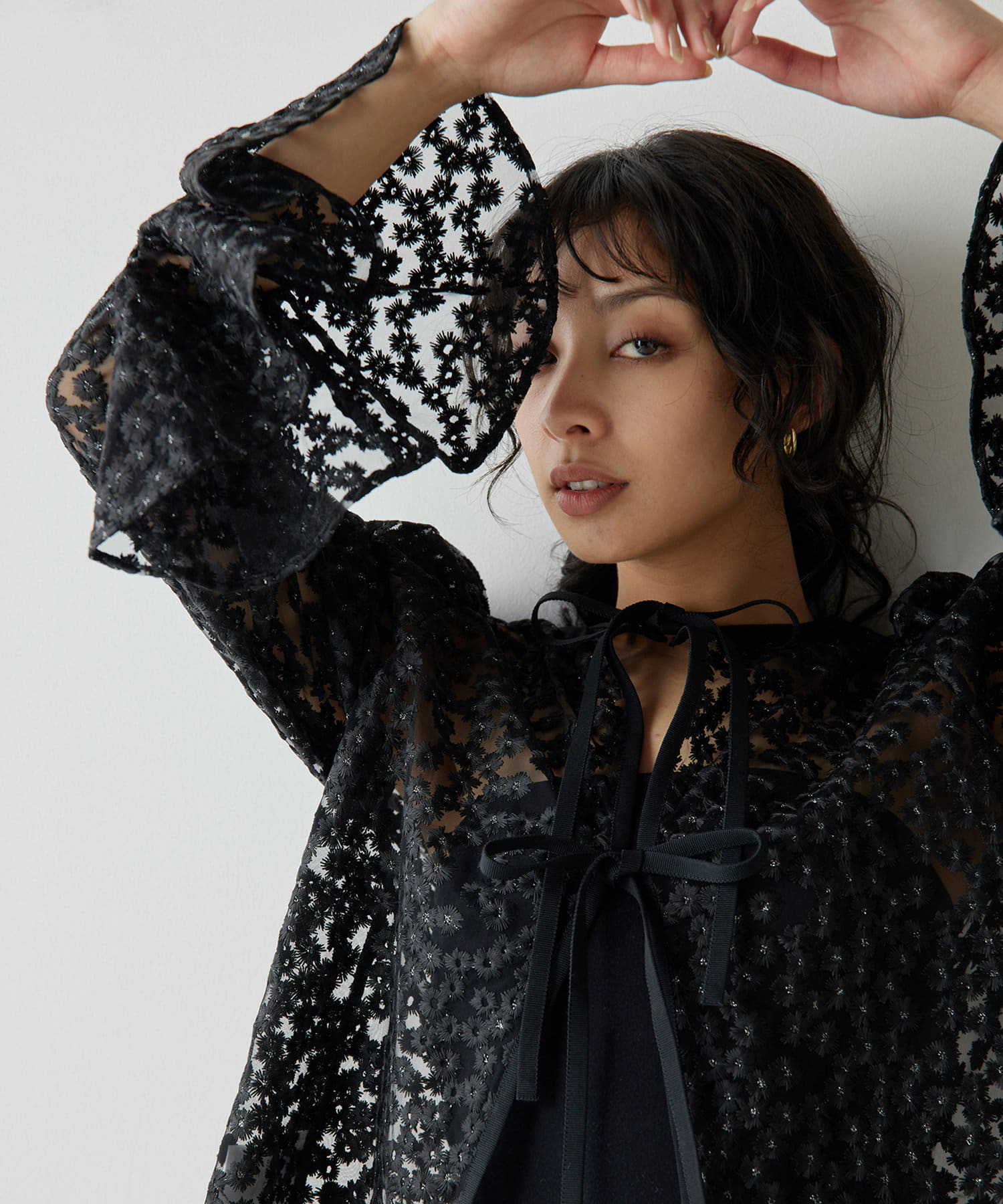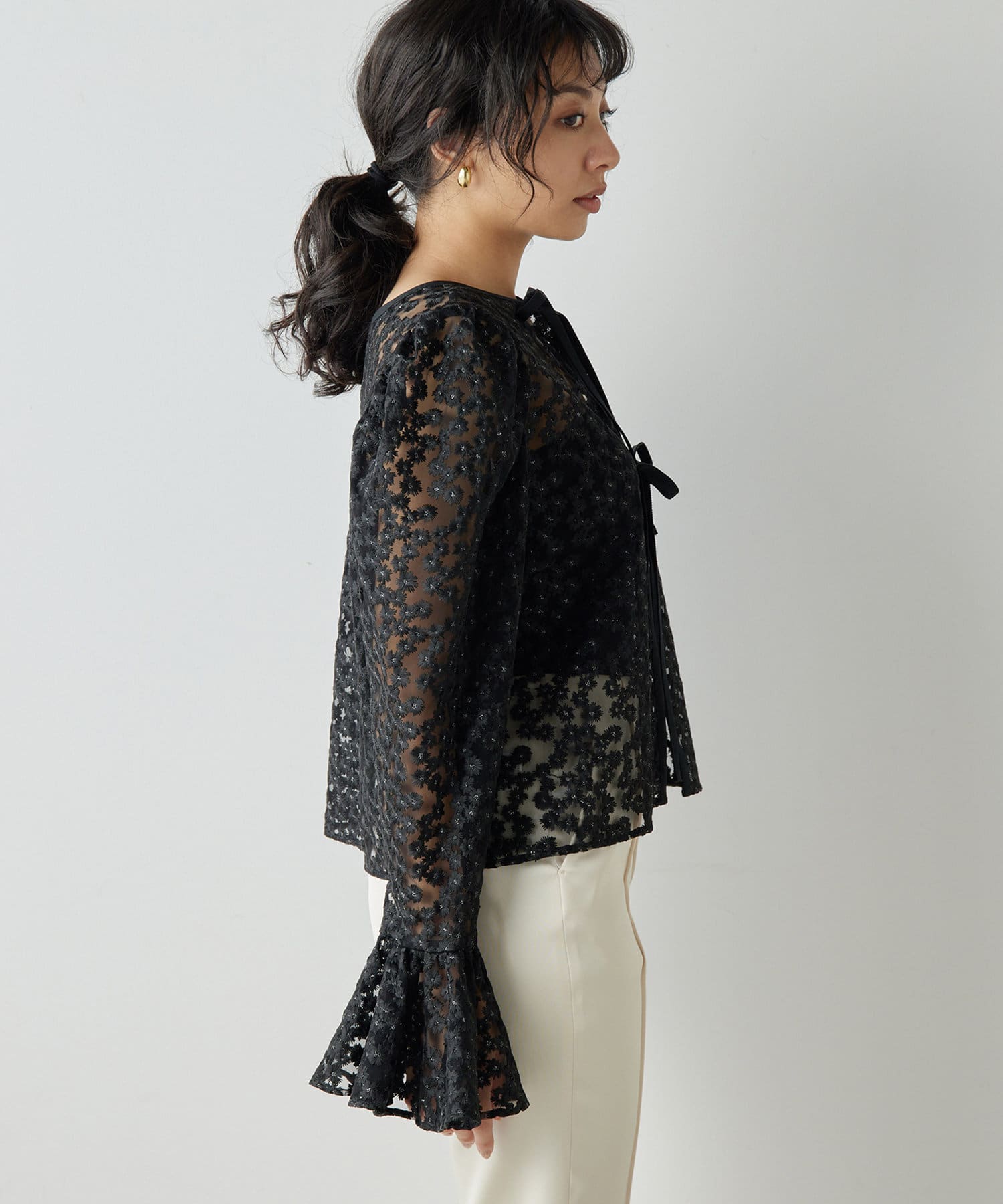 ■チュール素材に刺繍を施した透け感が軽やかなブラウス。