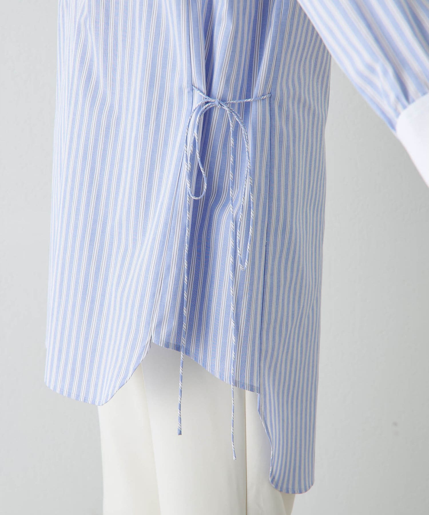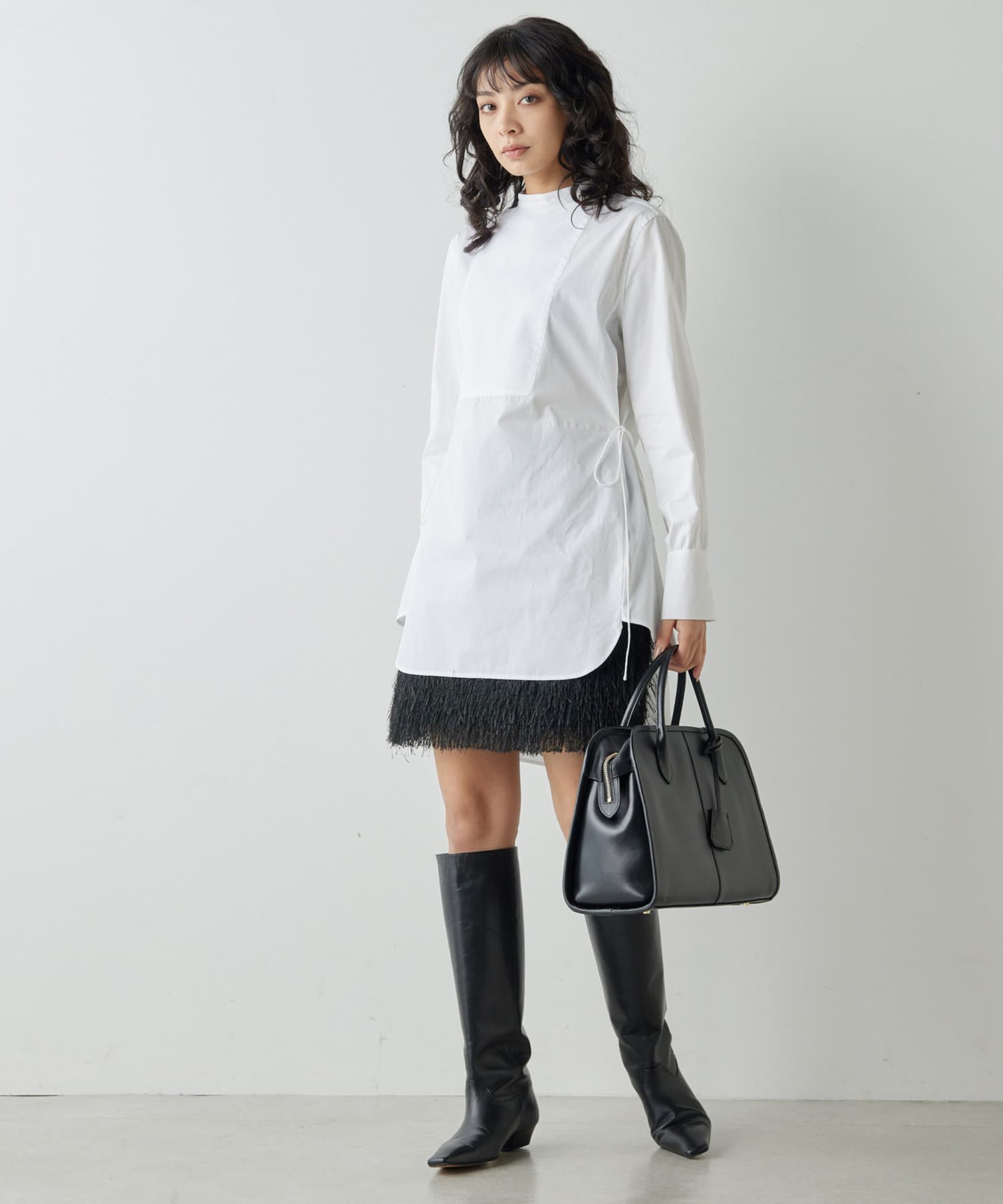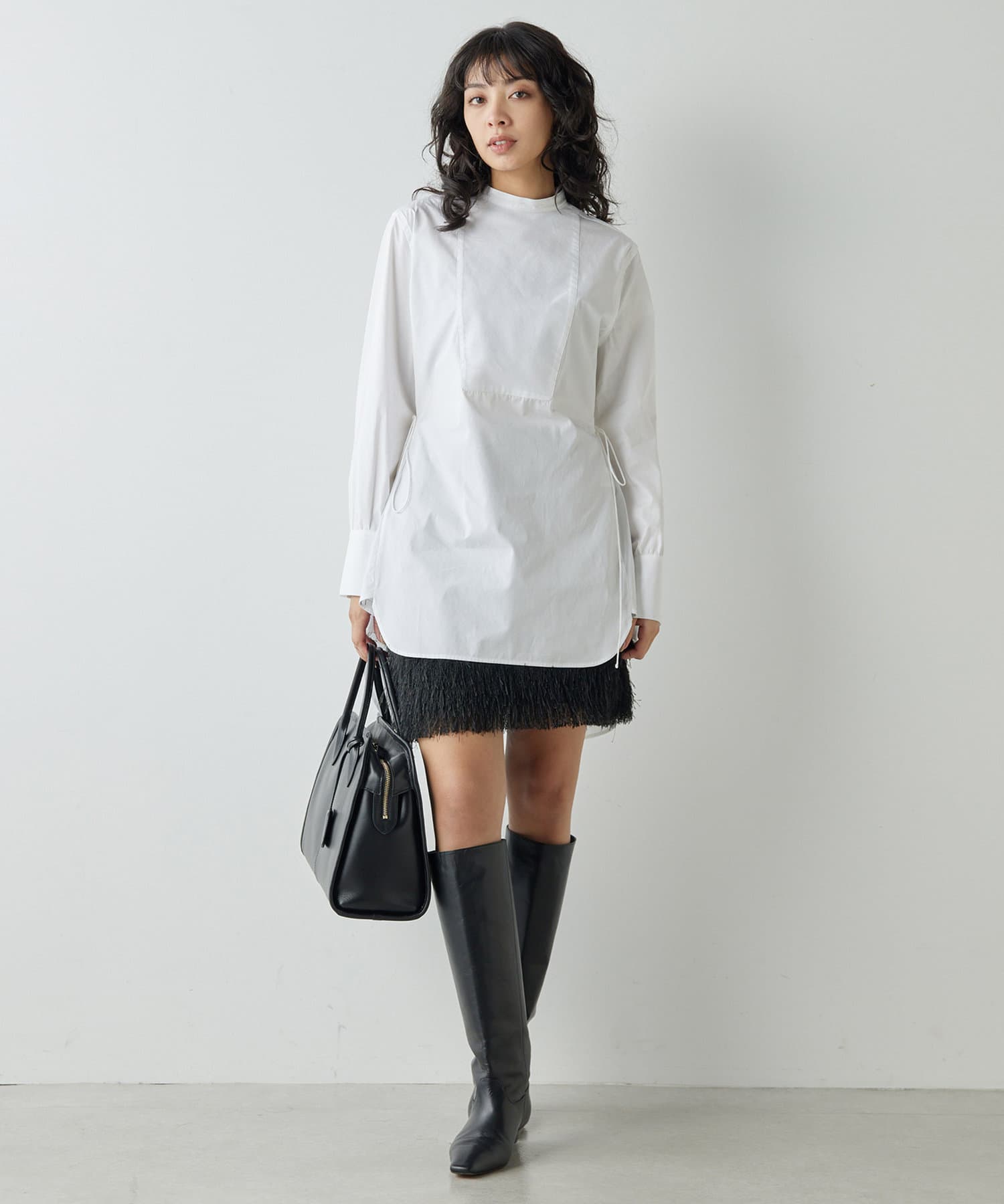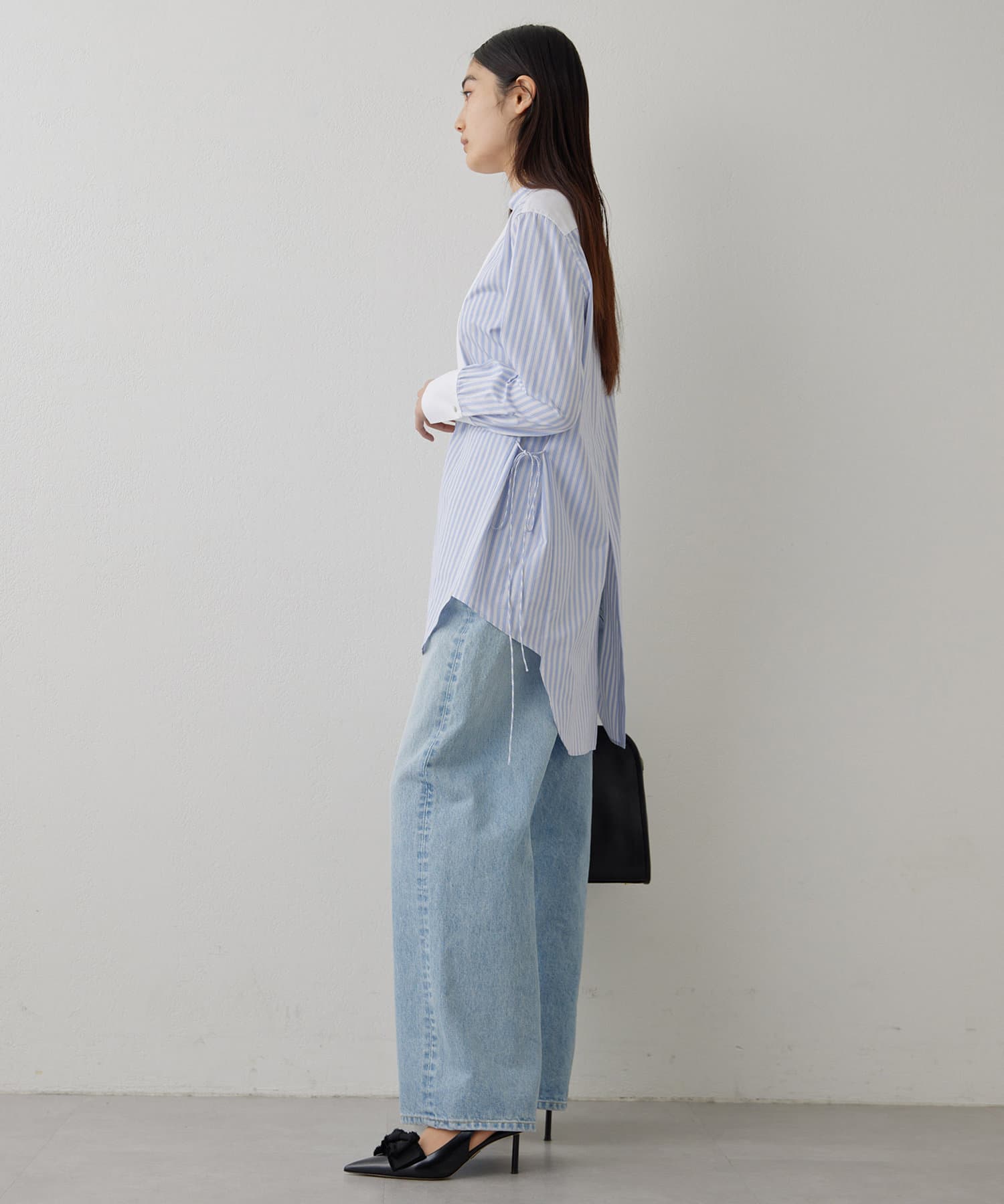 ■両脇にあしらった共紐でシルエットを調整でき、結んだり垂らしてアレンジしても◎。