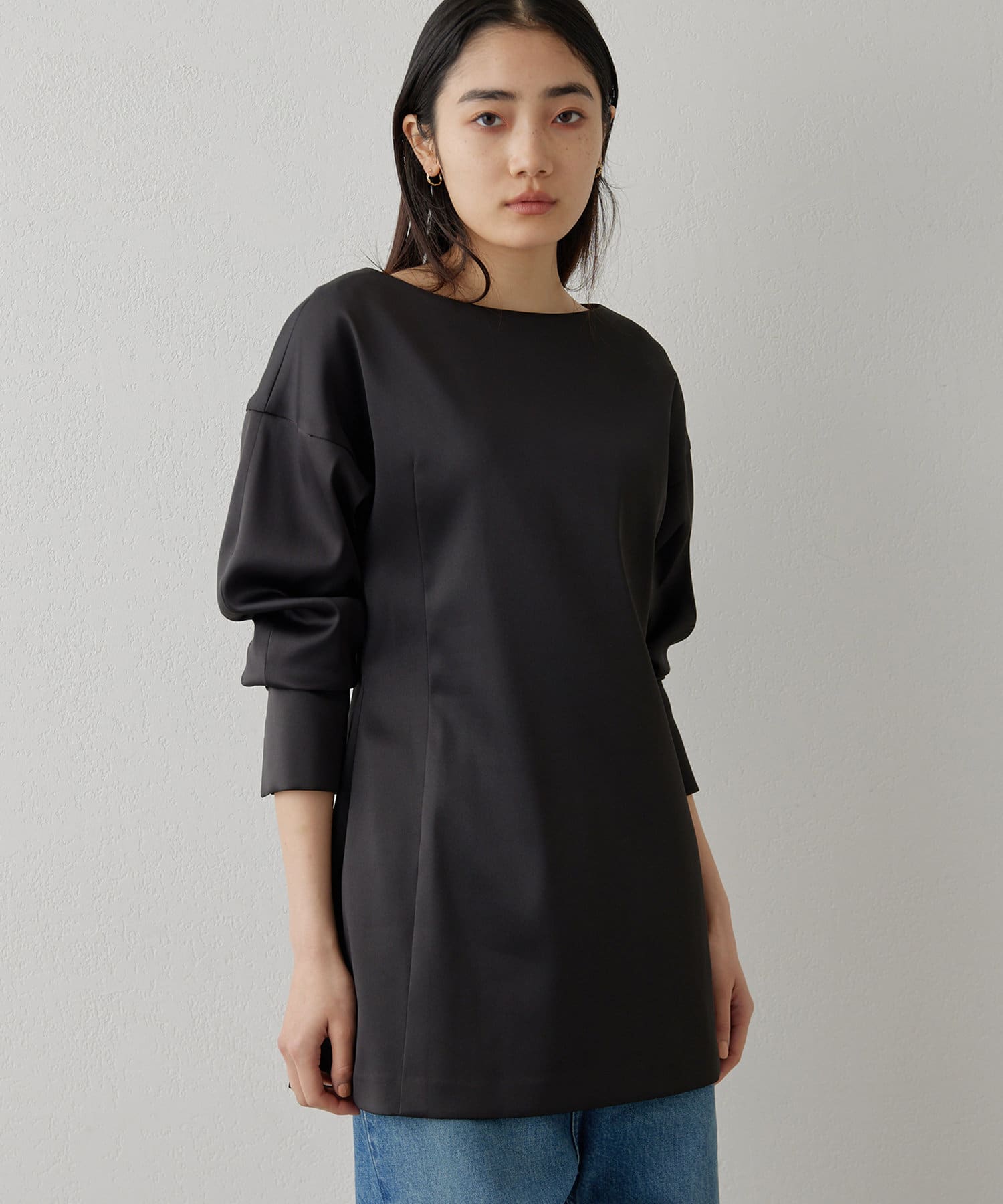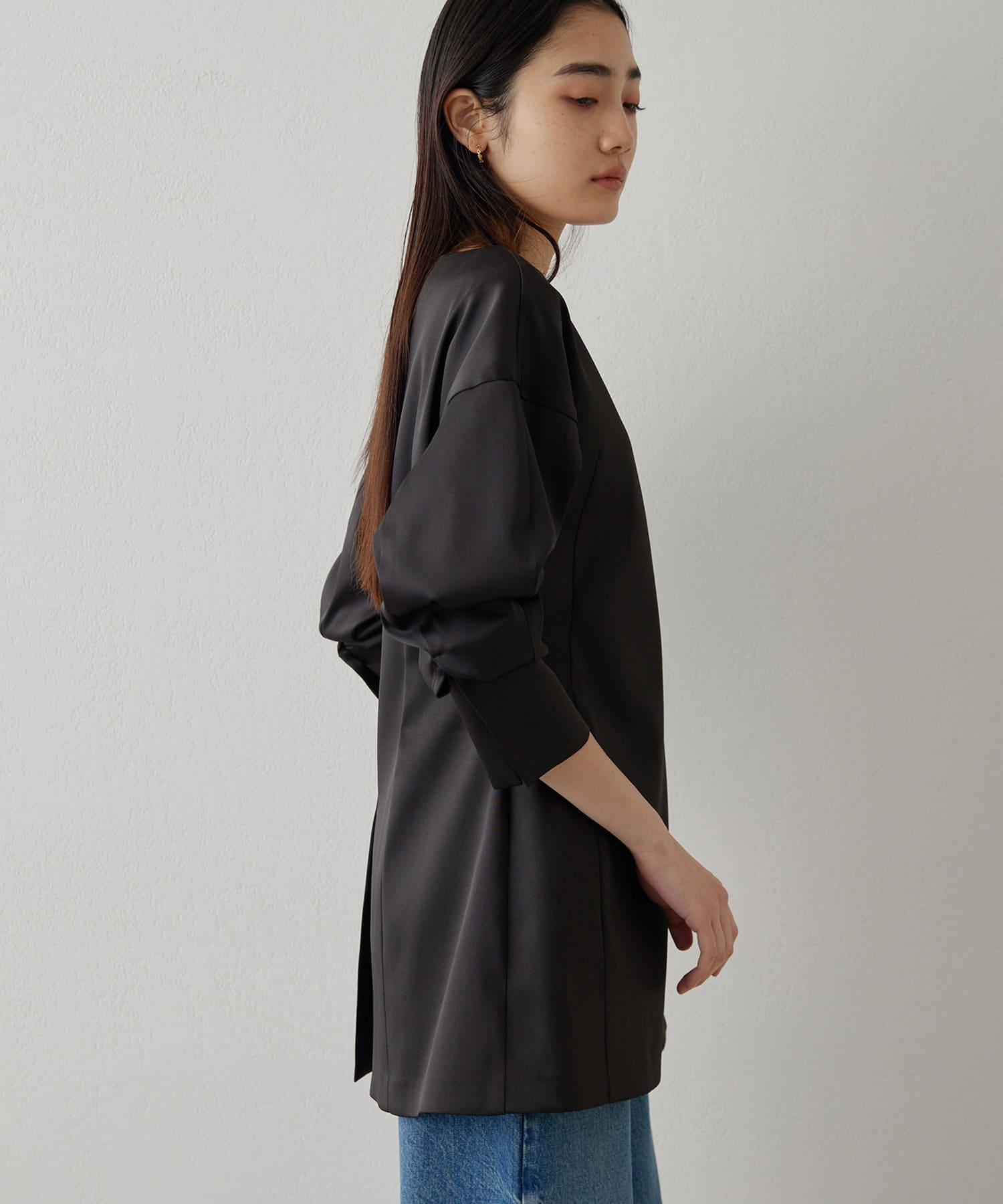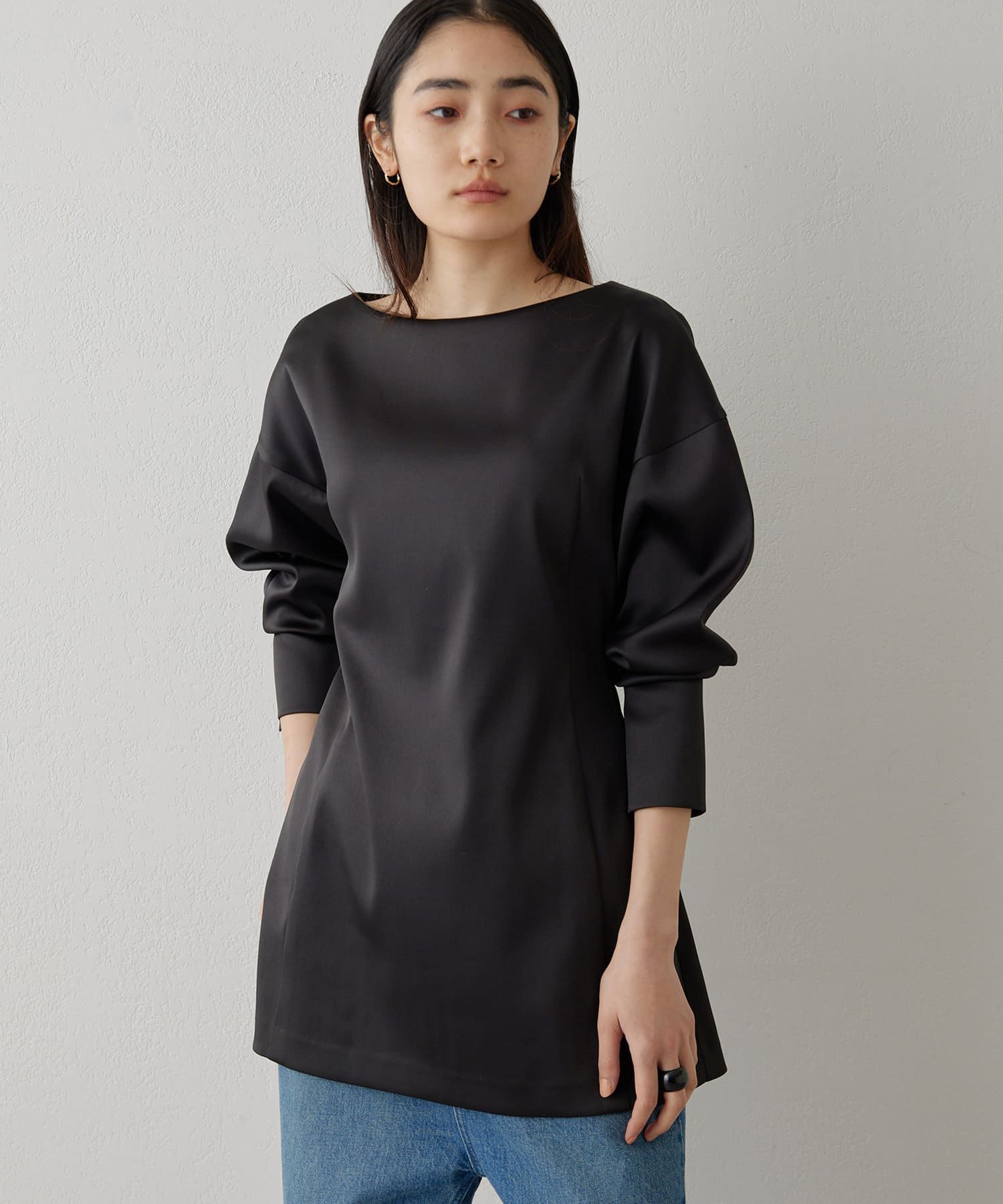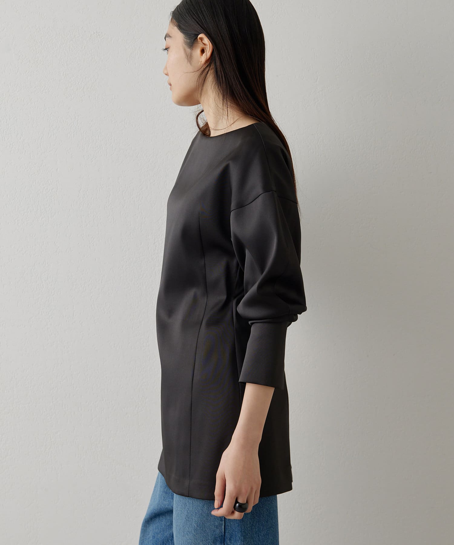■ストレッチ性のあるサテン生地を使用したドルマンブラウス。
