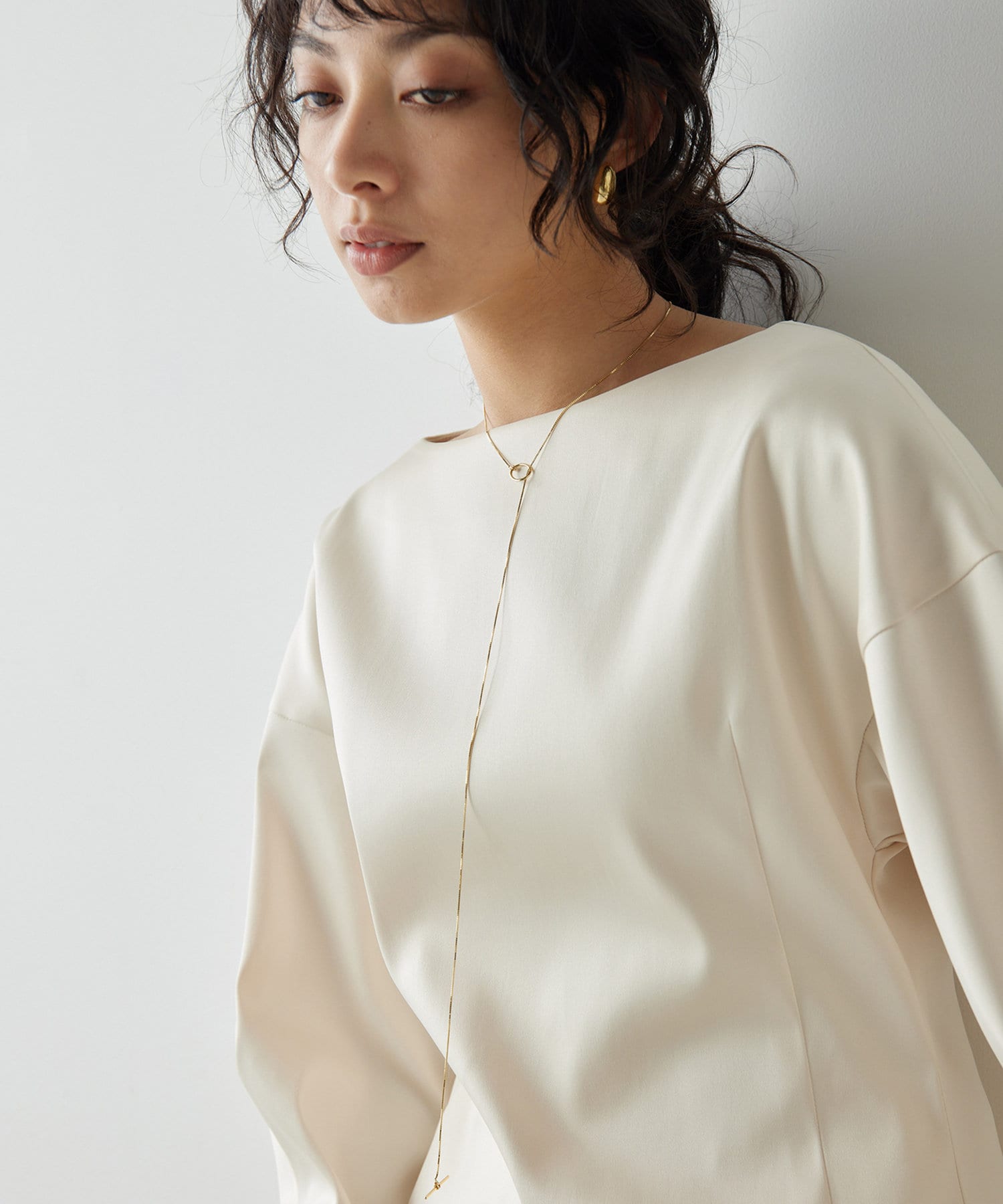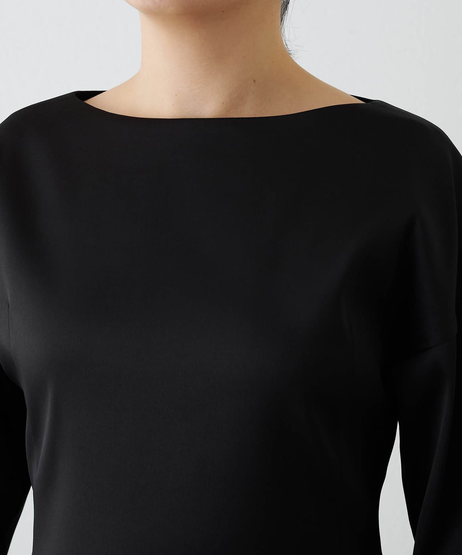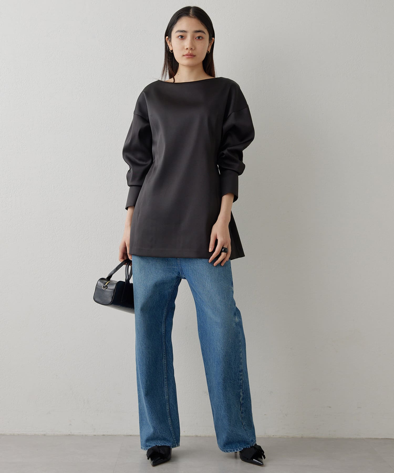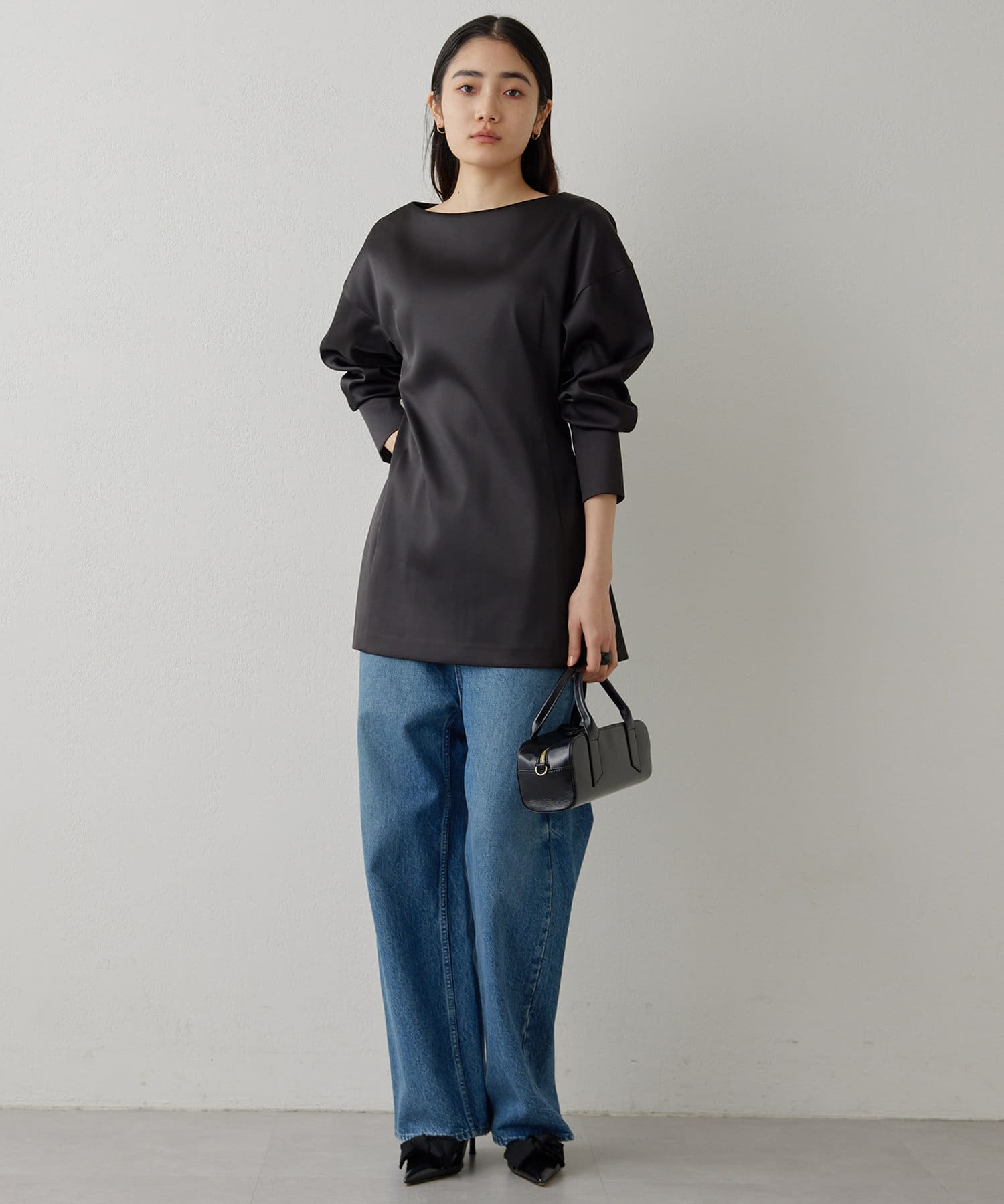 ■ストレッチ性のあるサテン生地を使用したドルマンブラウス。