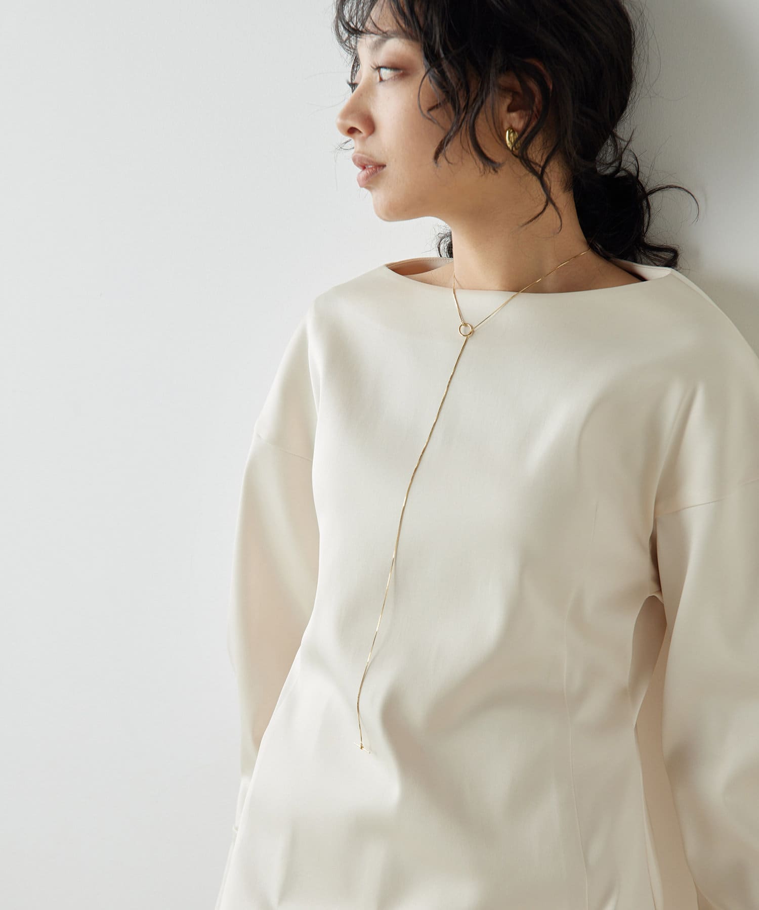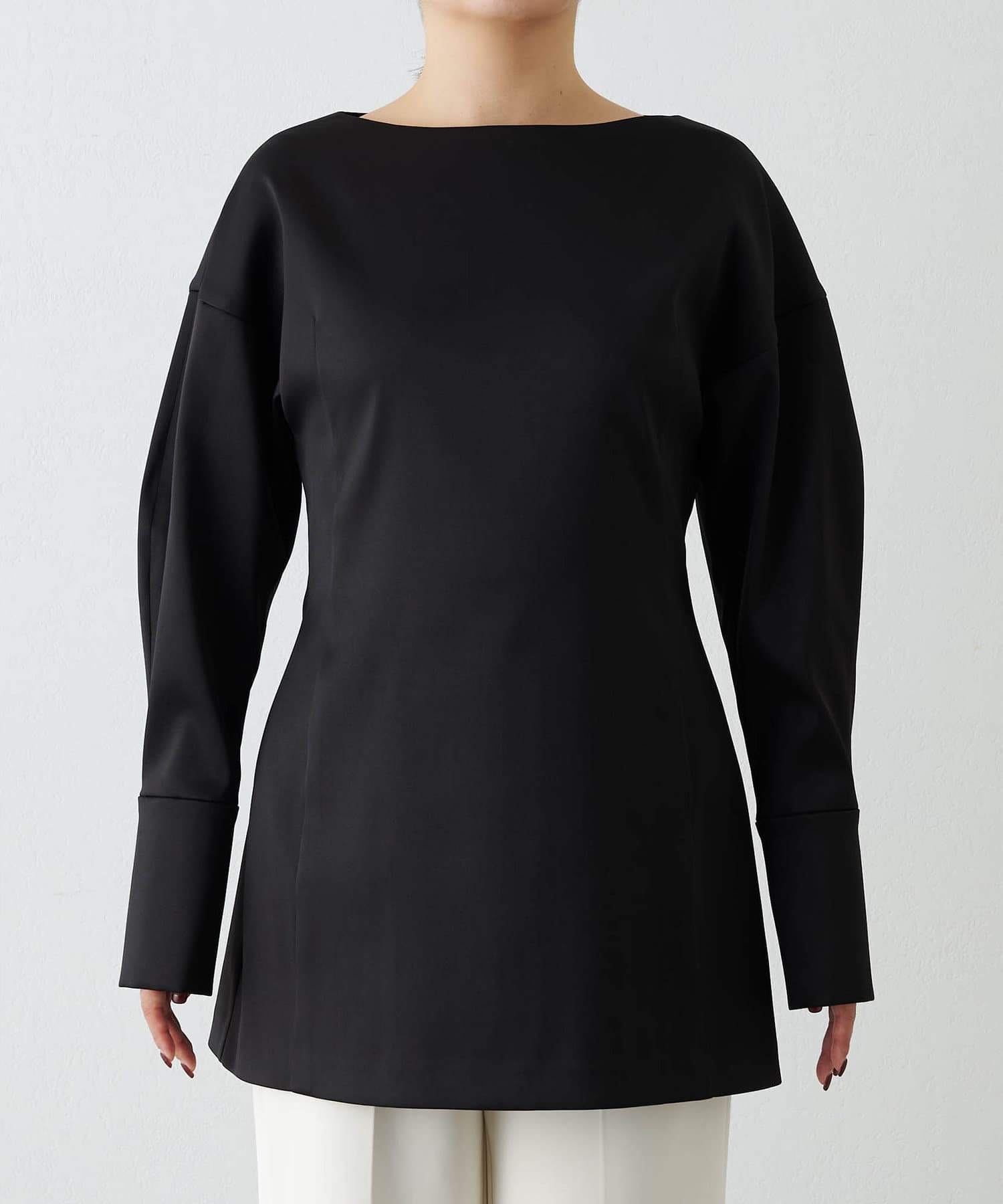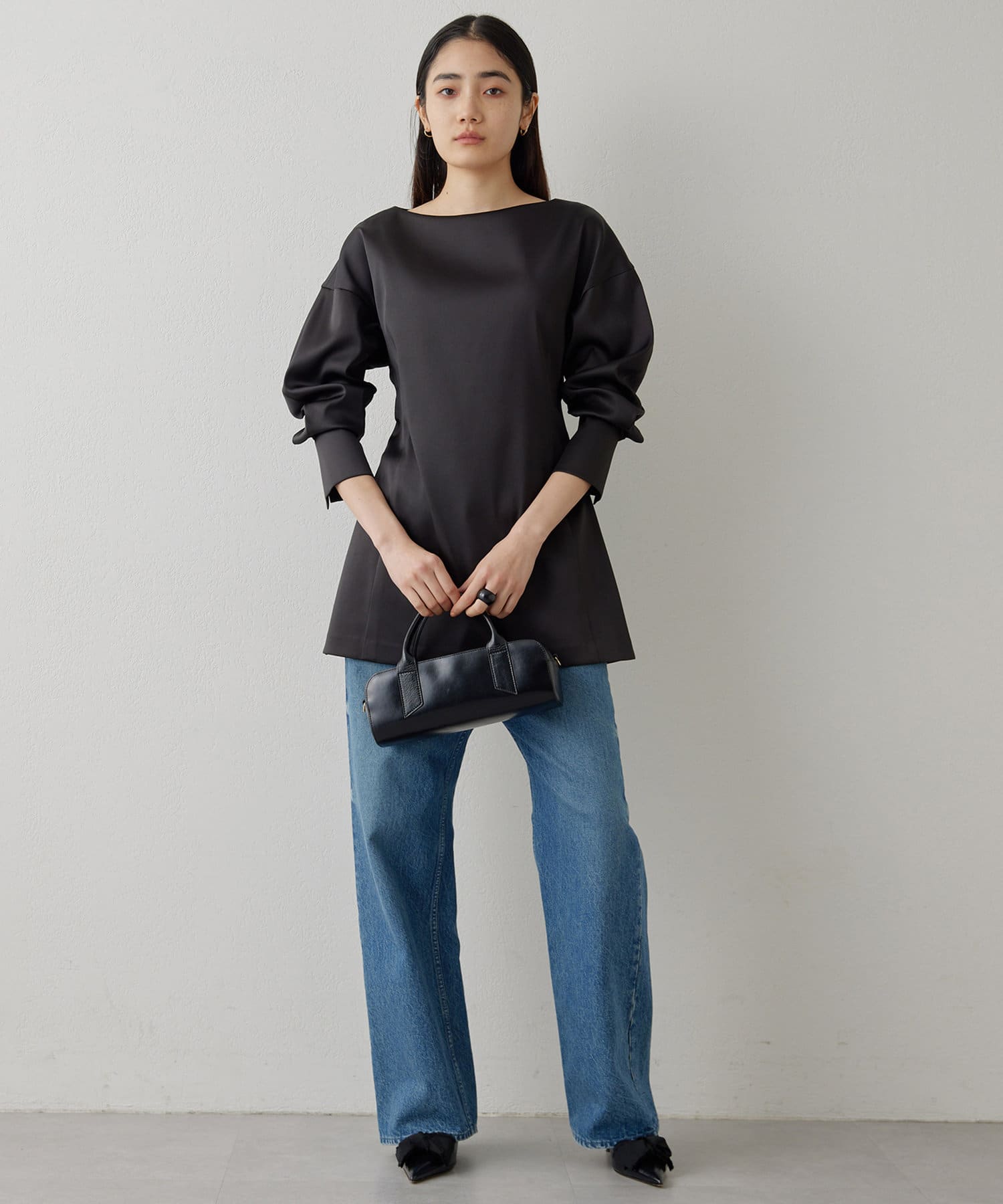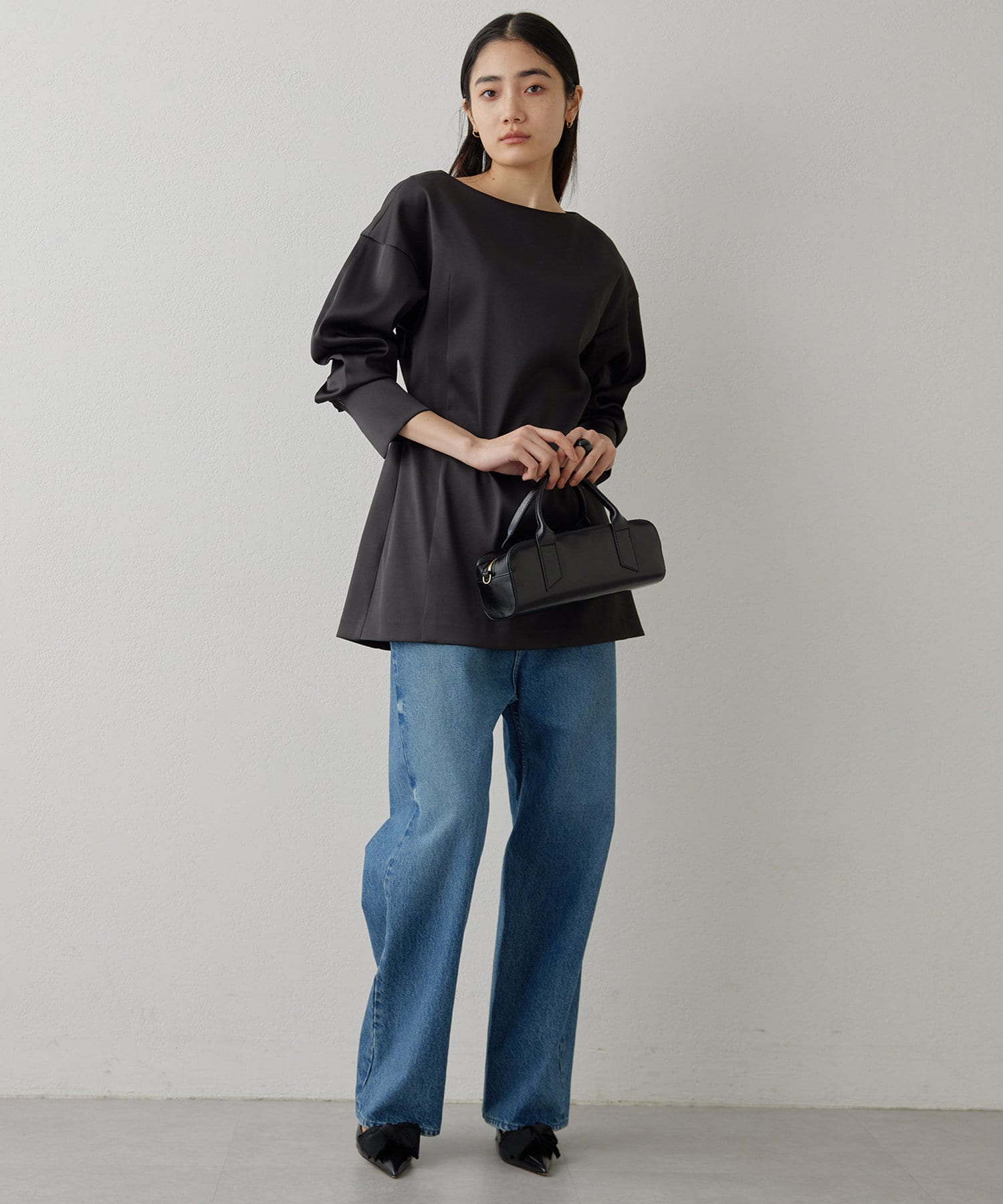 ■ストレッチ性のあるサテン生地を使用したドルマンブラウス。