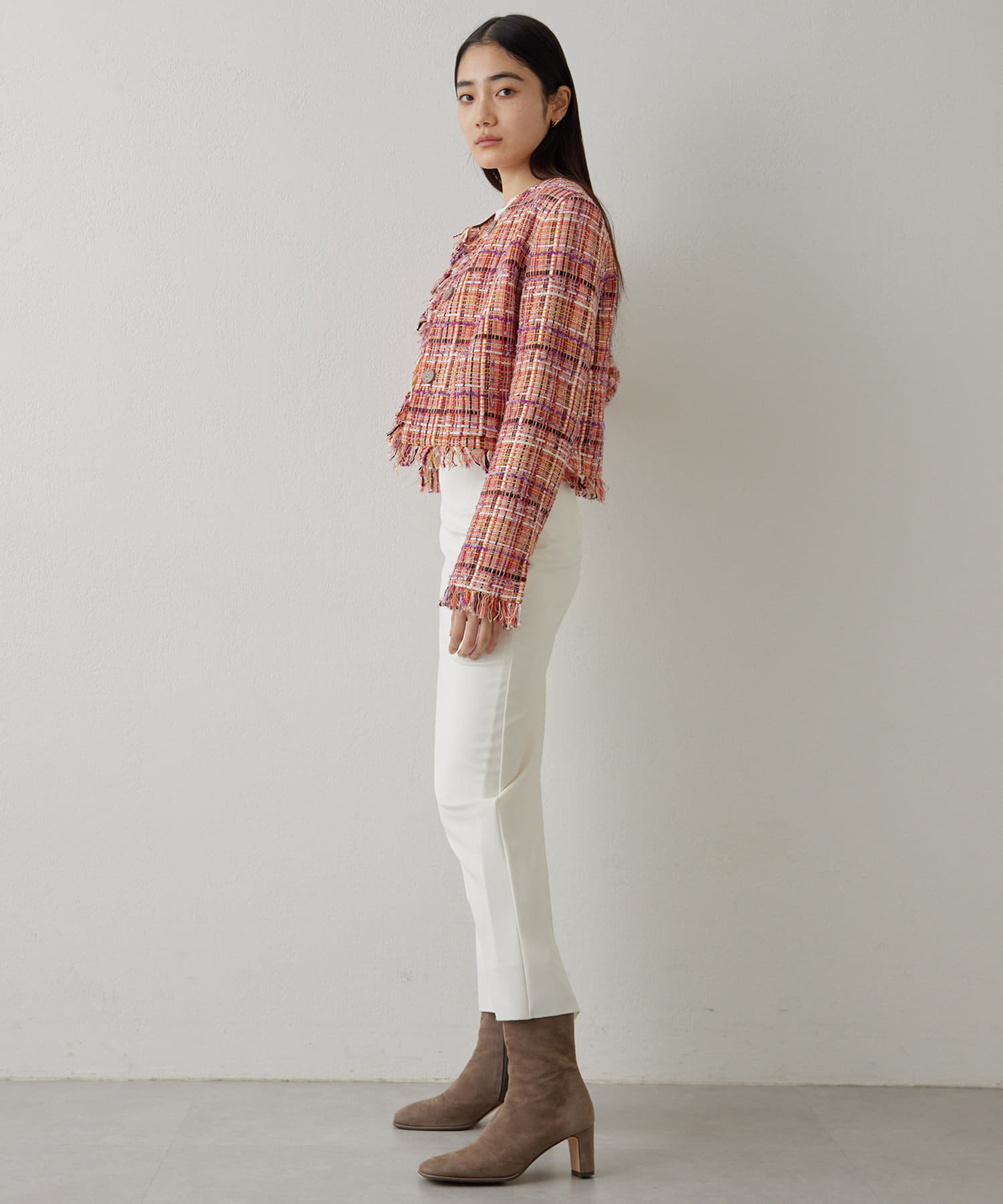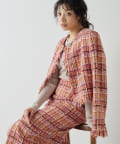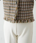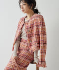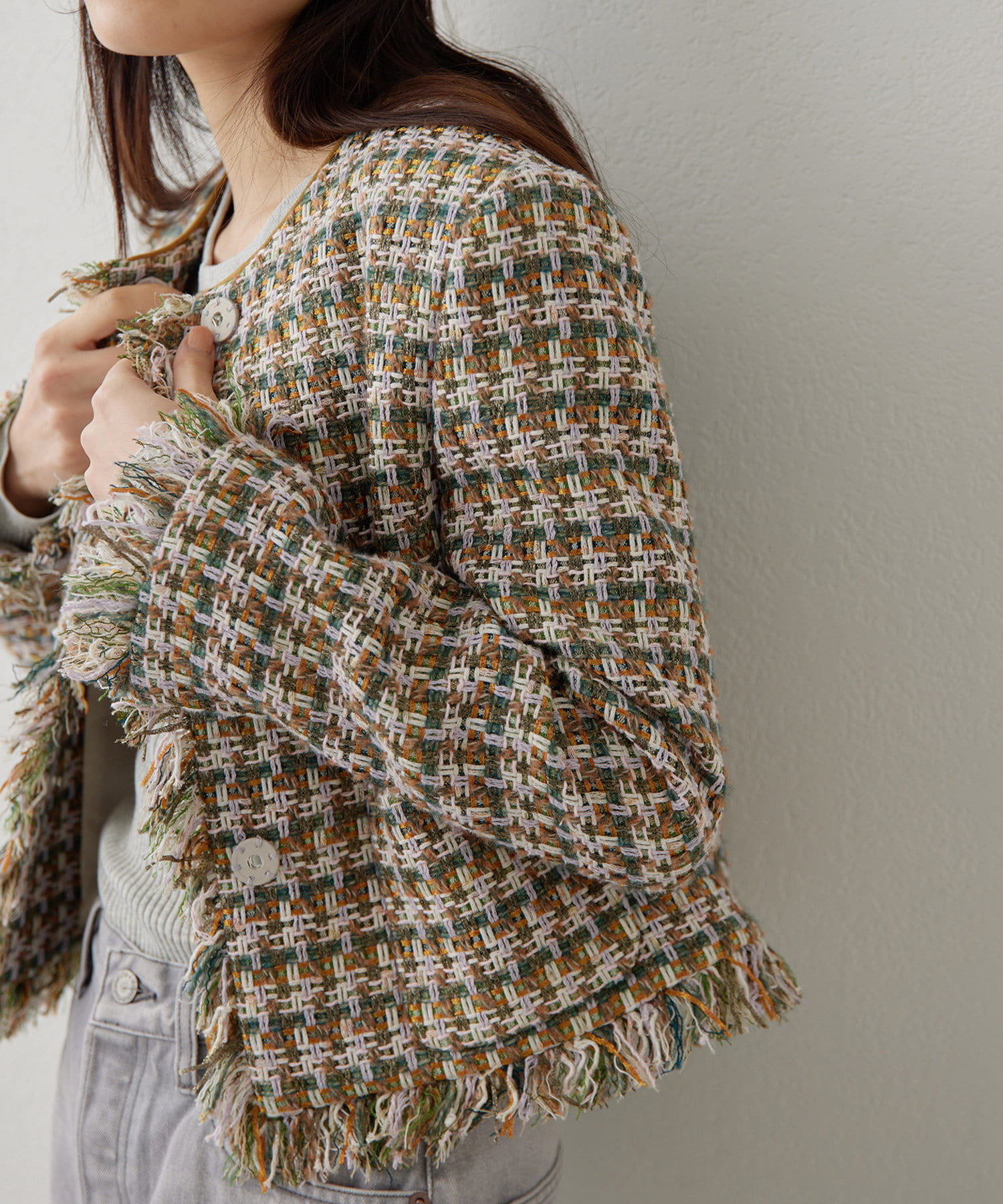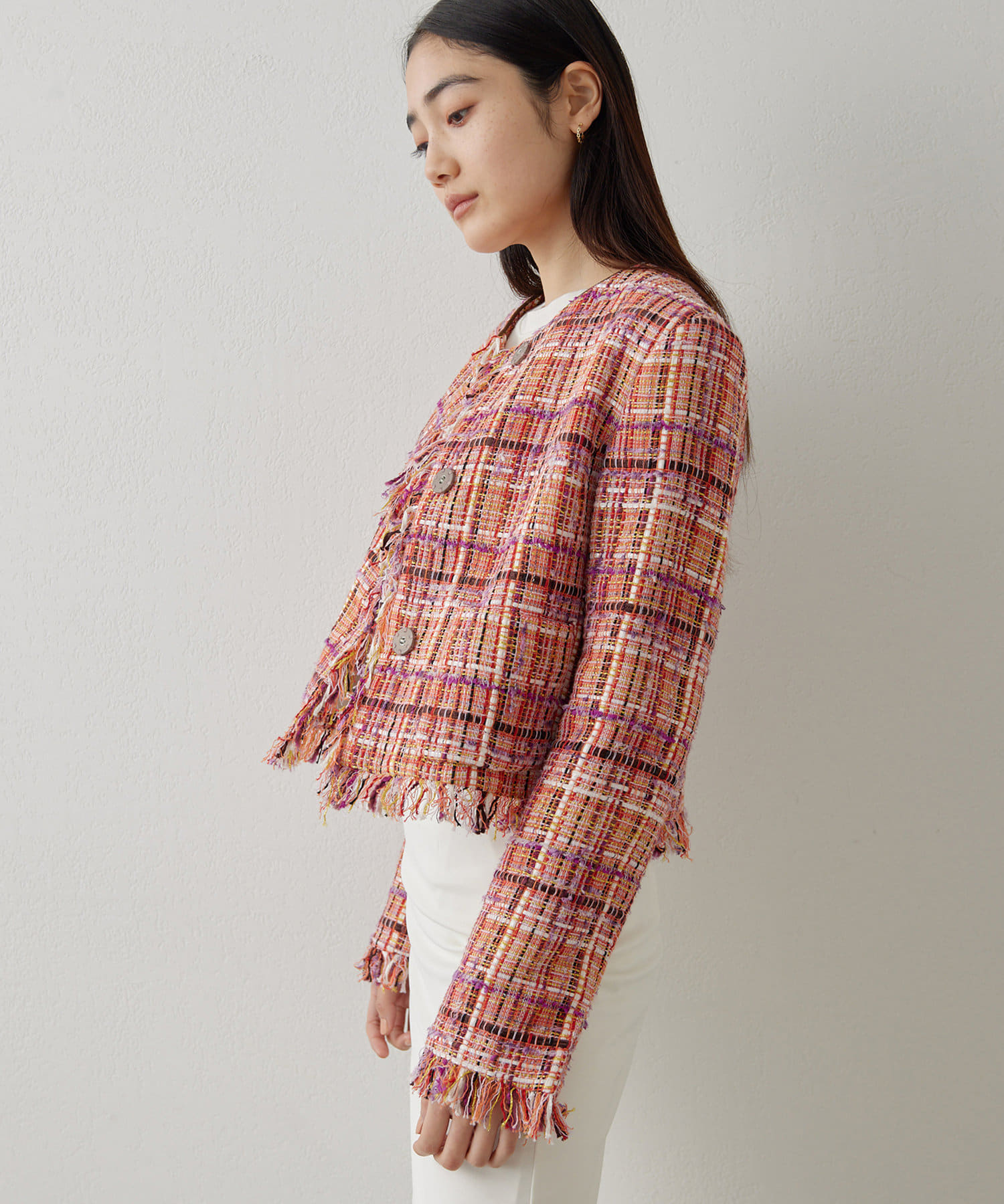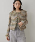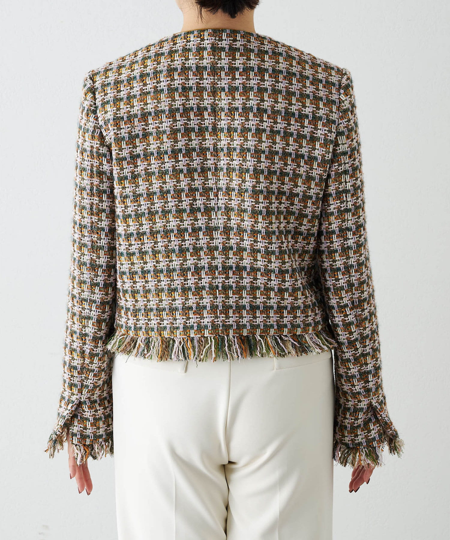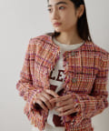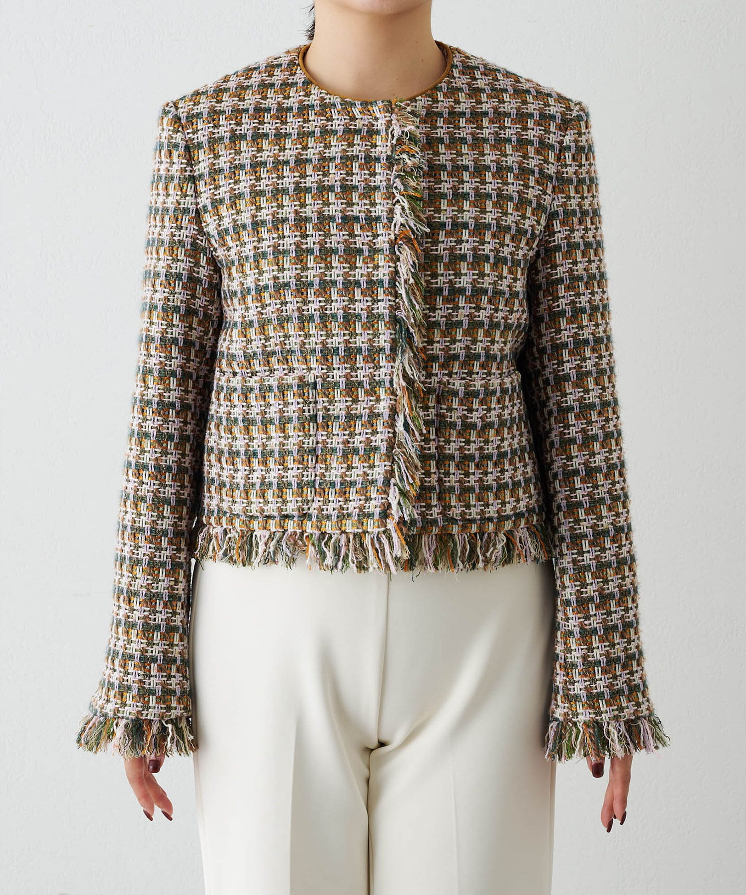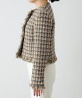■LINTON社のツイード生地を贅沢に使用したノーカラージャケット。