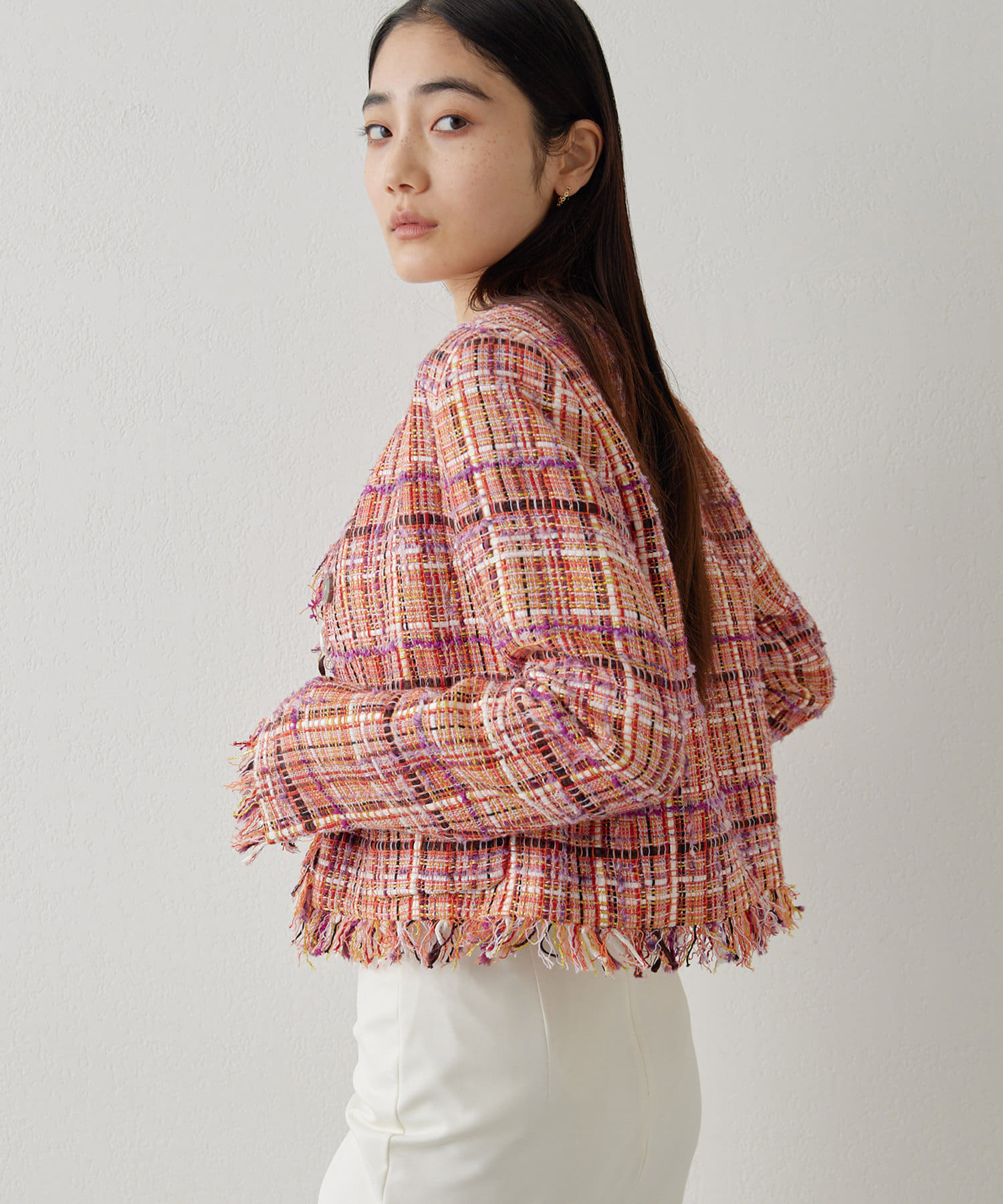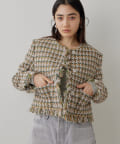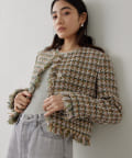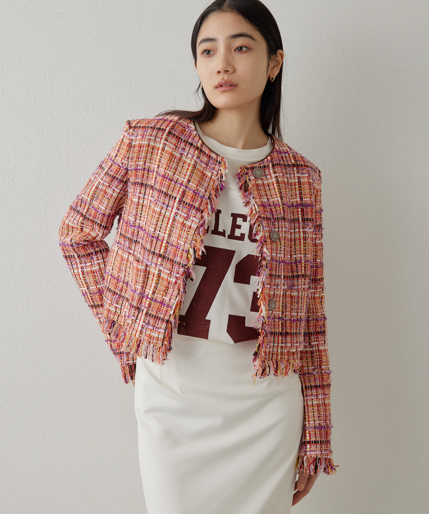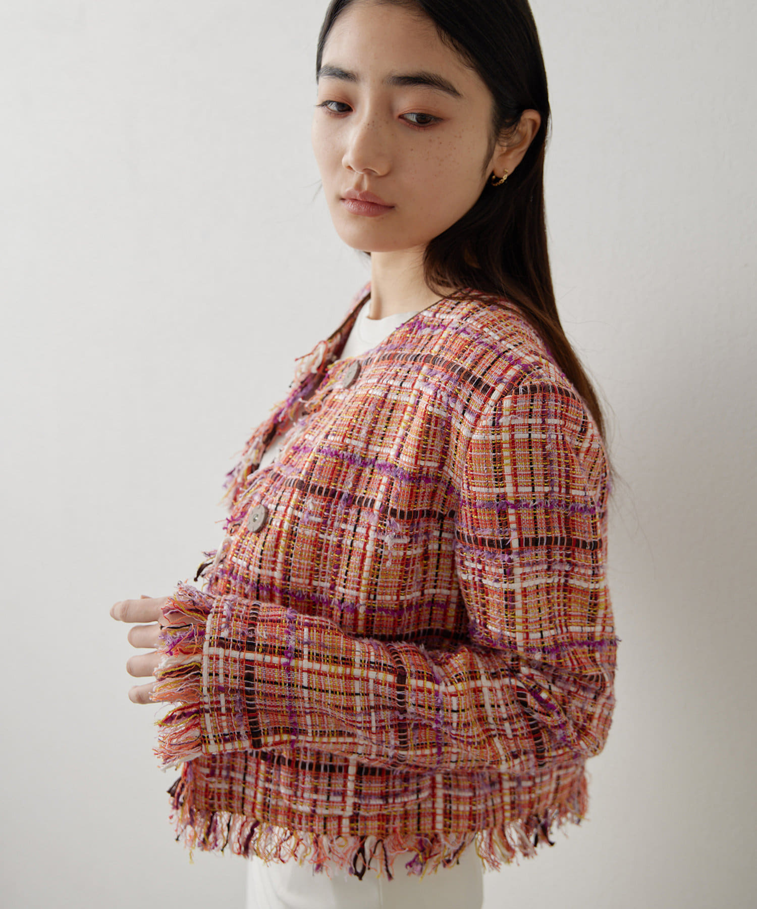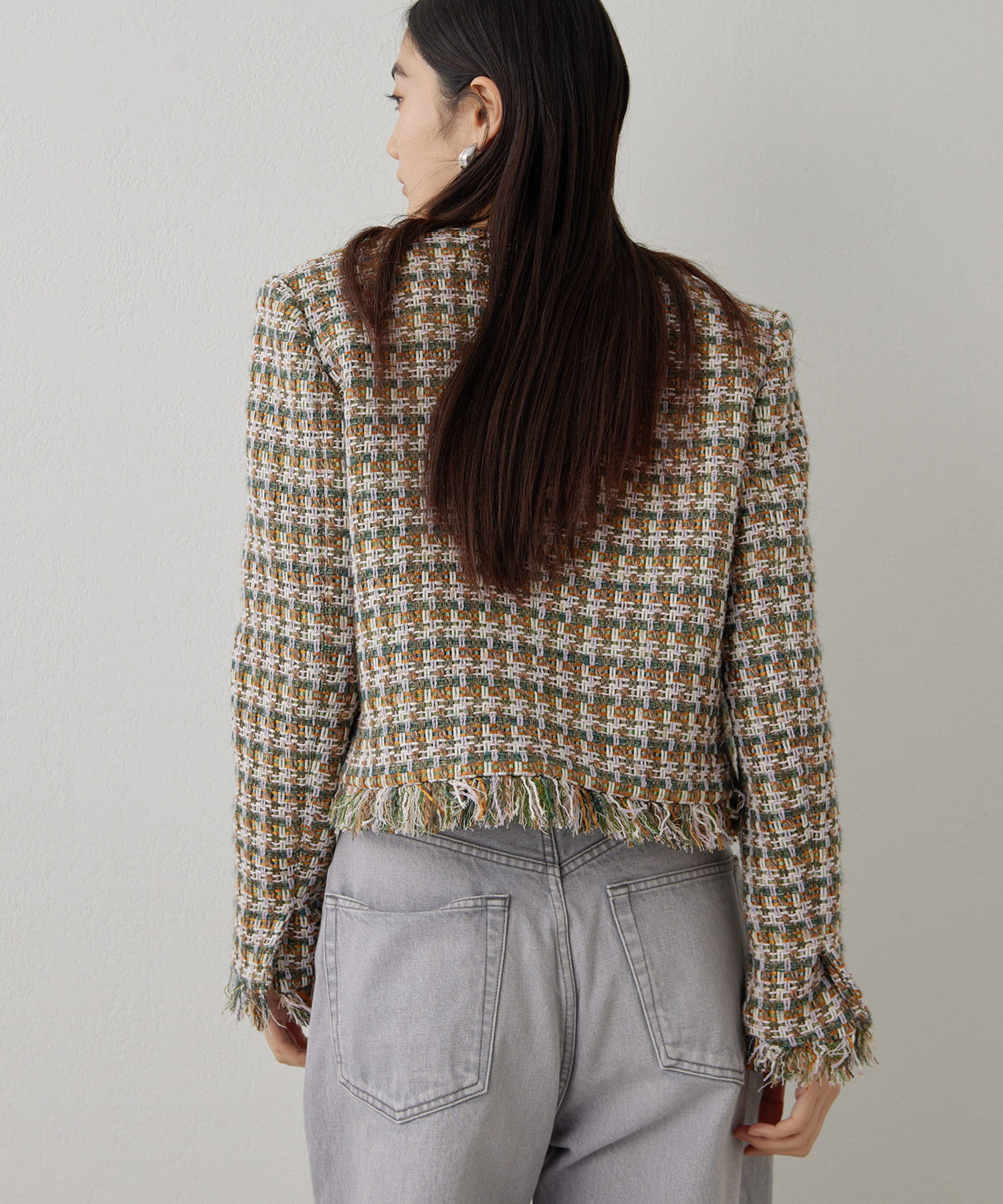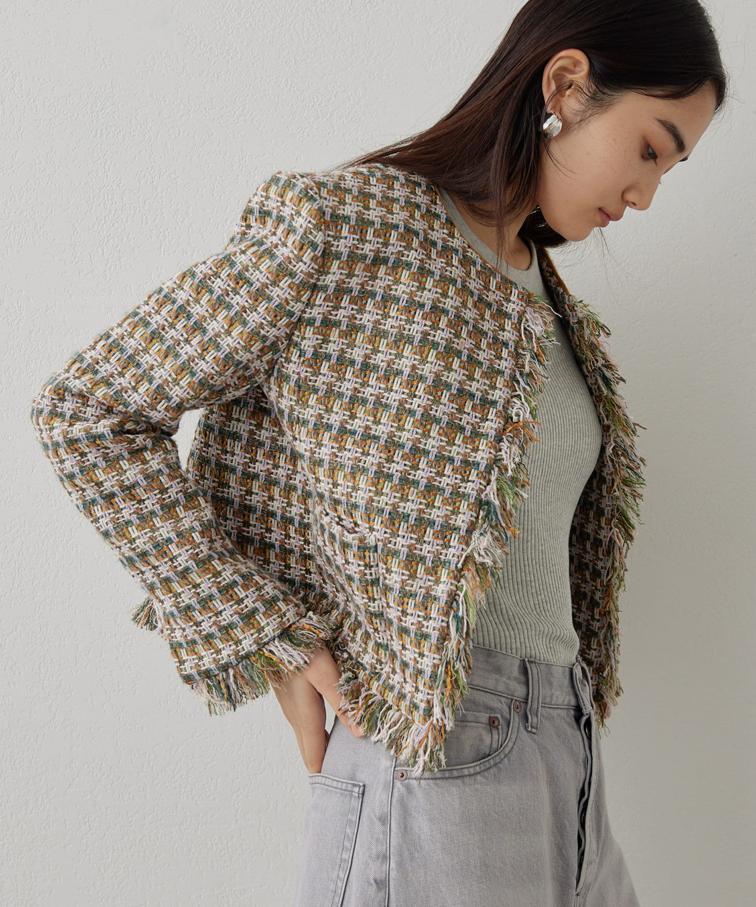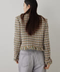 ■LINTON社のツイード生地を贅沢に使用したノーカラージャケット。