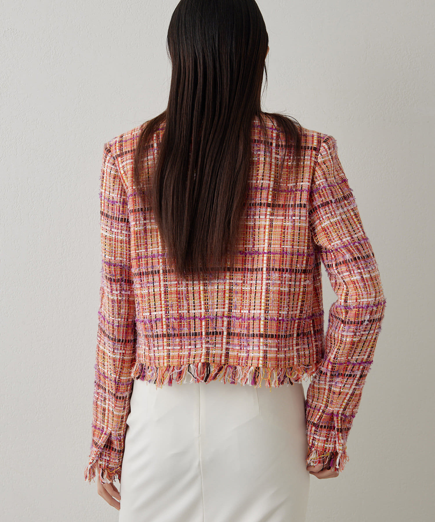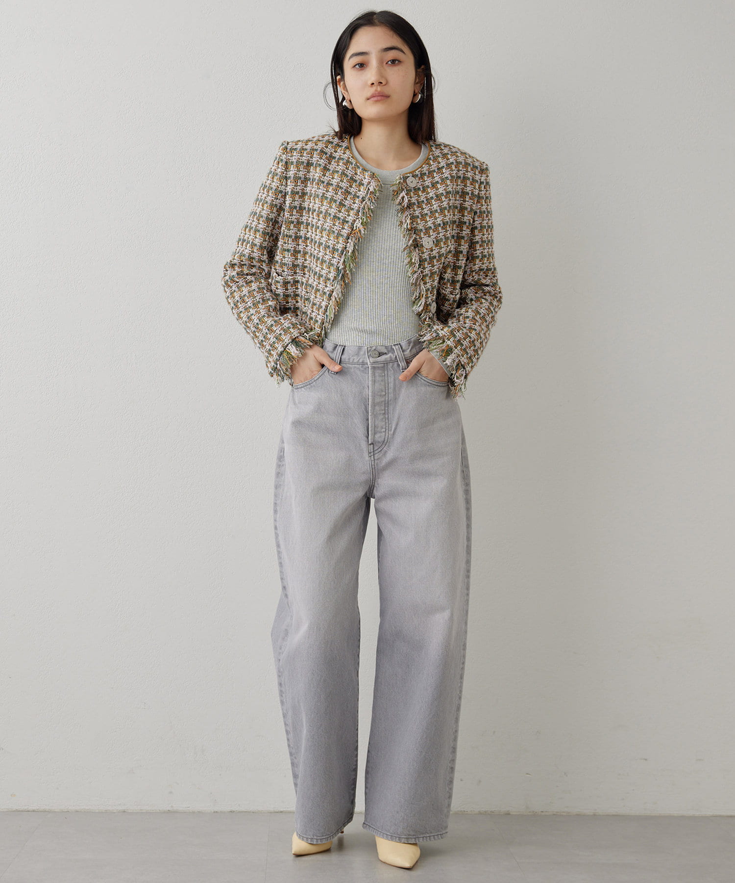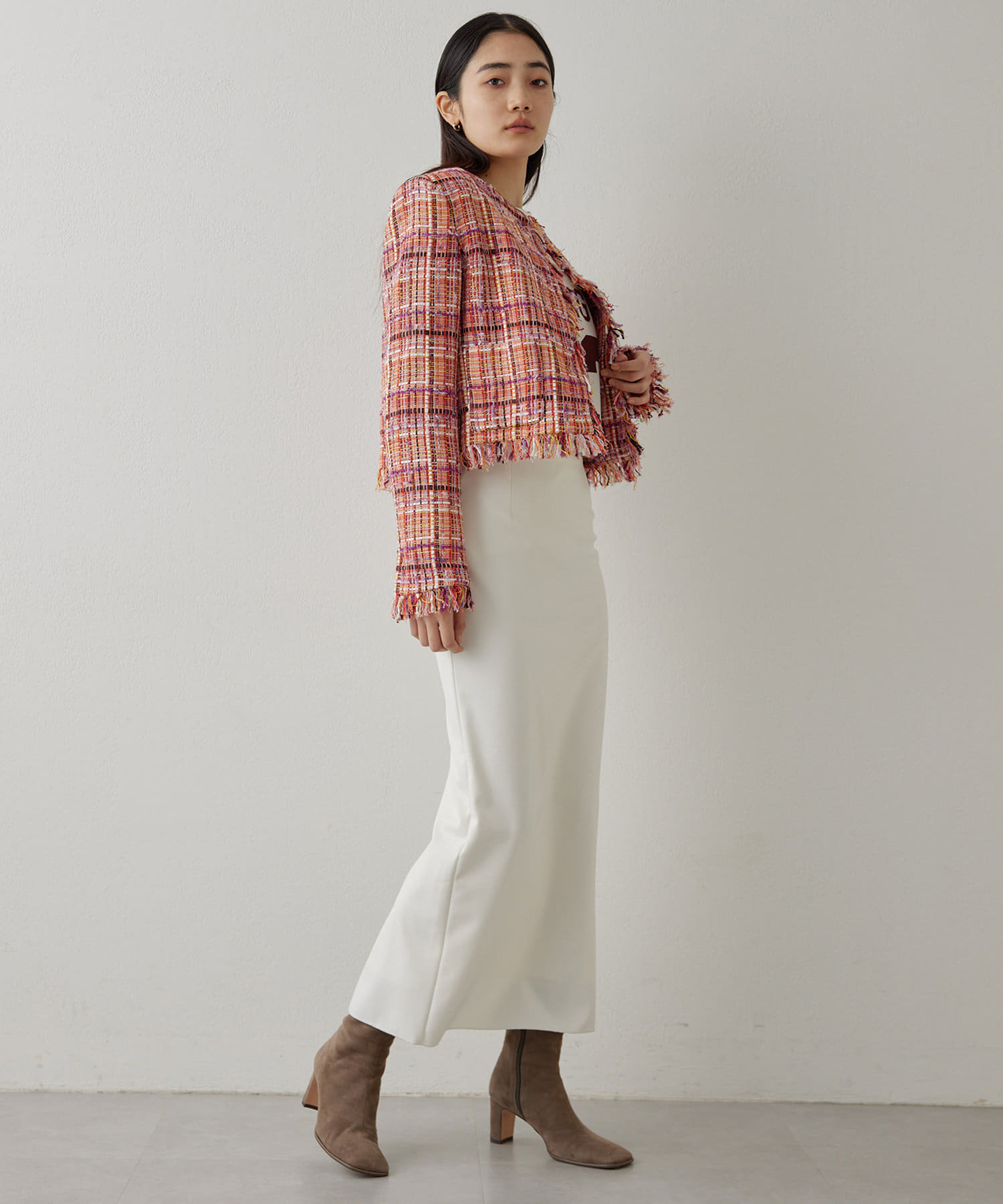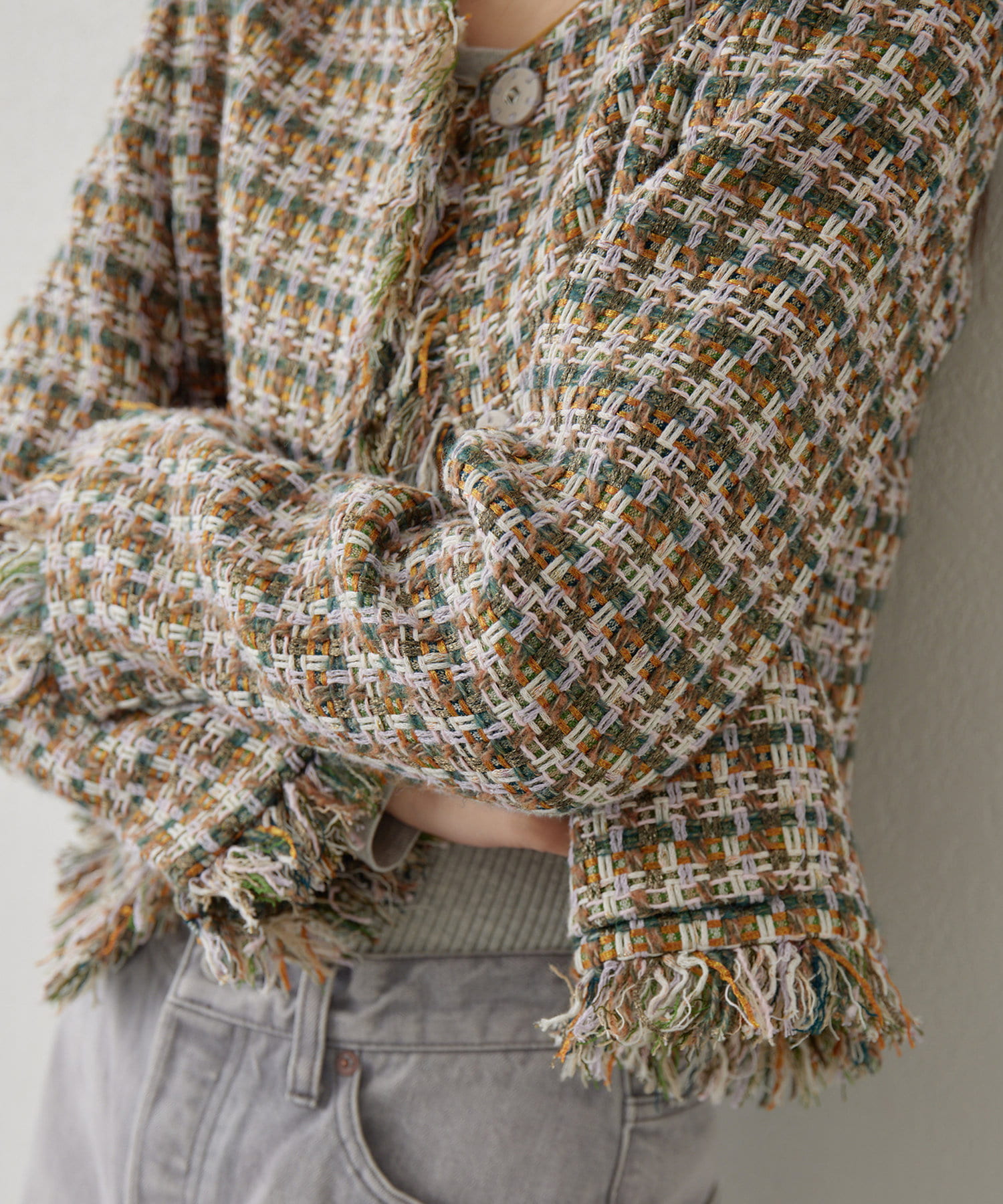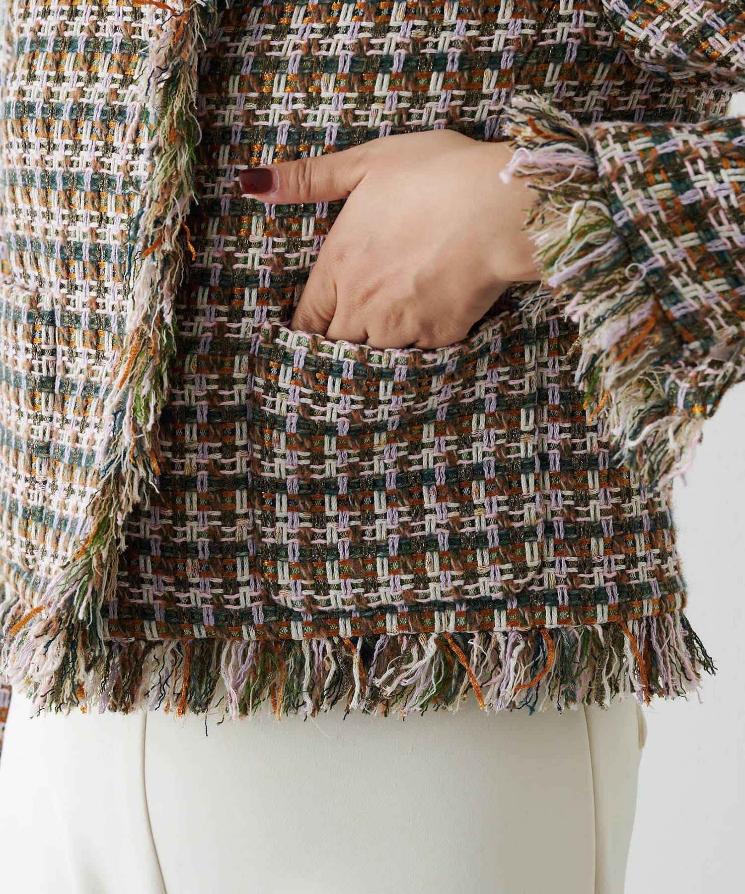 ■LINTON社のツイード生地を贅沢に使用したノーカラージャケット。