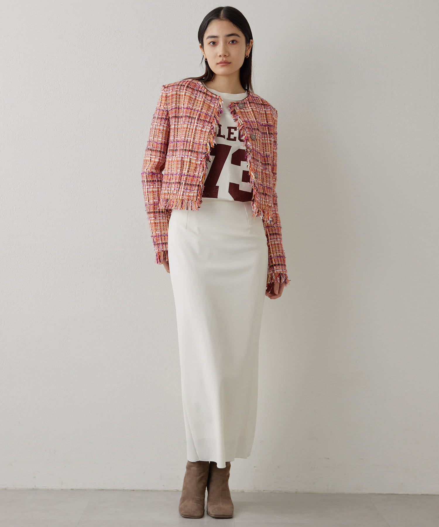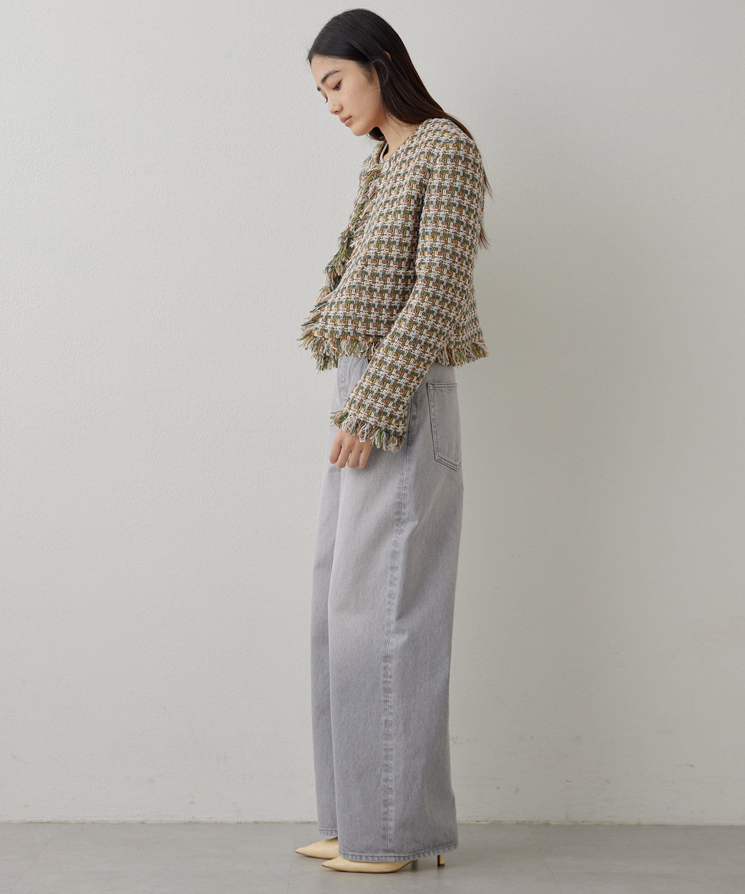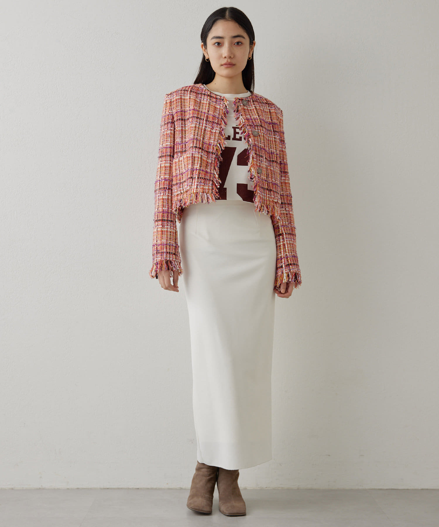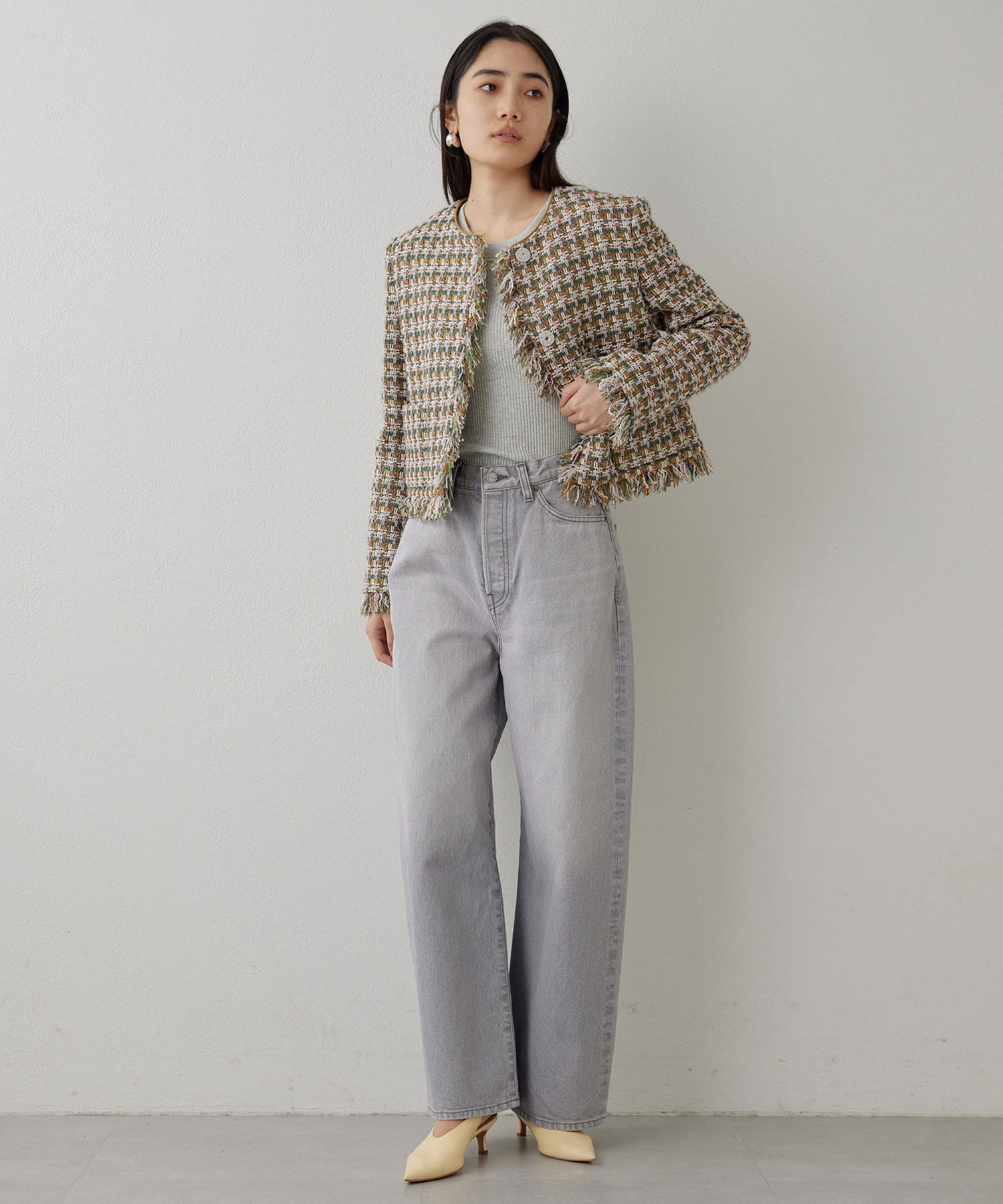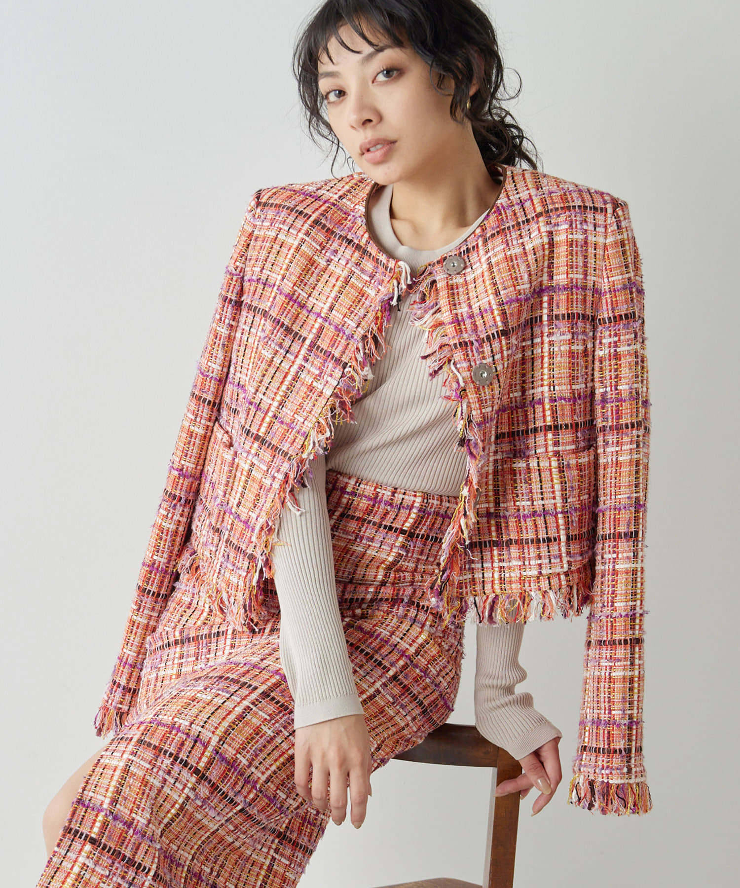 ■LINTON社のツイード生地を贅沢に使用したノーカラージャケット。