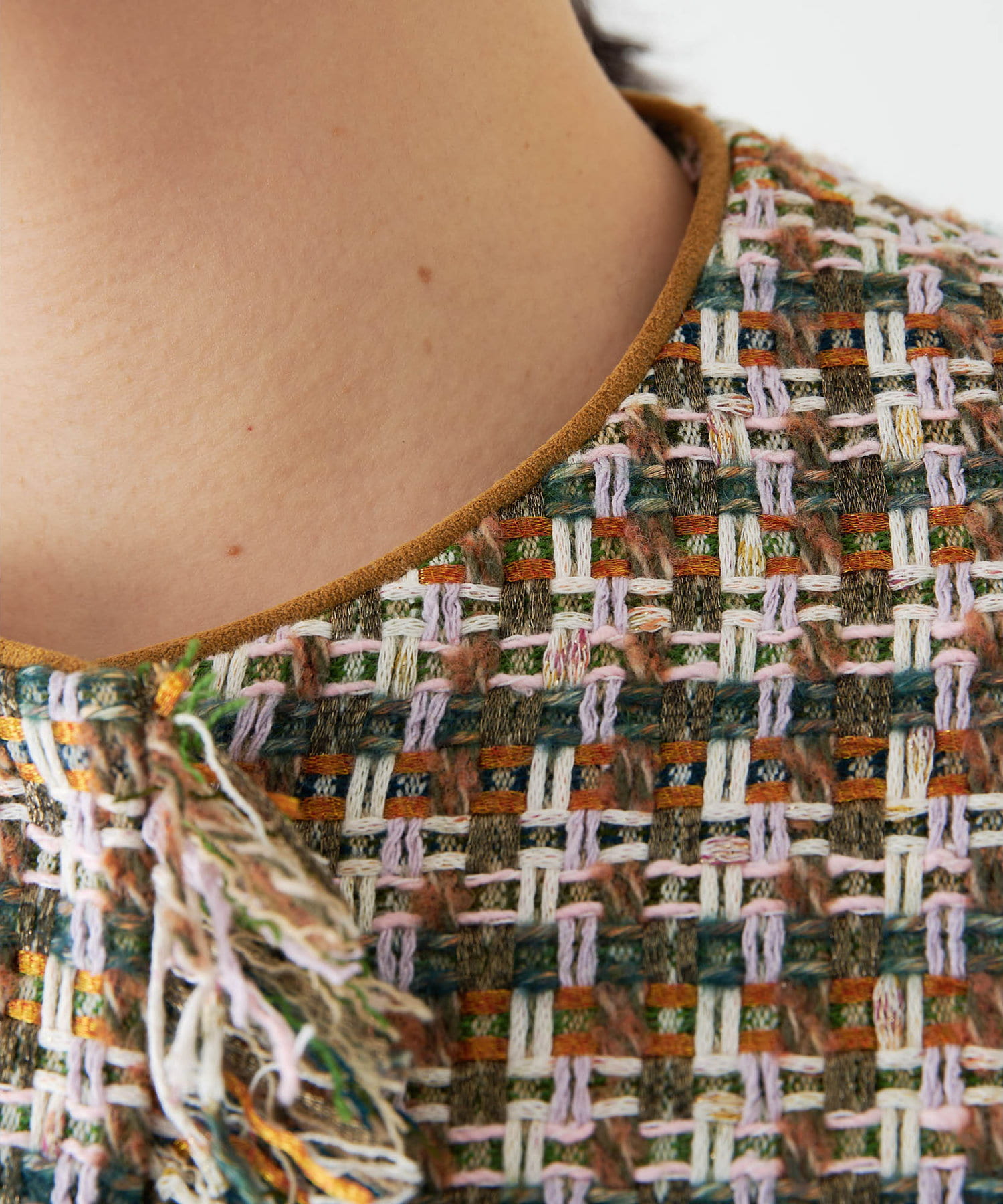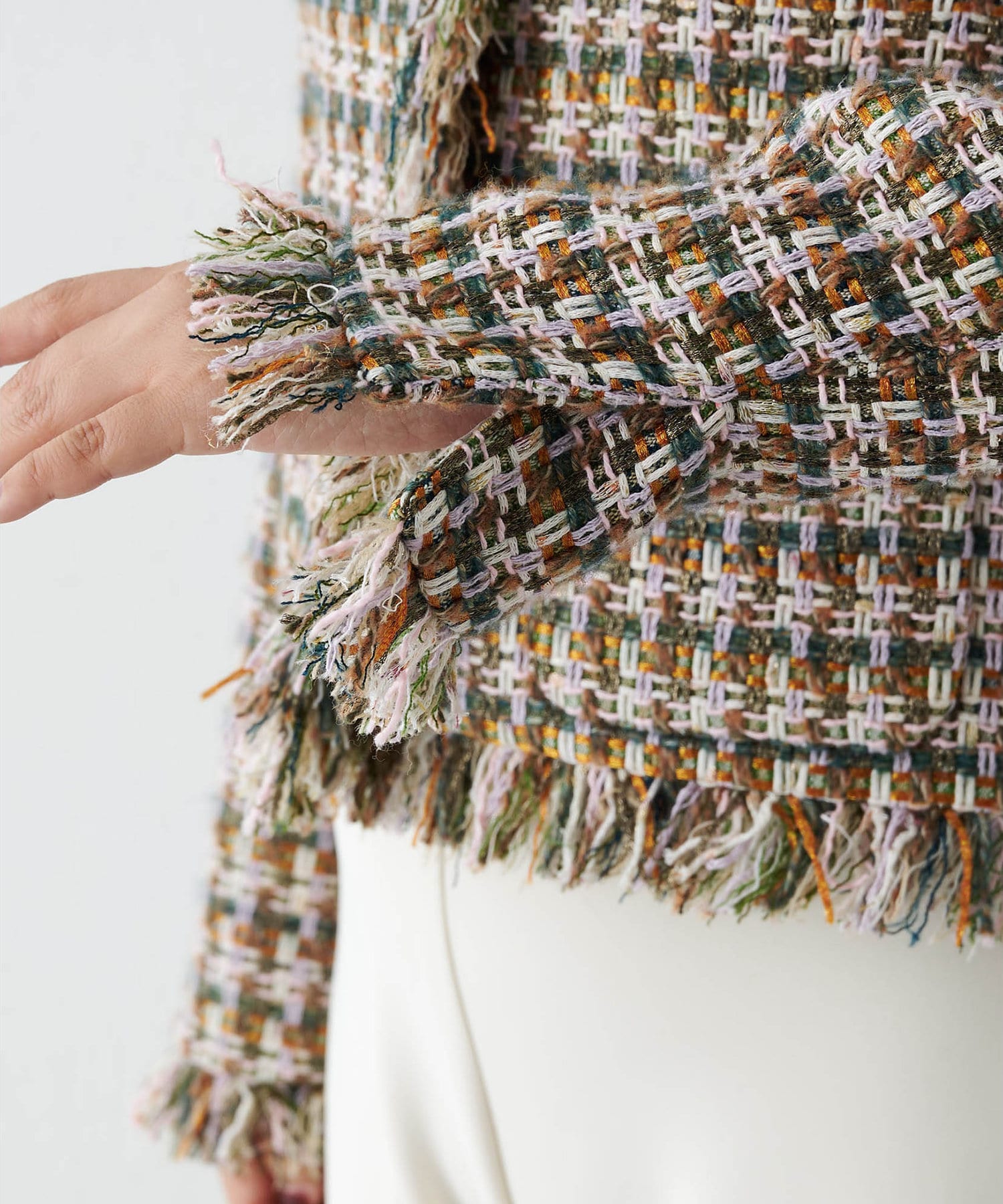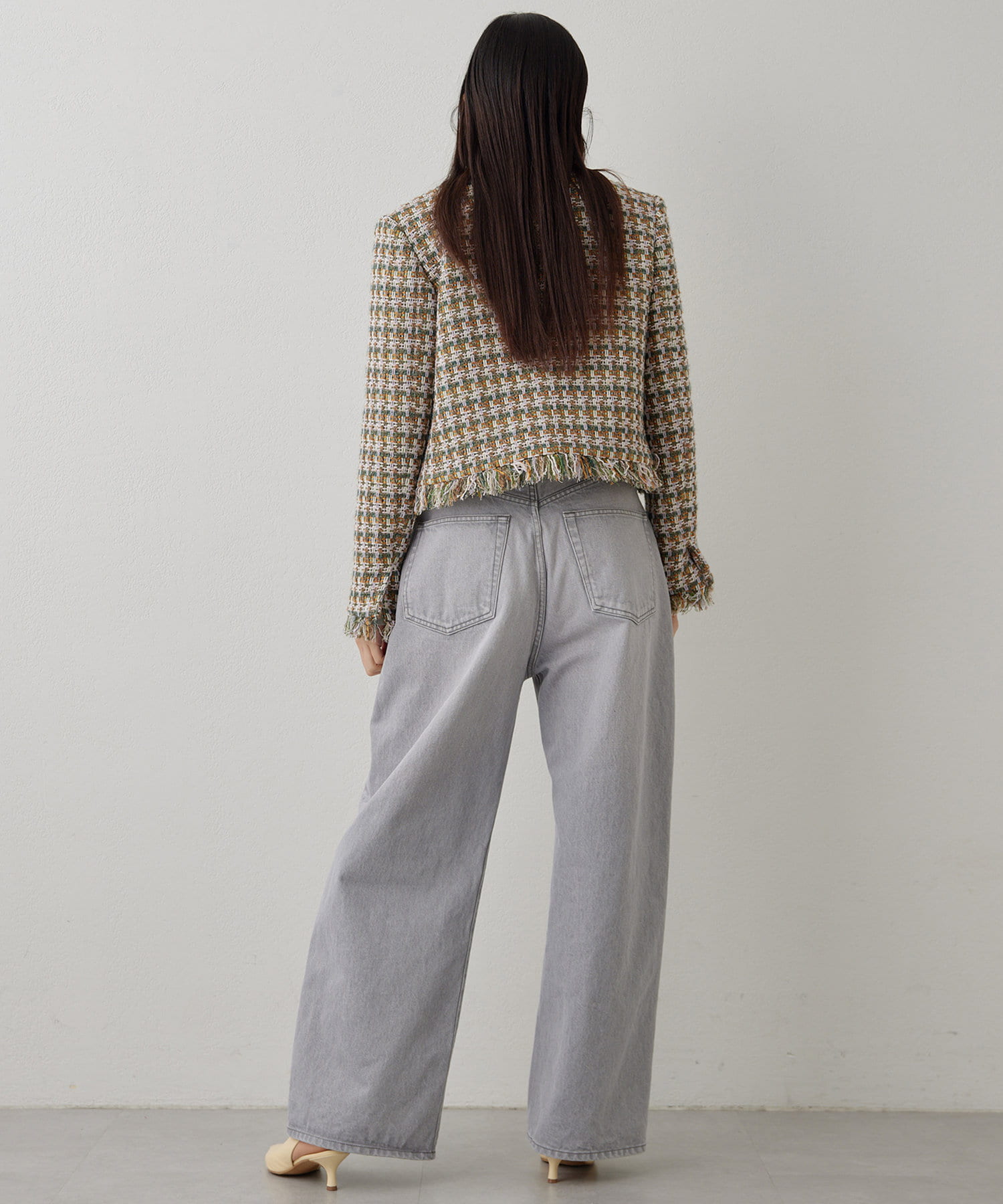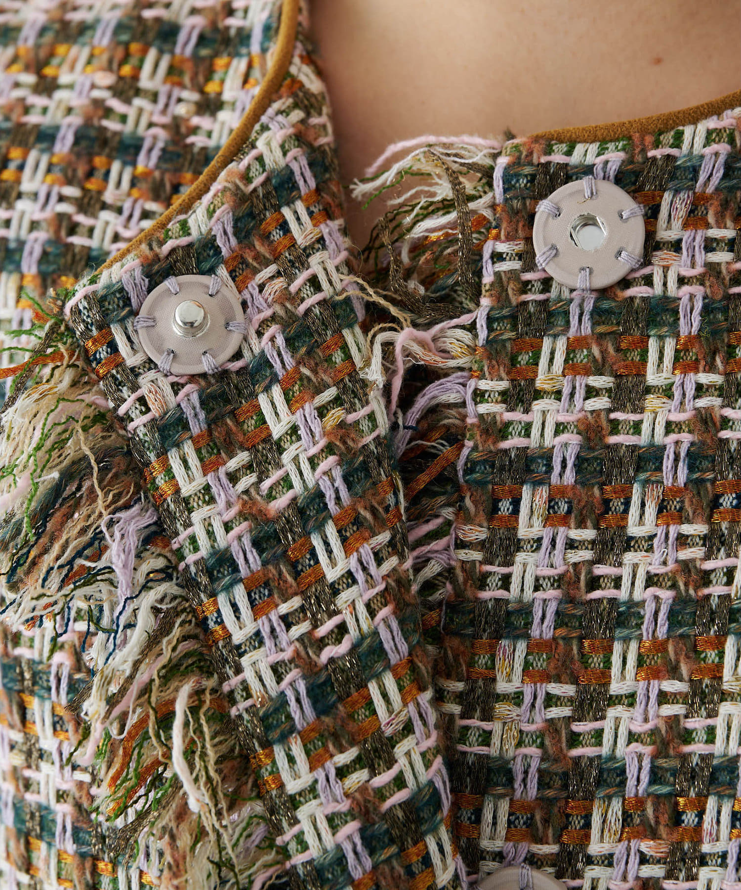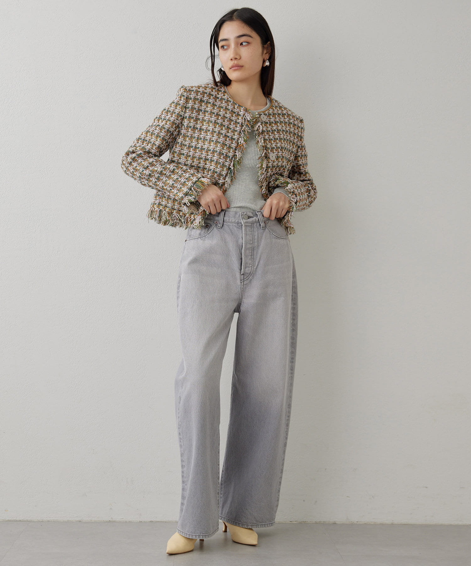 ■LINTON社のツイード生地を贅沢に使用したノーカラージャケット。
