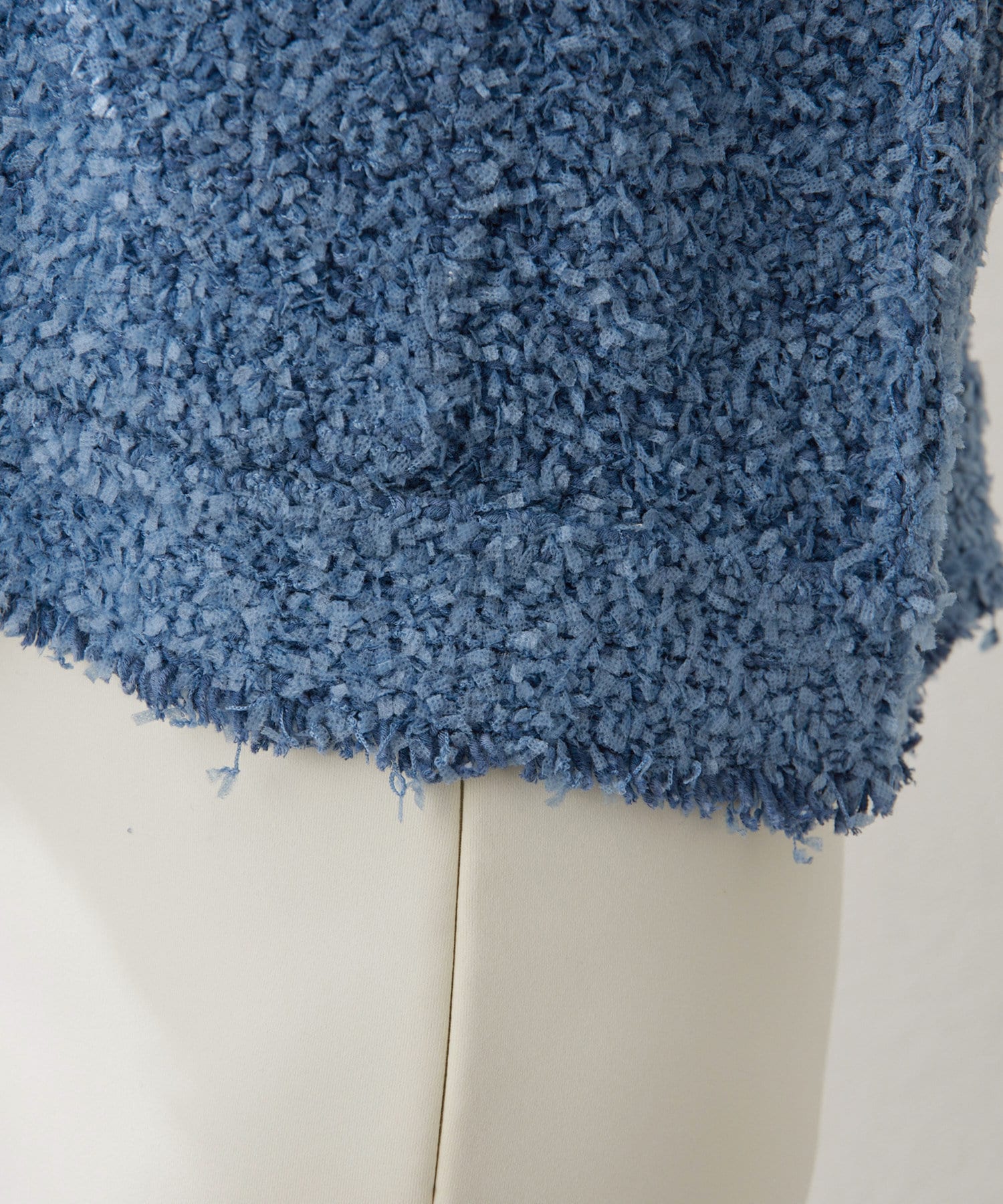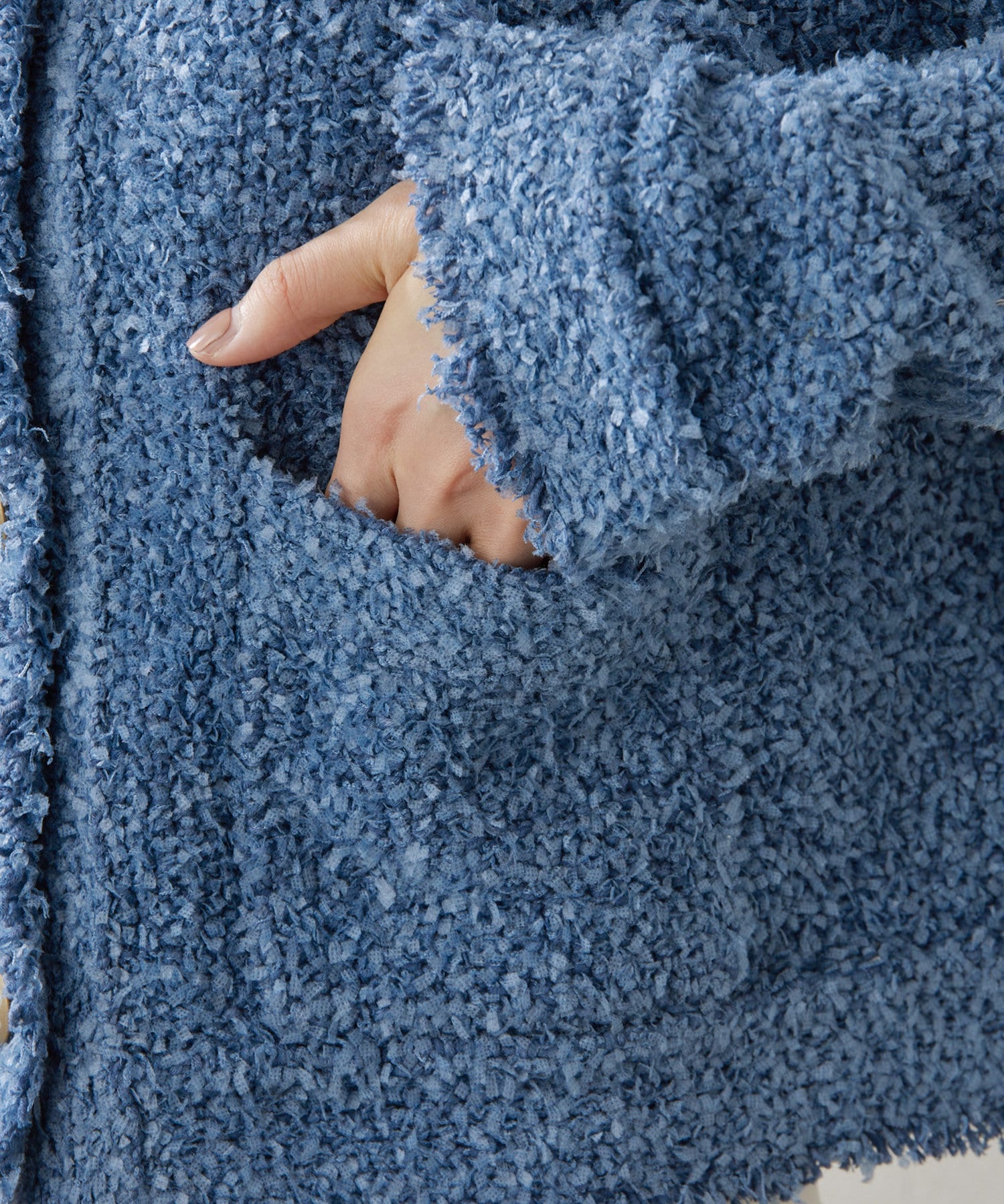 ツイード調の表情が出る様に2種類のモールとベースのストレッチ糸を合わせ、編地の雰囲気と実用性を兼ね備えた素材。