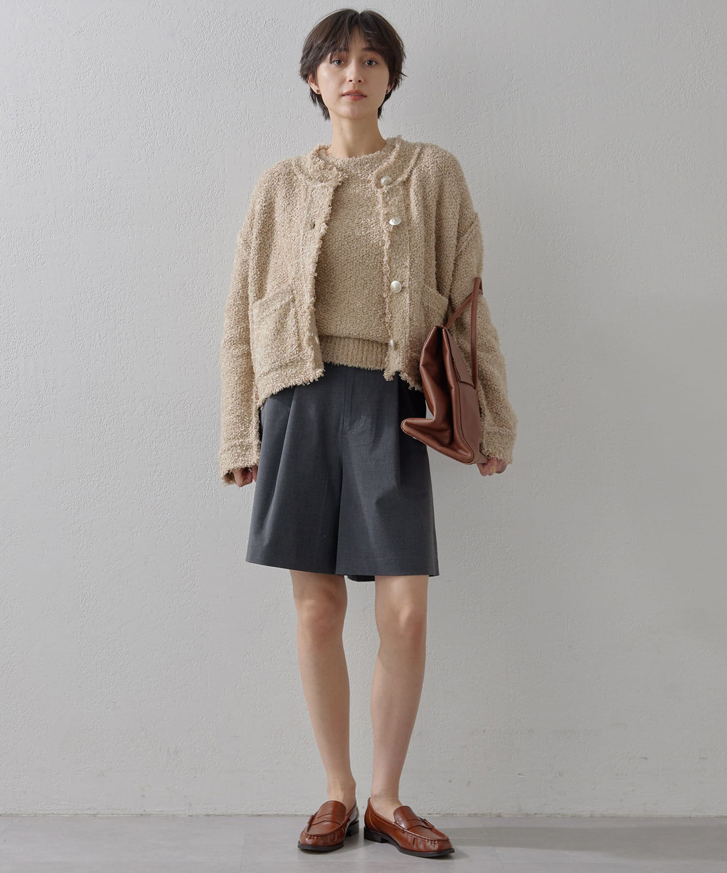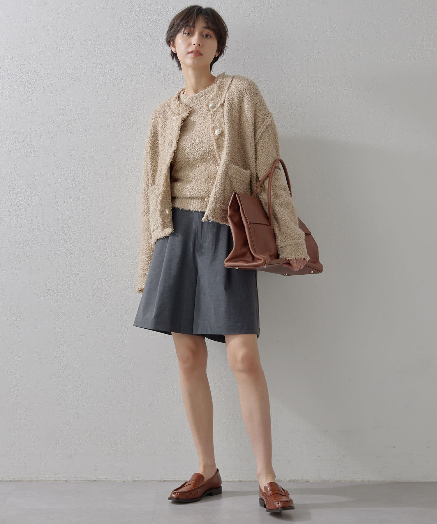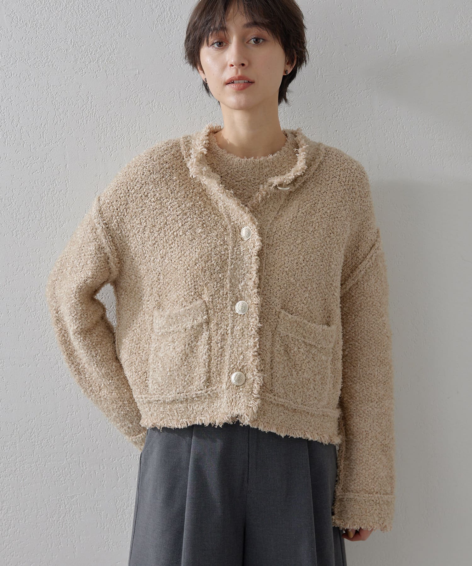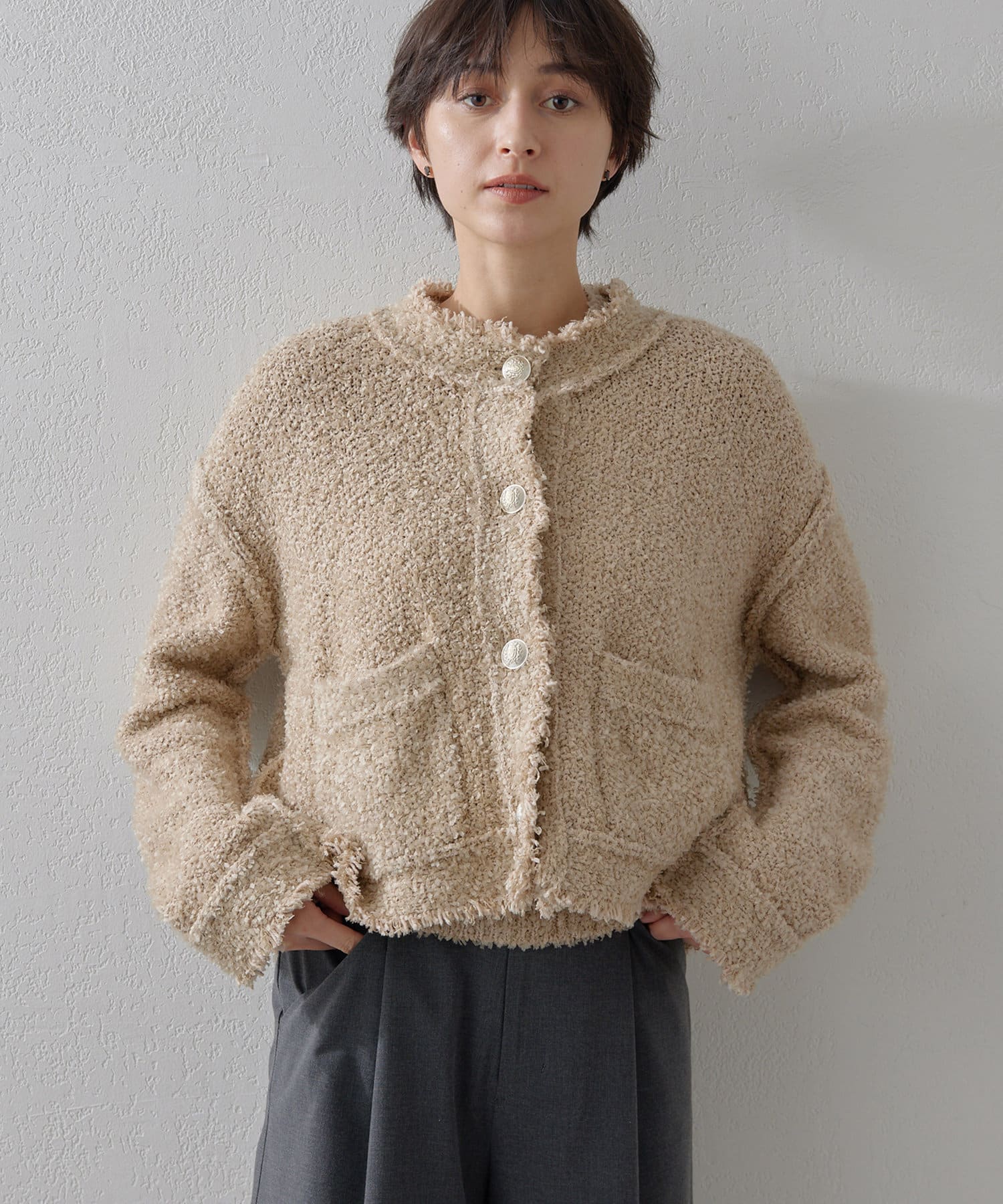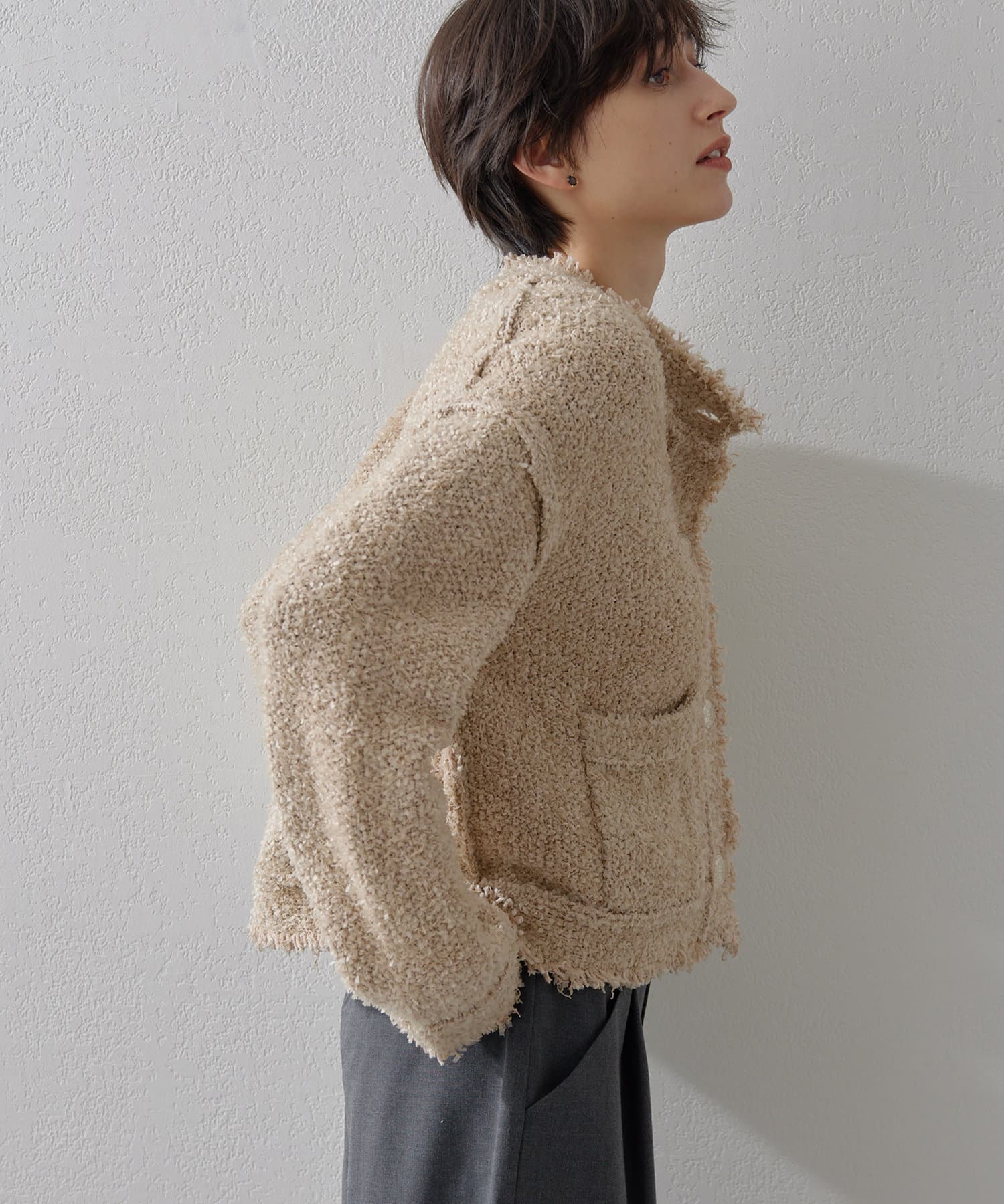 ツイードジャケットのように楽しめるニットジャケット