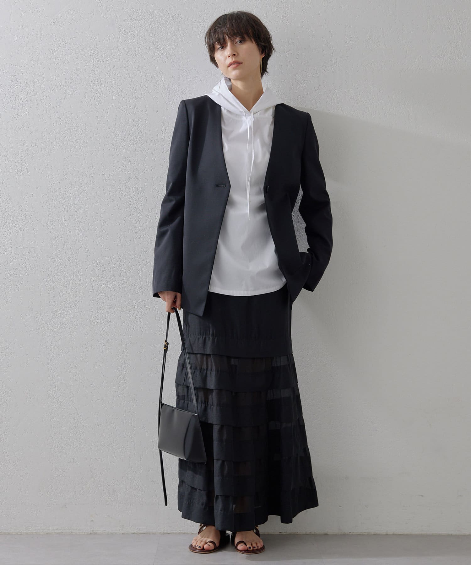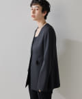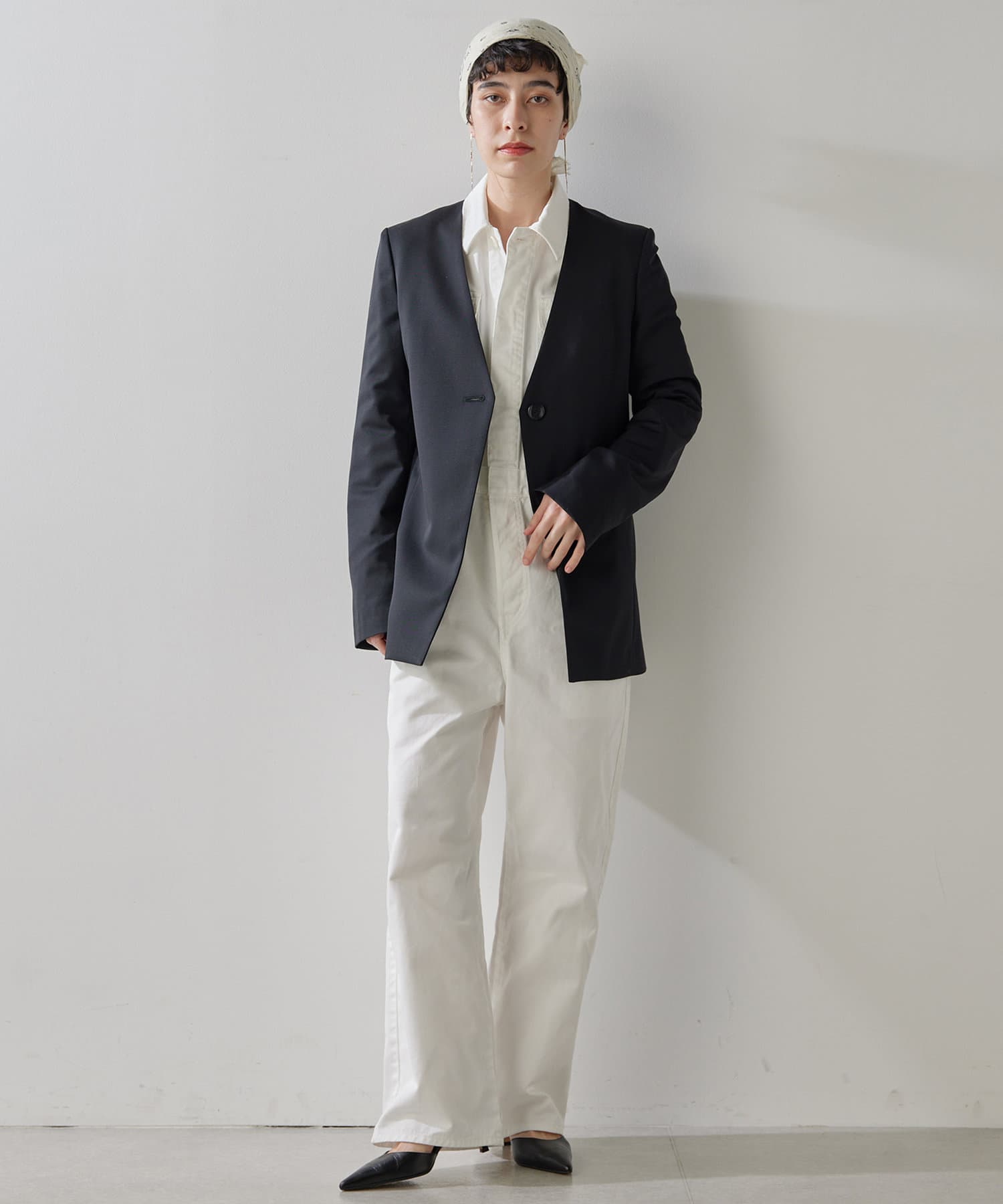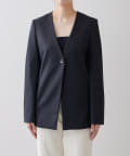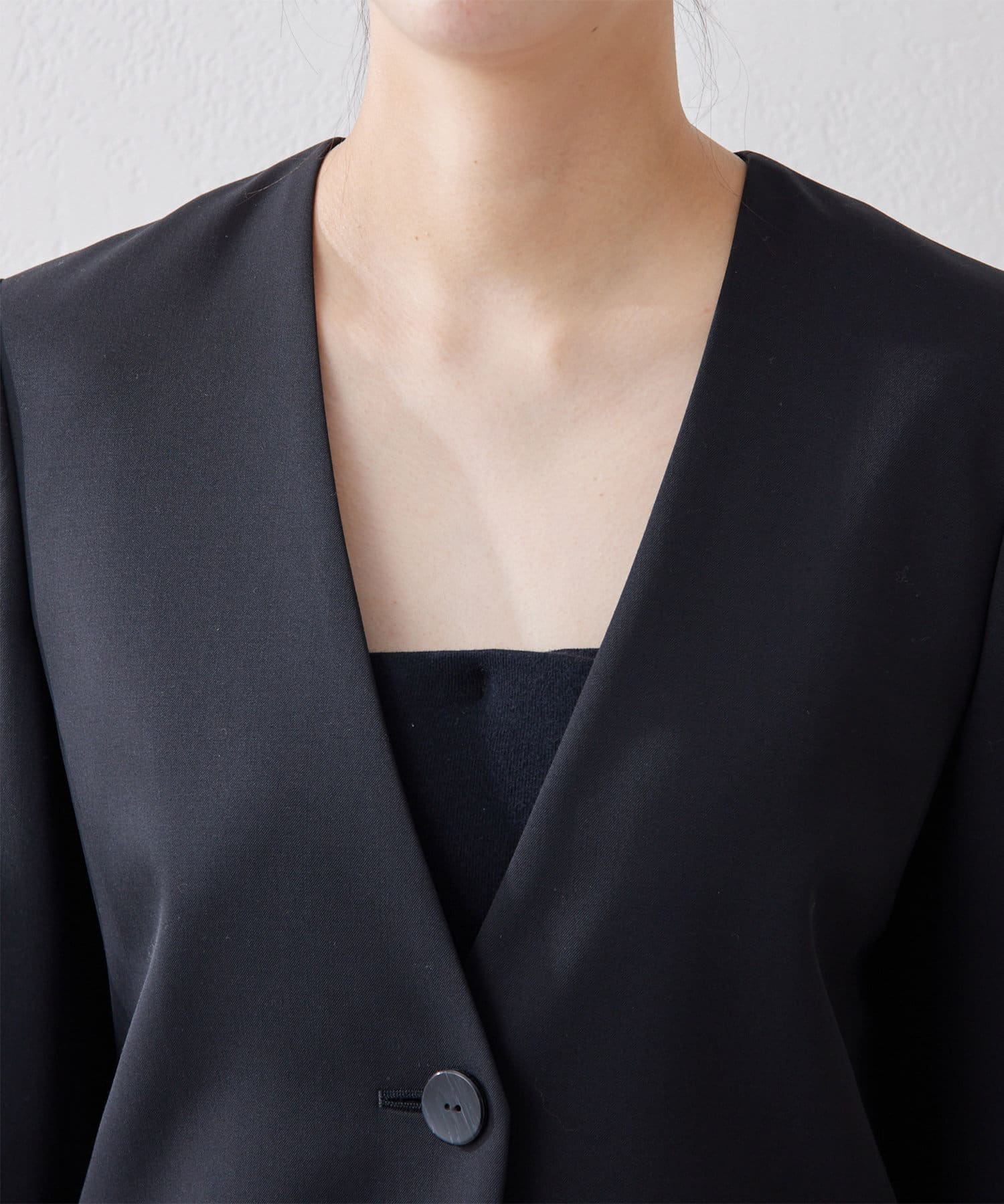 ■ノーカラーがすっきりとした印象のミニマルなジャケット。
