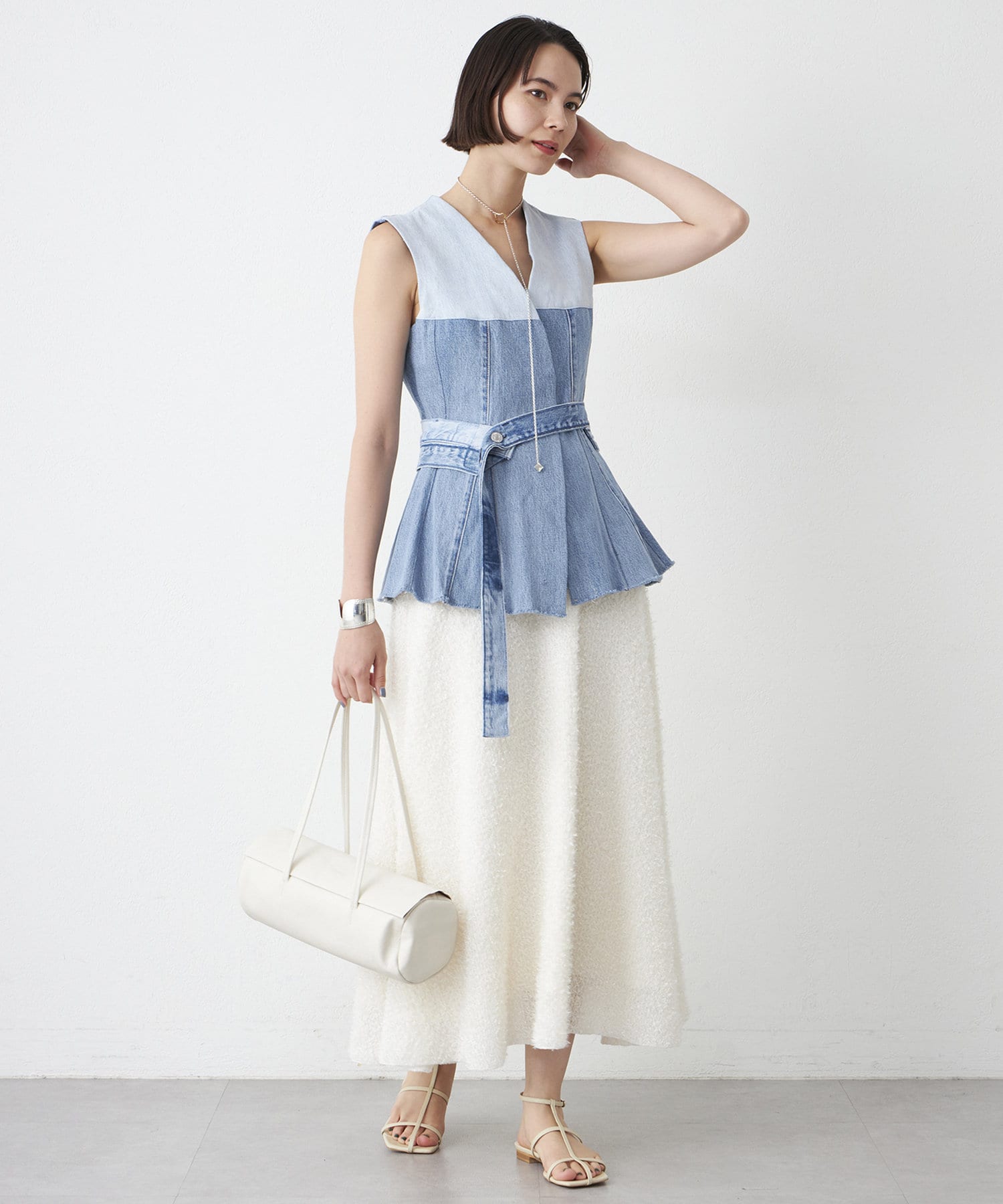 ■すっきりとしたウエストに、裾に向かって綺麗に広がるシルエットが女性らしい一枚。