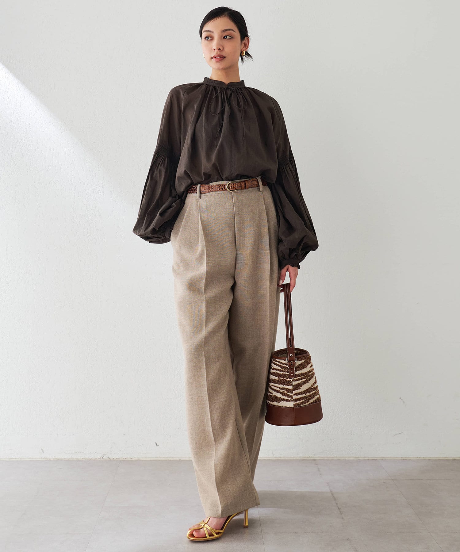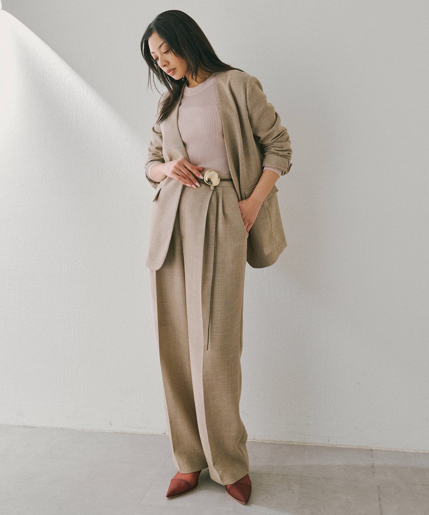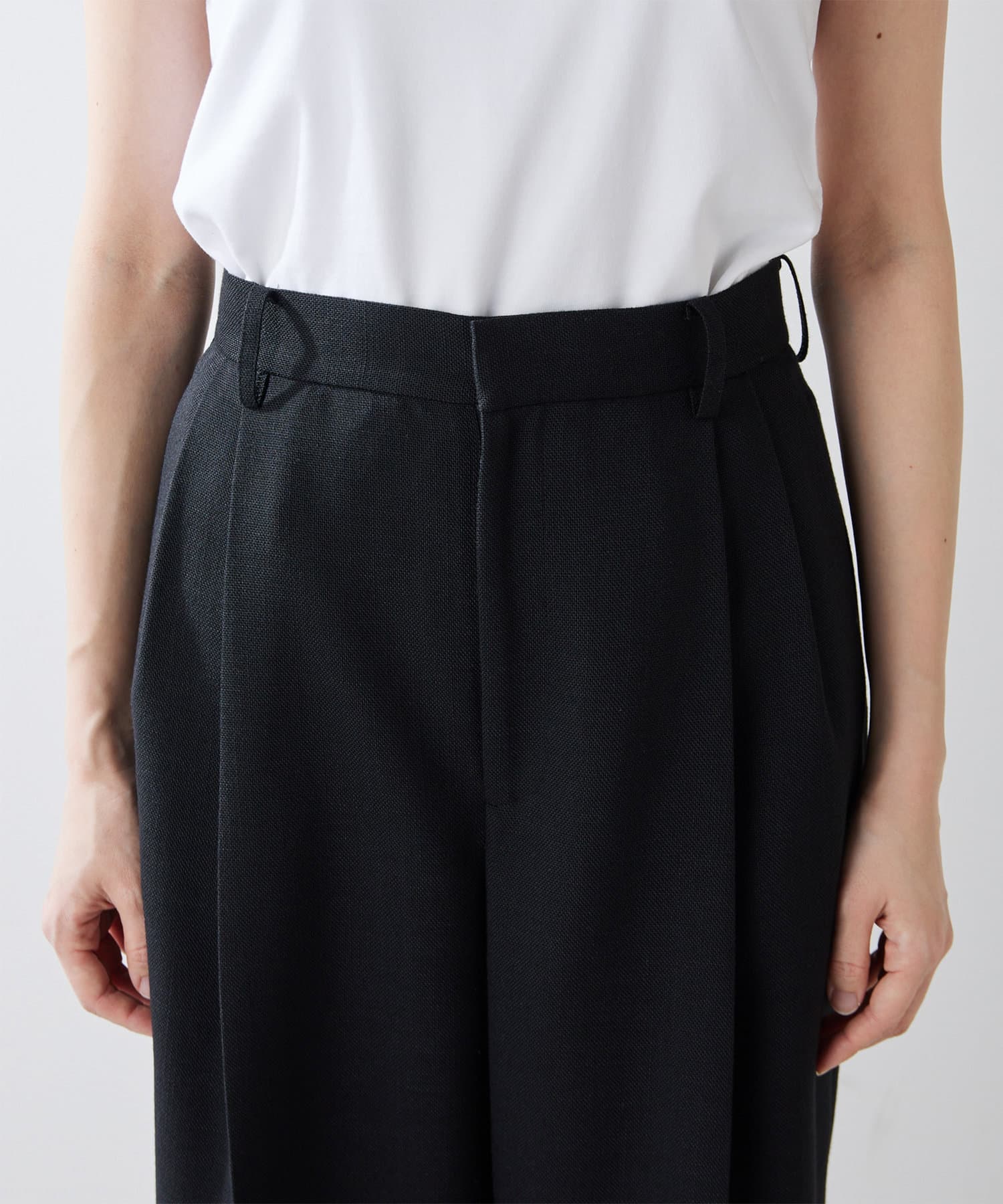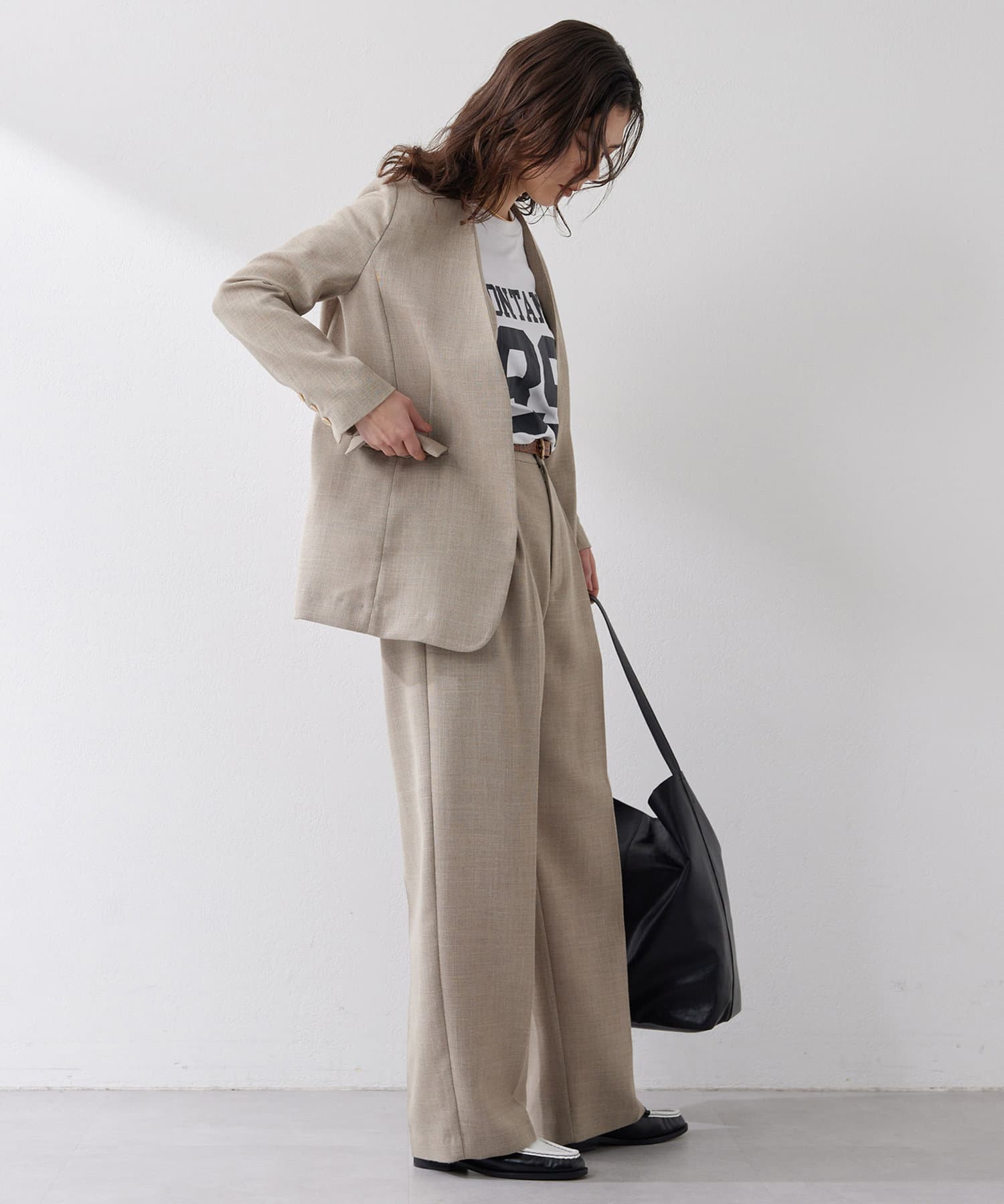 ■フロントの2タックで表現したたっぷりとしたシルエットが抜け感をプラス。