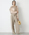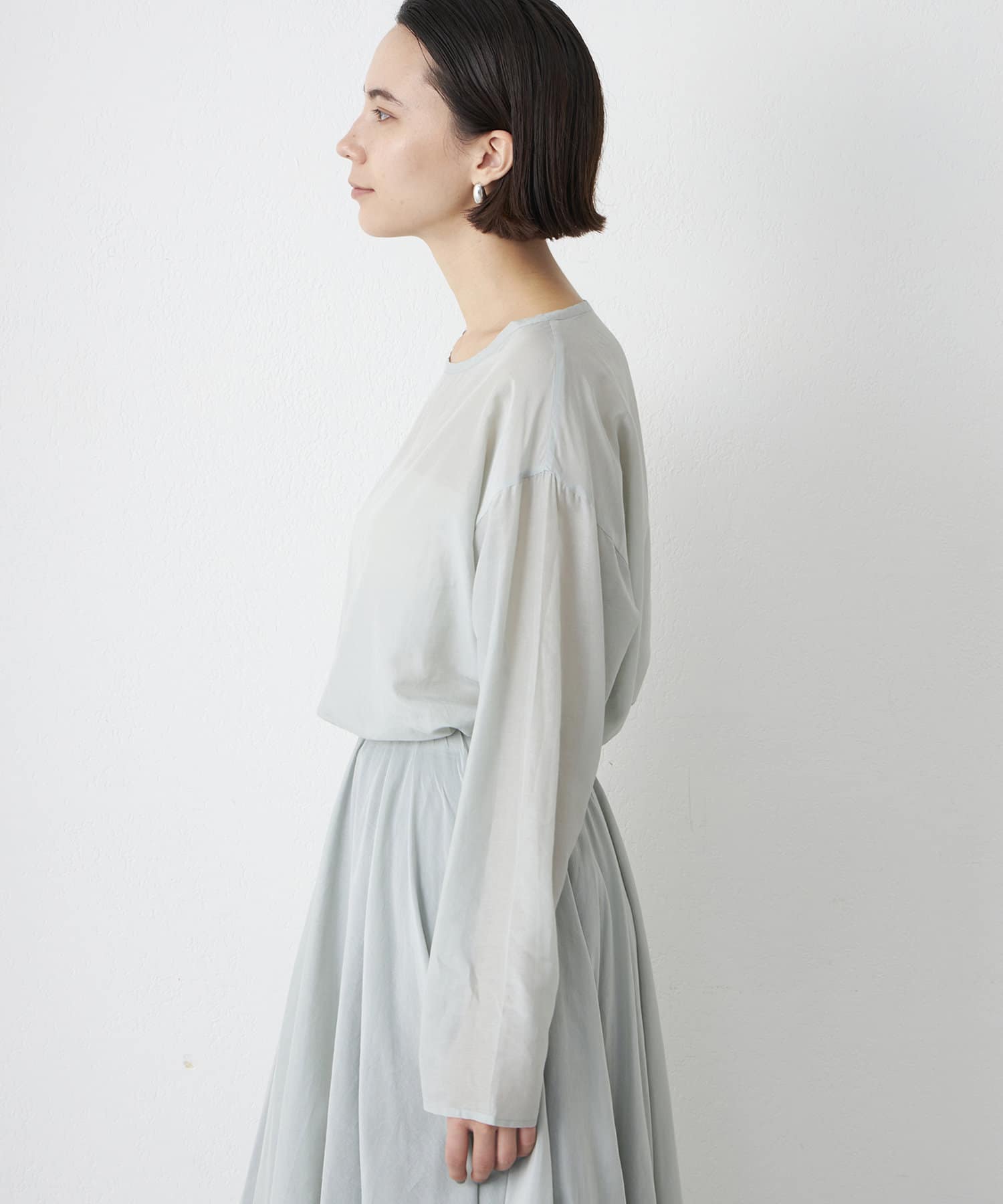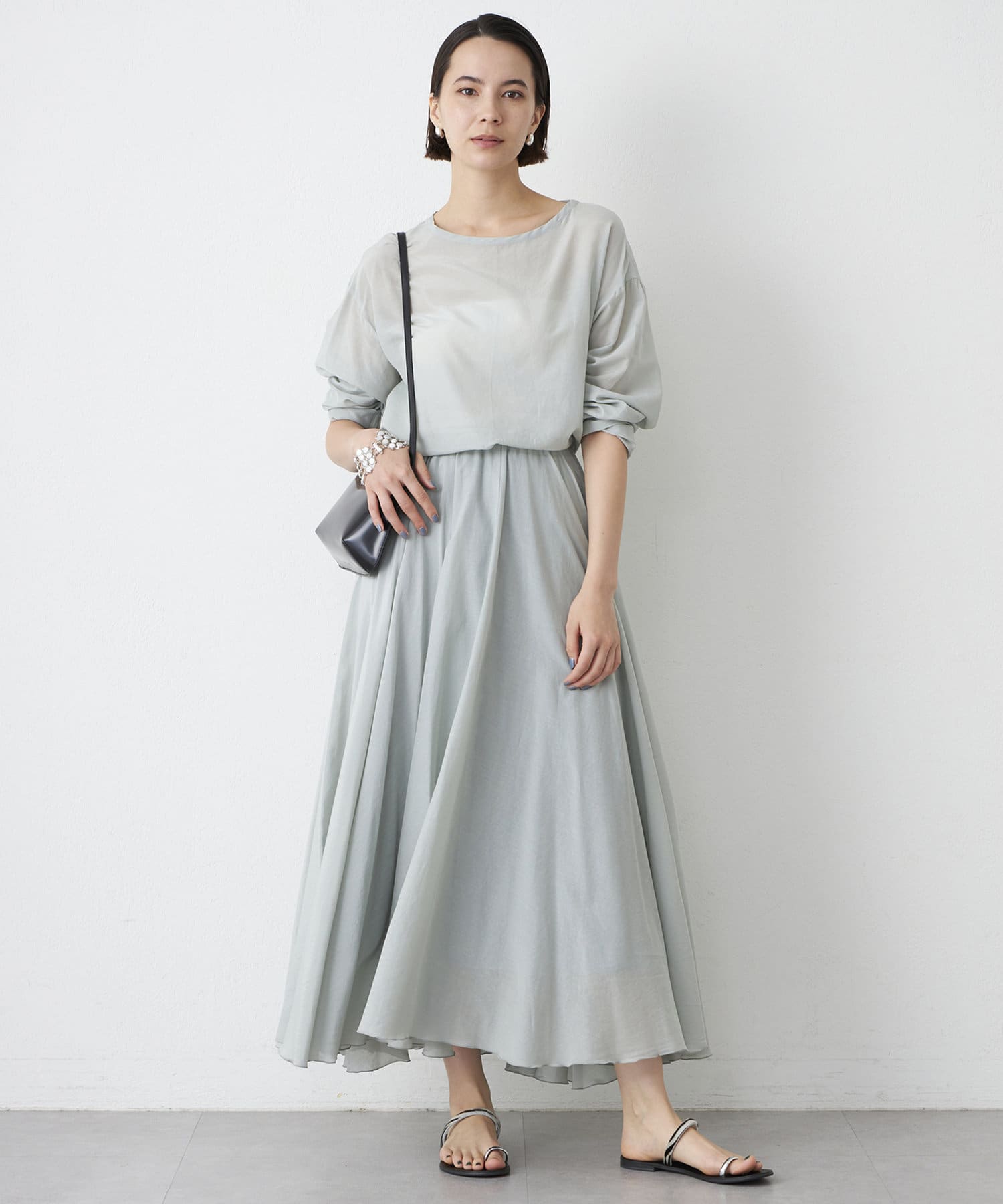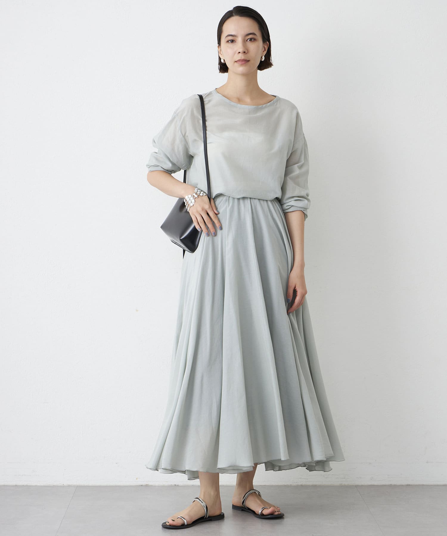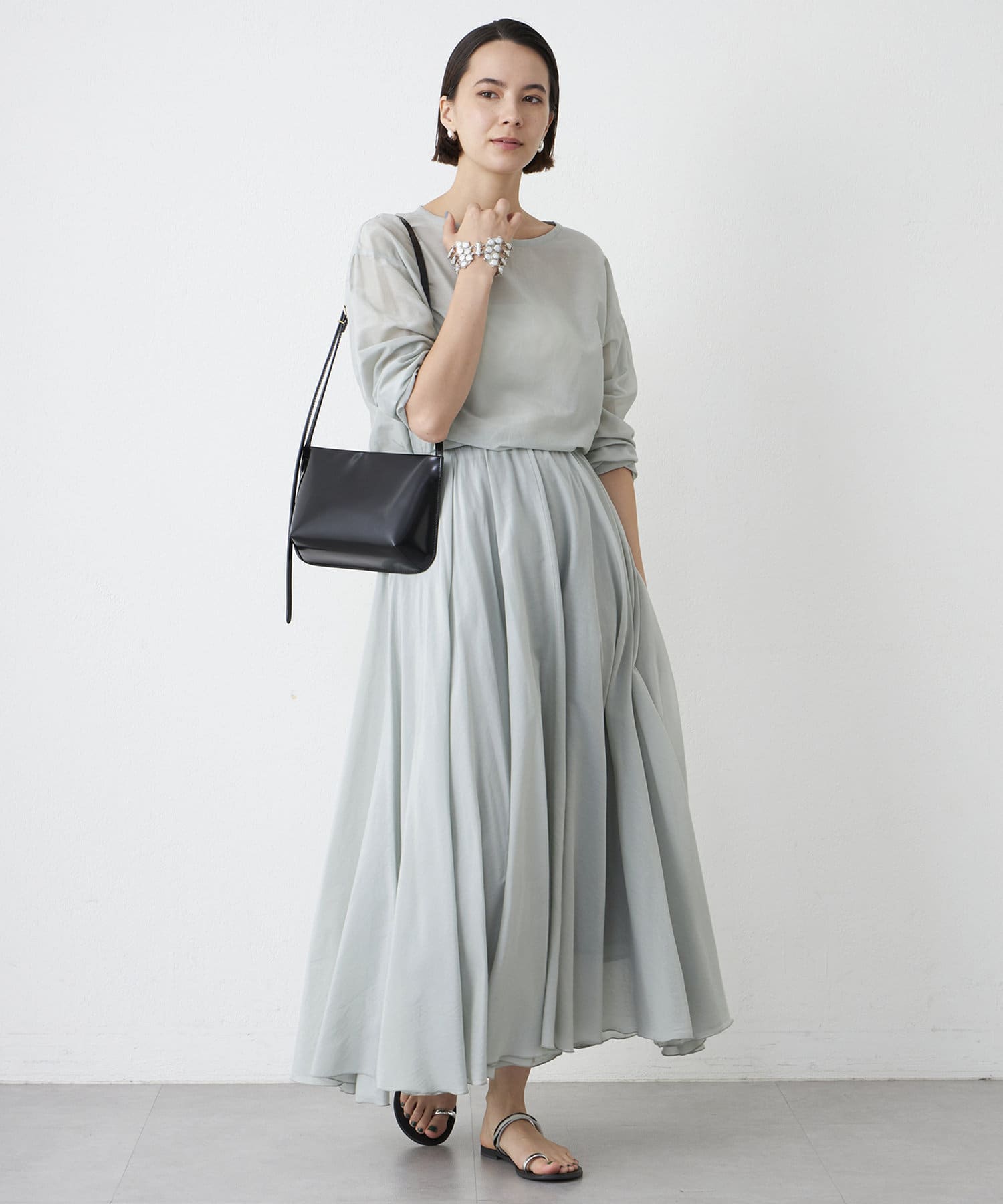■同素材のシルクローンギャザースカートとのセットアップでの着用もおすすめ。