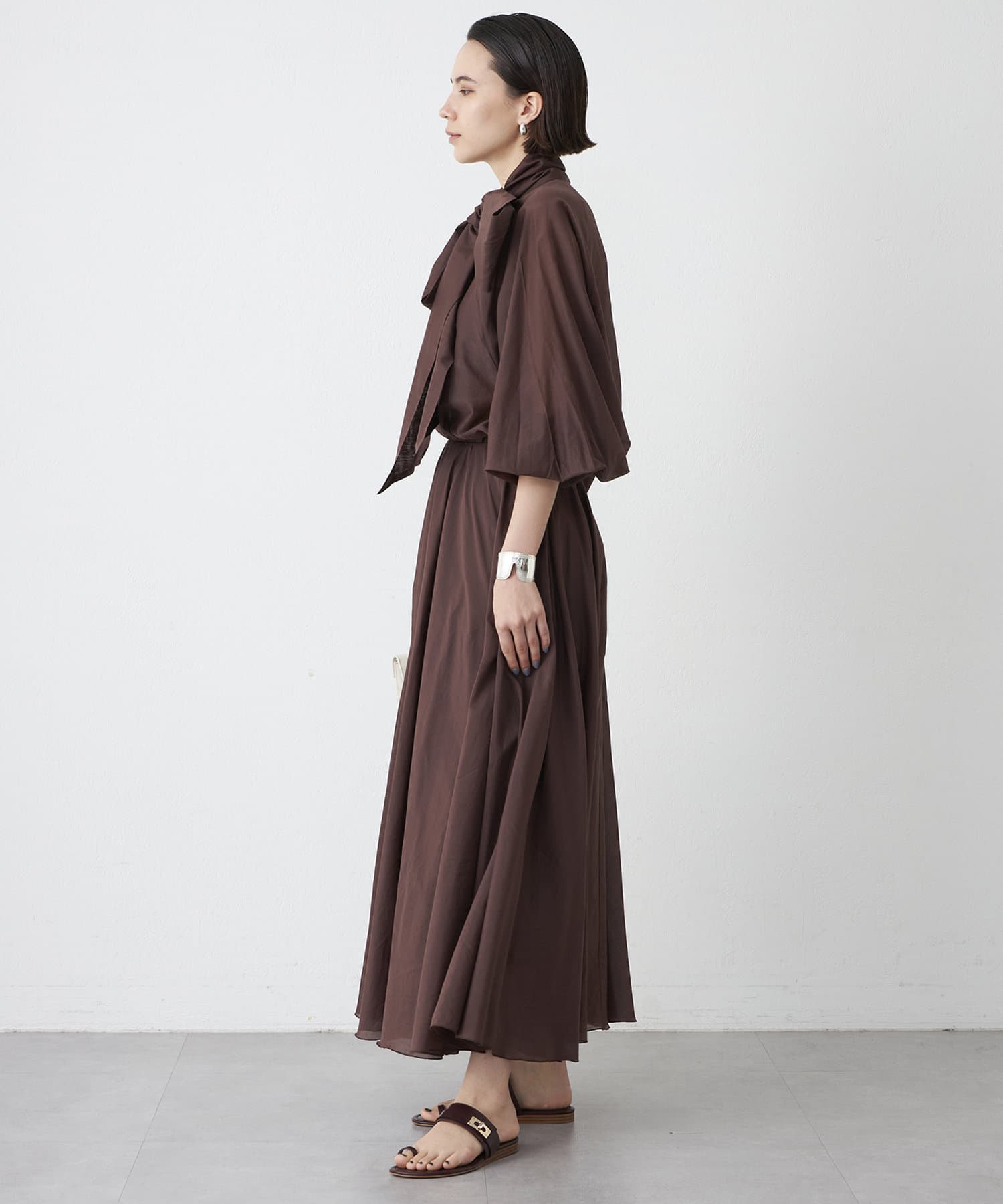 ■同素材のシルクローンギャザースカートとのセットアップでの着用もおすすめ。