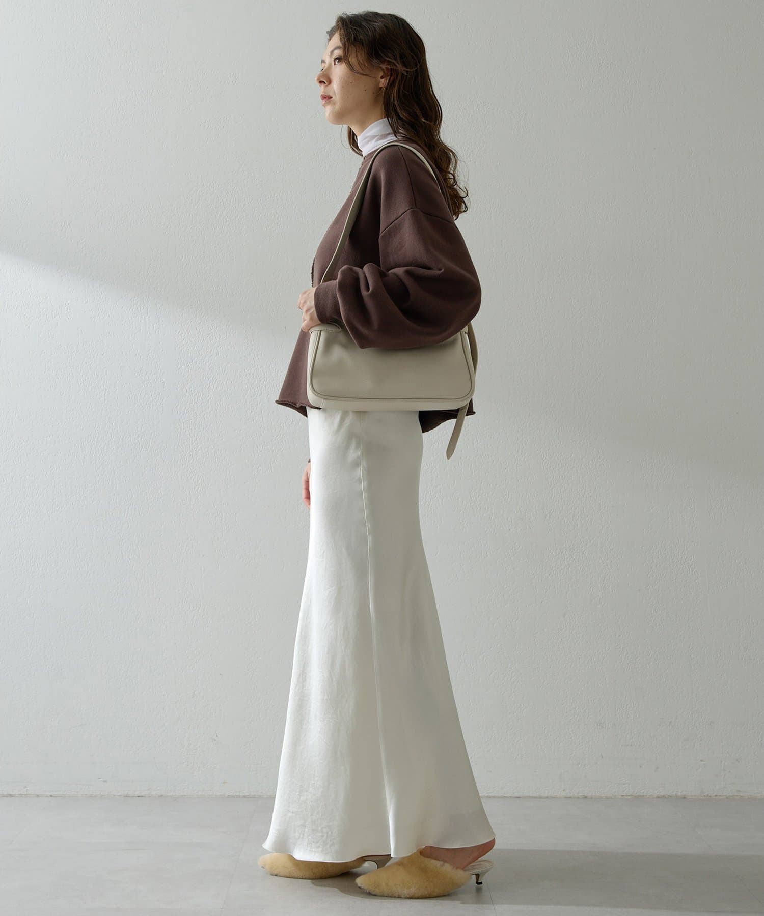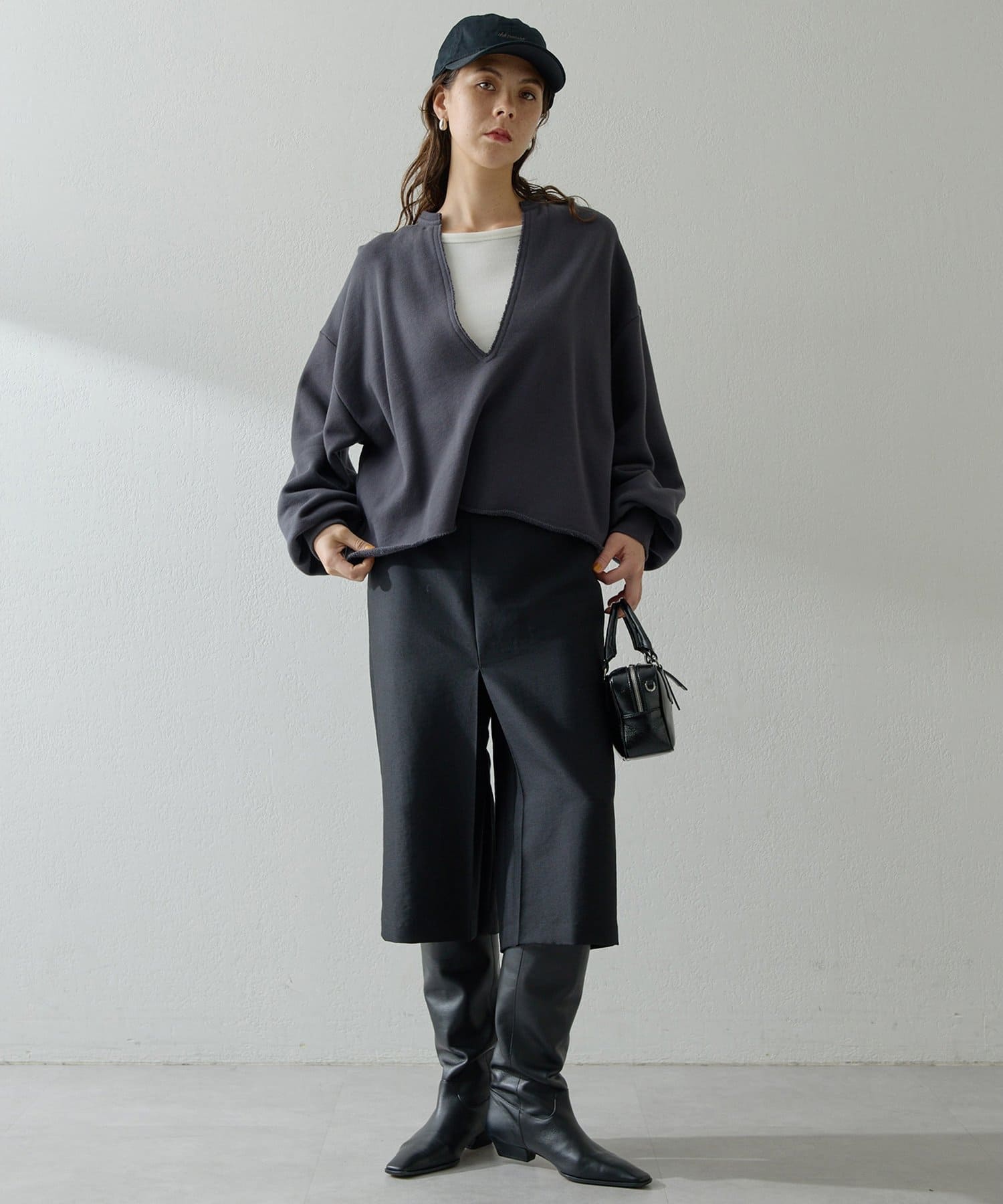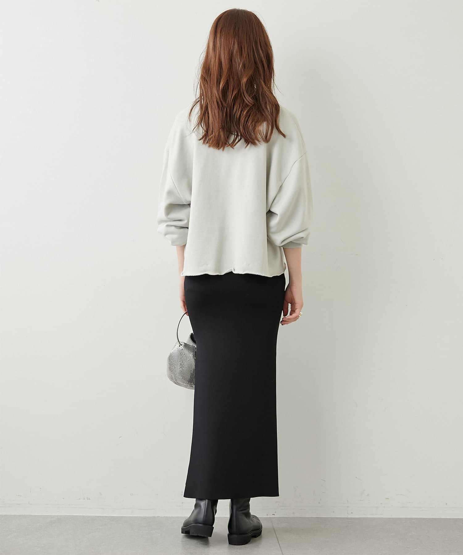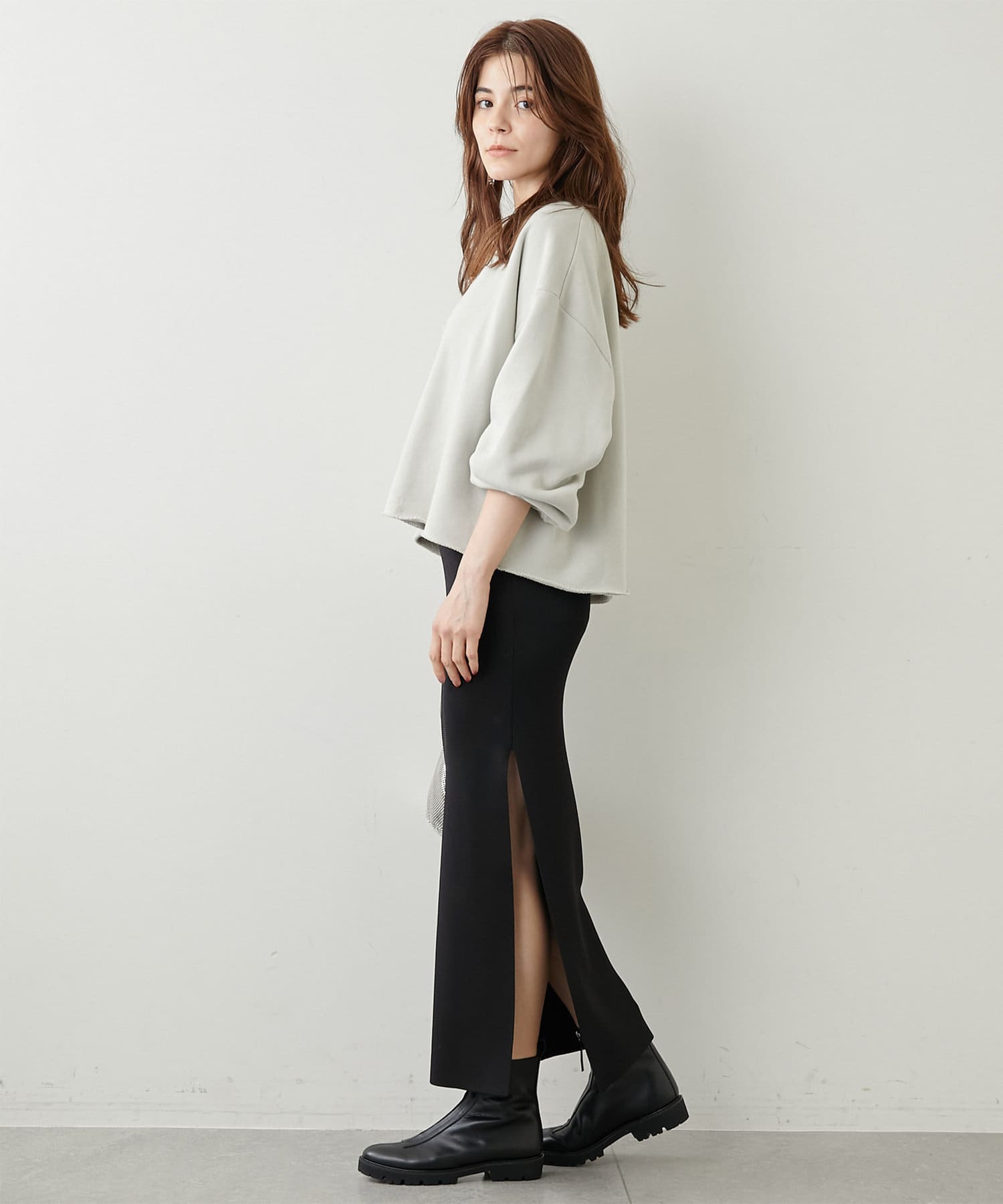 丈も短めなので、ワイドカーブデニムだったり、リブニットタイトスカートだったりに合わせて着ています。