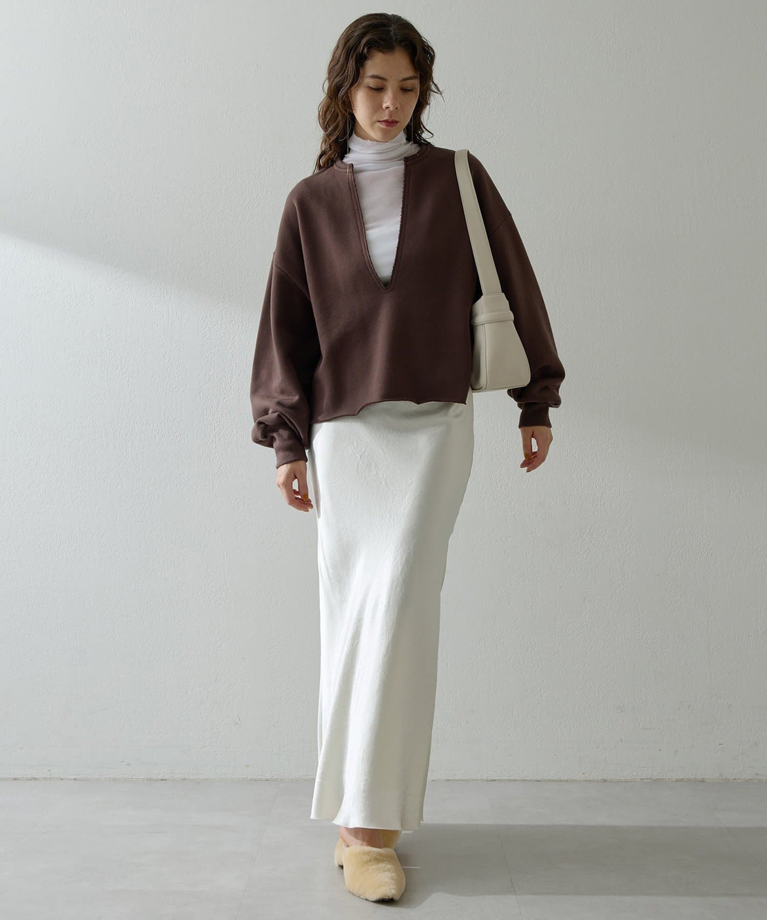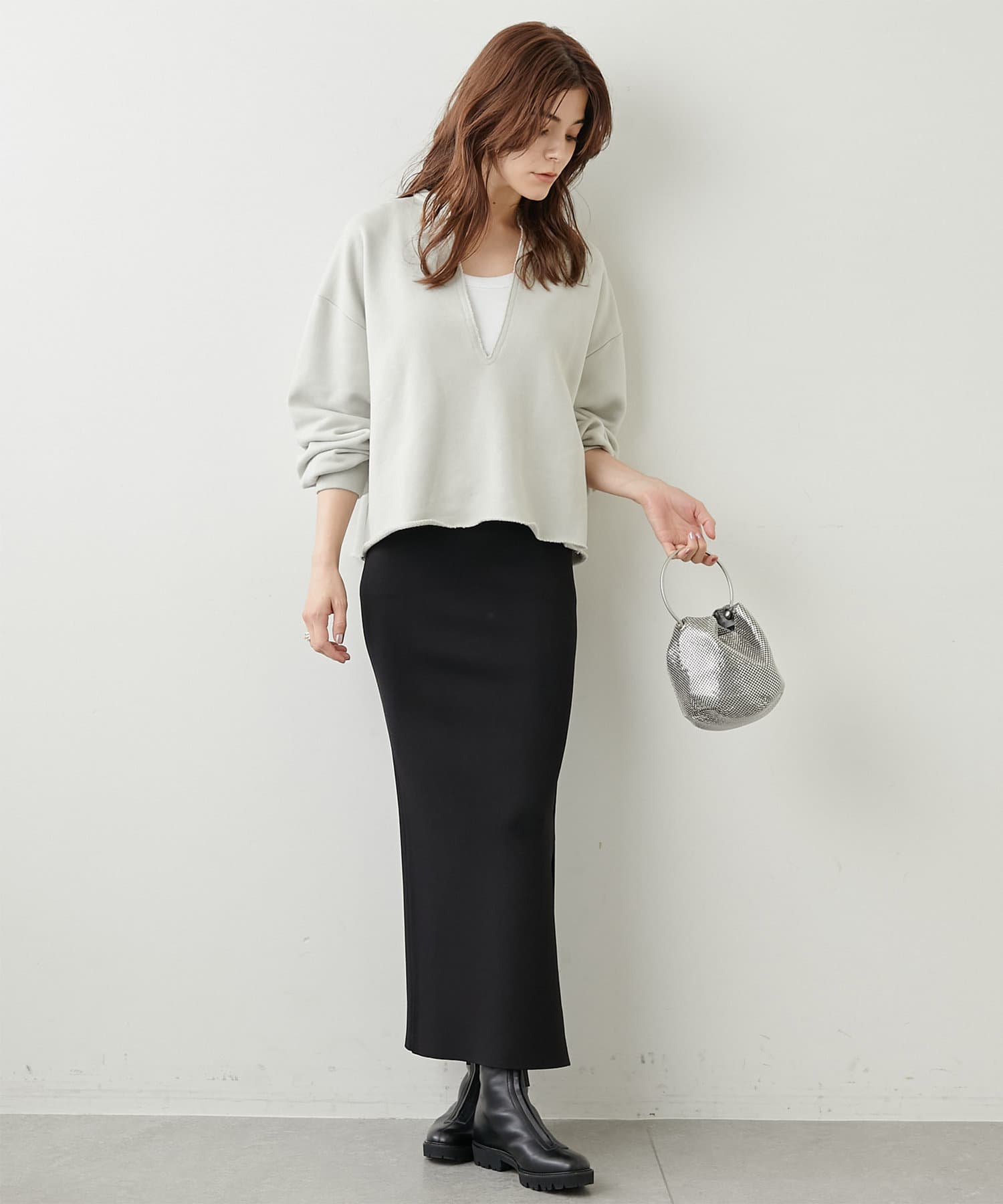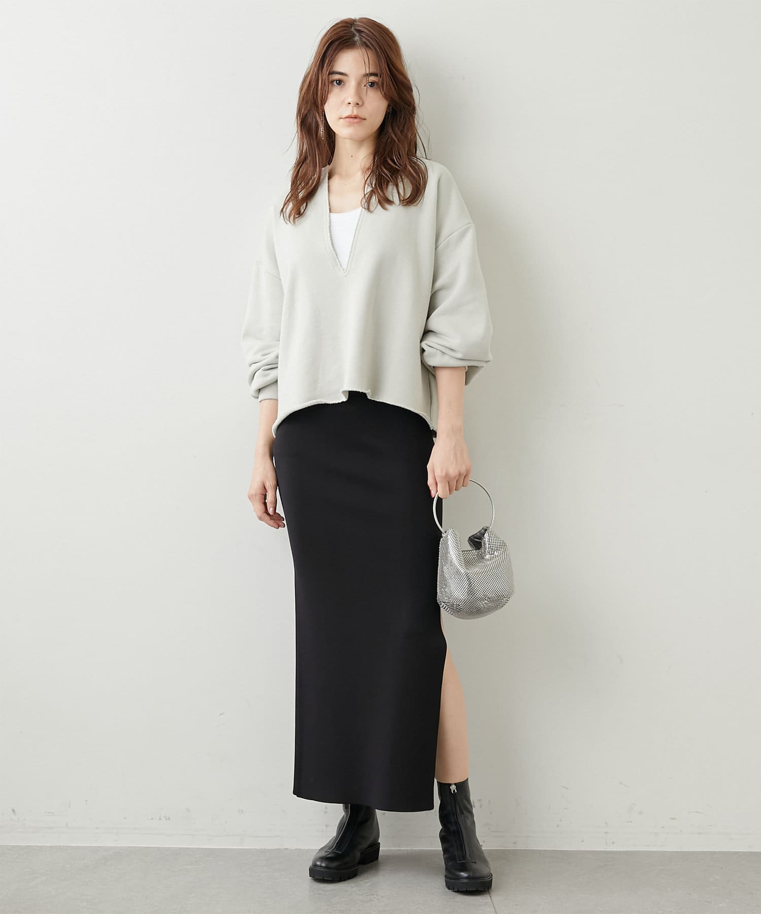 丈も短めなので、ワイドカーブデニムだったり、リブニットタイトスカートだったりに合わせて着ています。