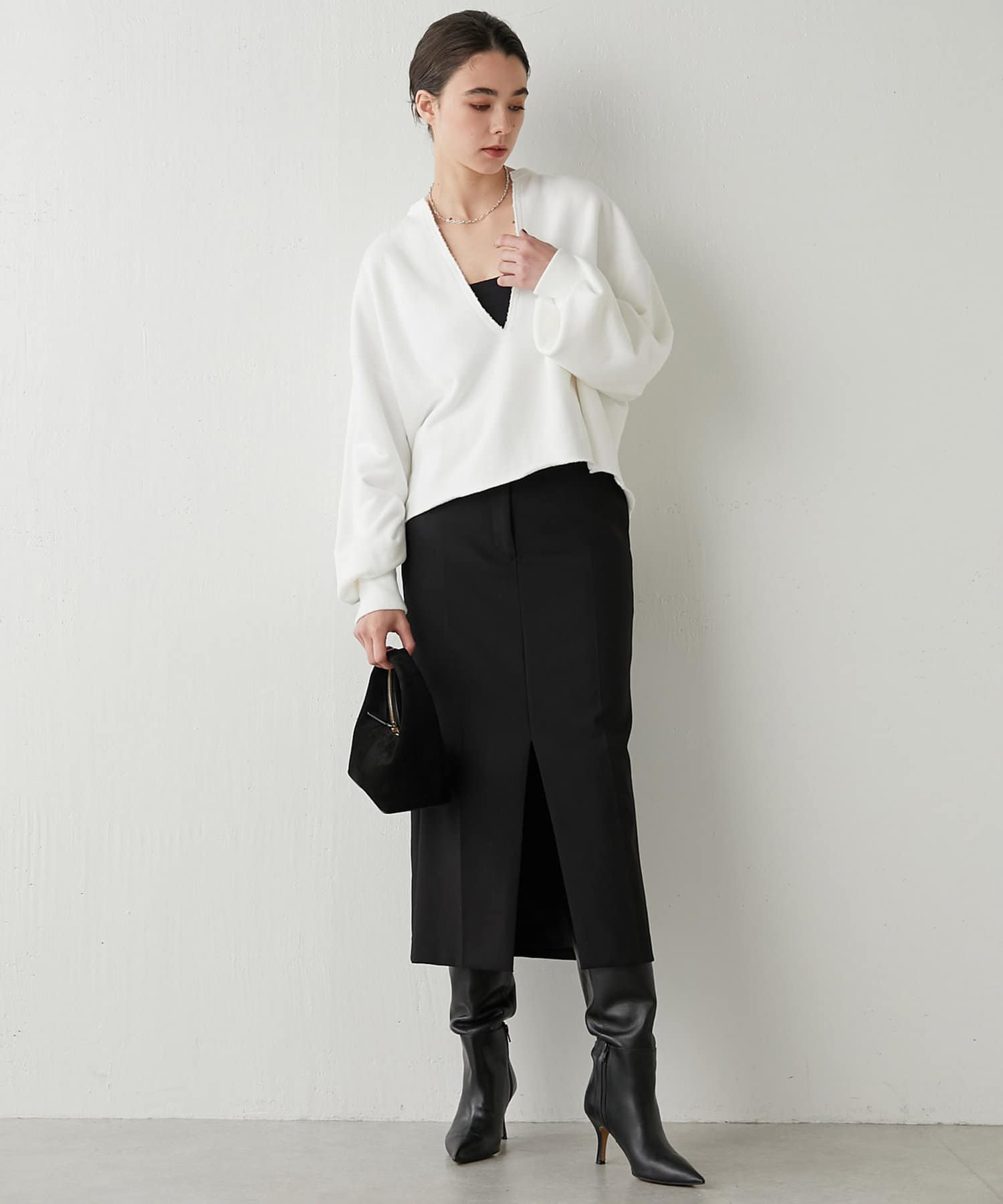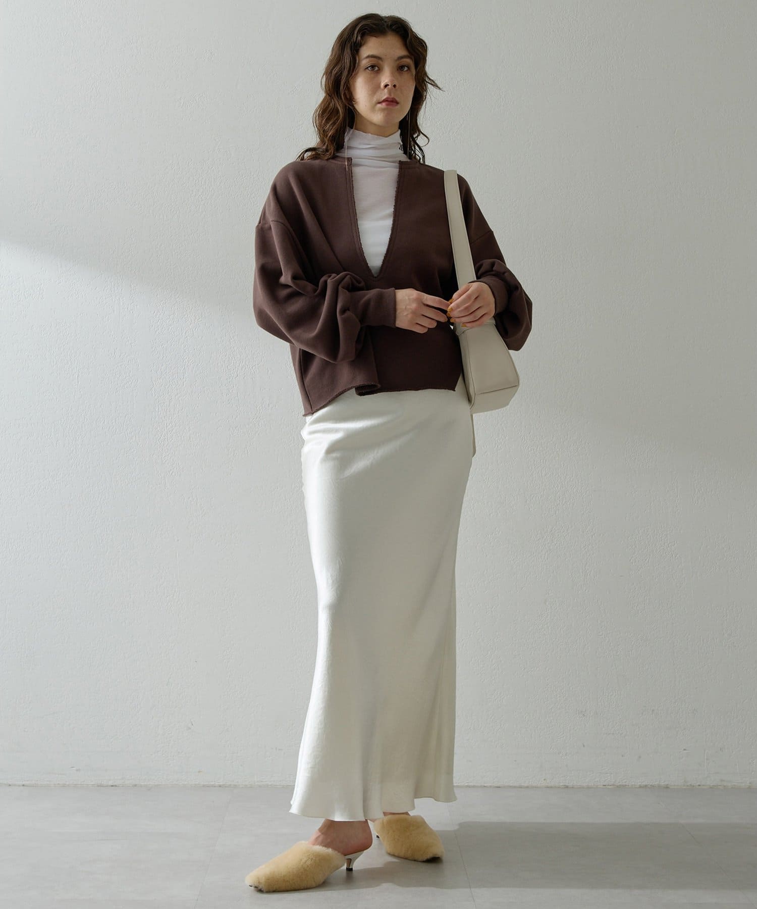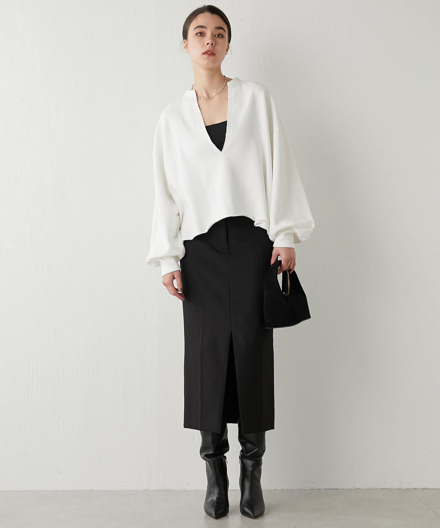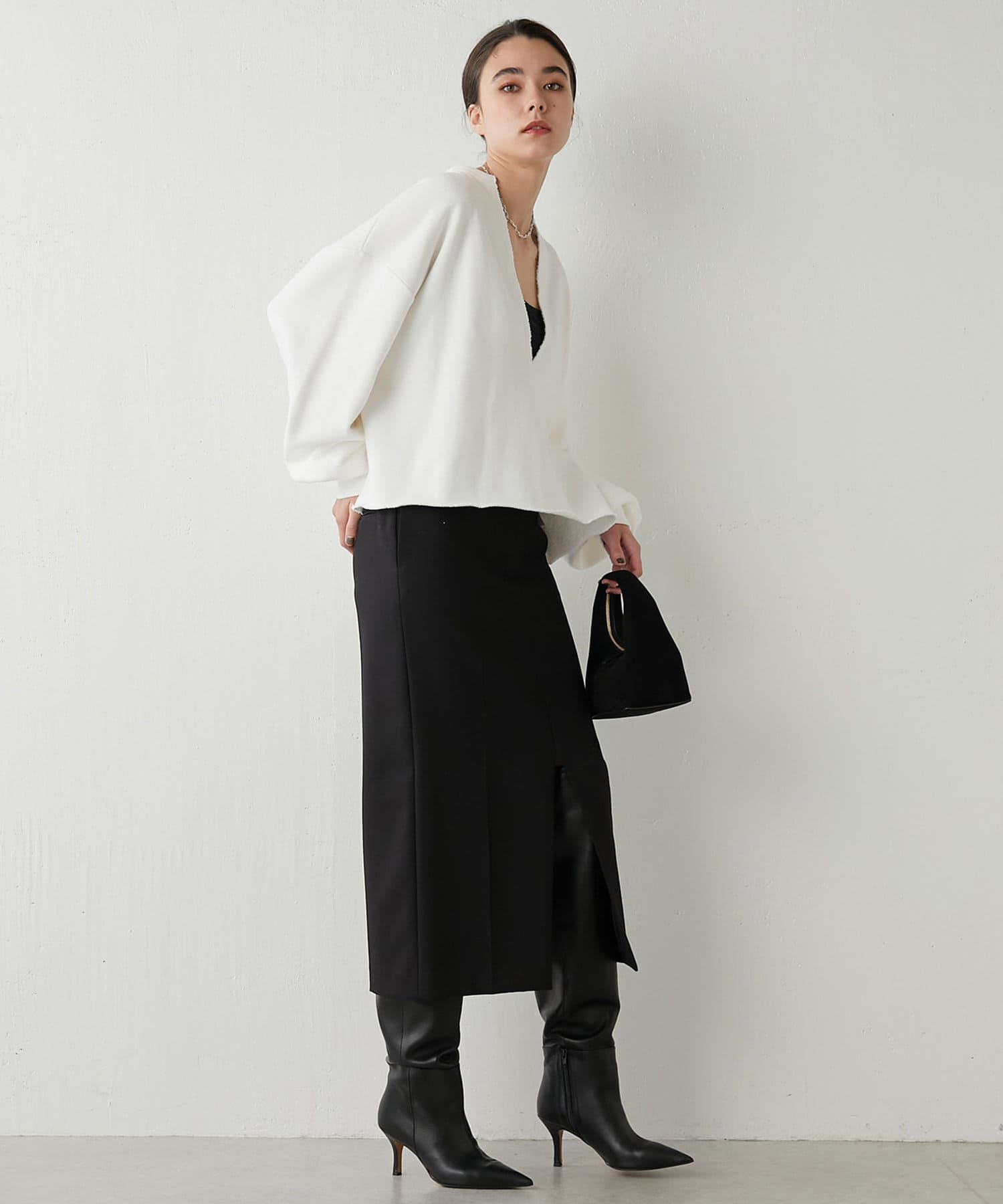 丈も短めなので、ワイドカーブデニムだったり、リブニットタイトスカートだったりに合わせて着ています。