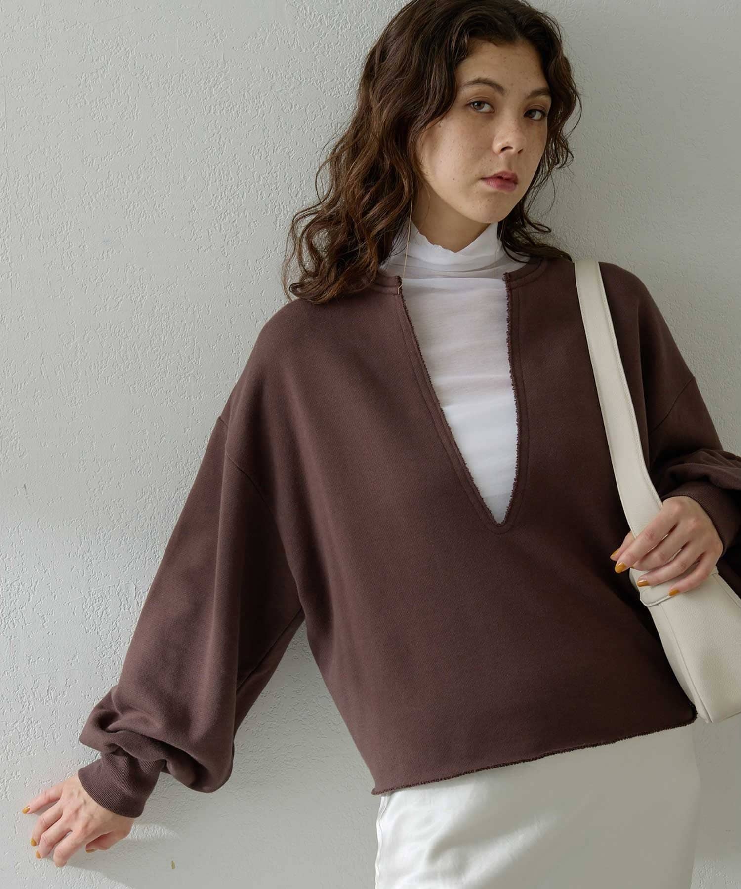 購入場所:パルクローゼット深めのVネックが珍しく、女性らしさを感じられるスウェットです。