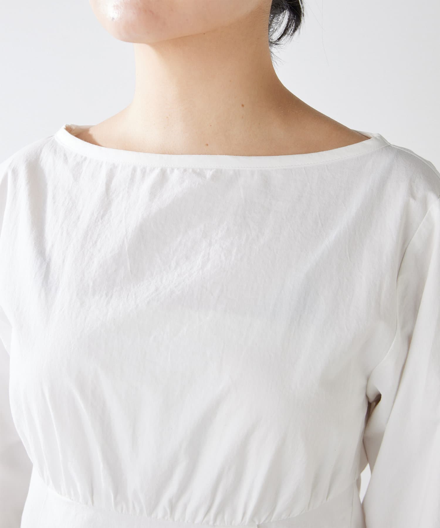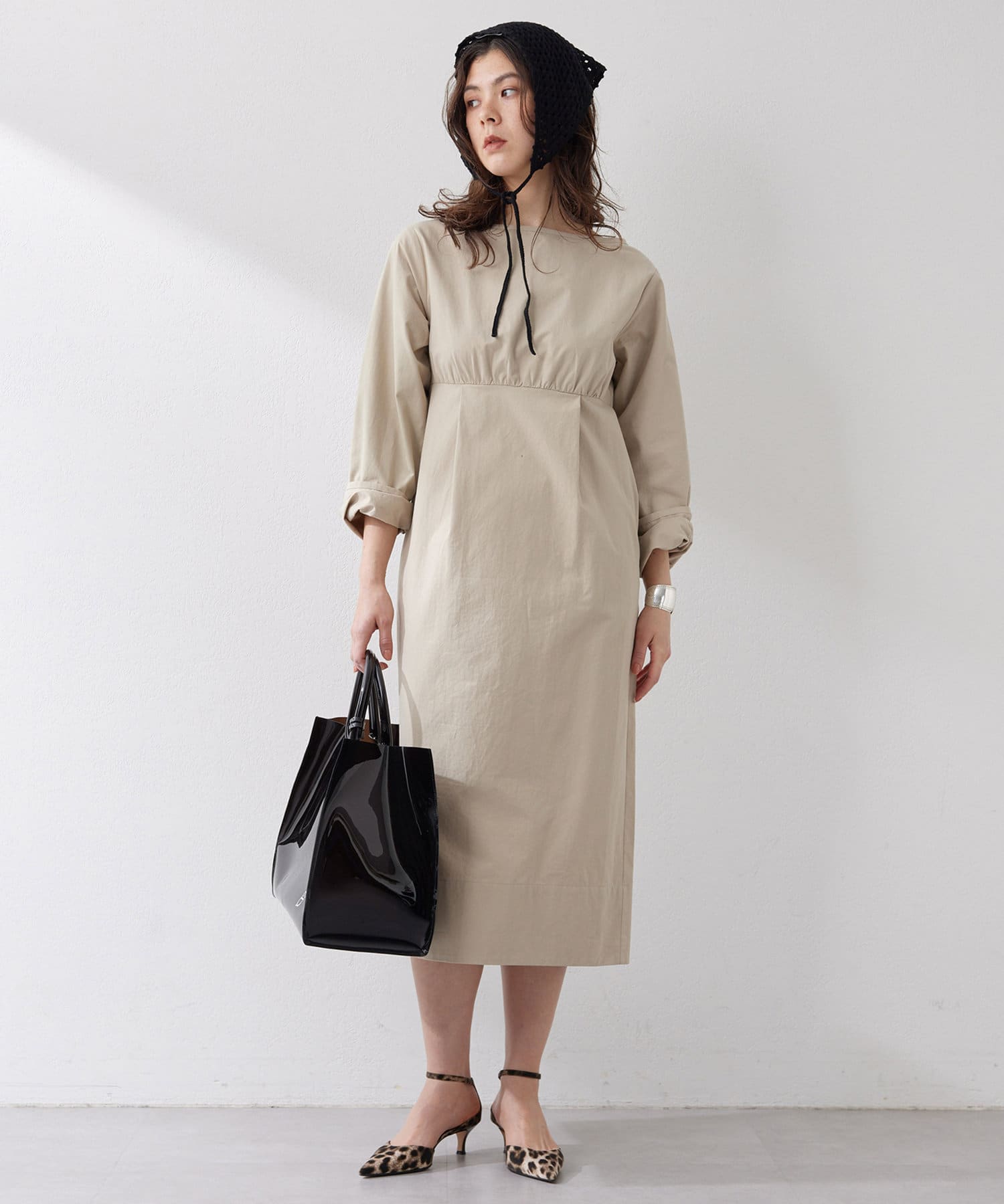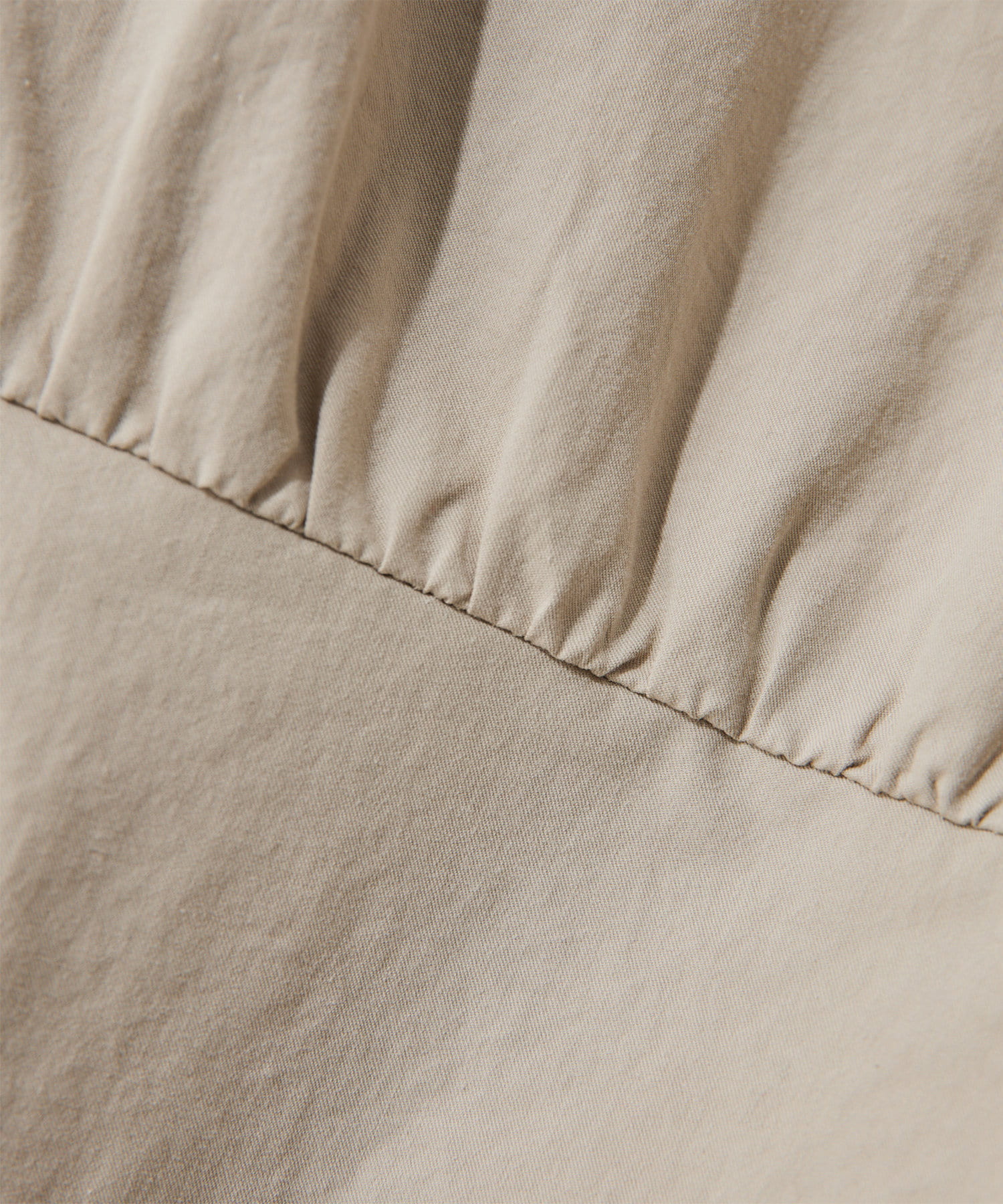 ■高いウエスト位置から上身頃にギャザー、下身頃にタックをプラスしたデザイン。
