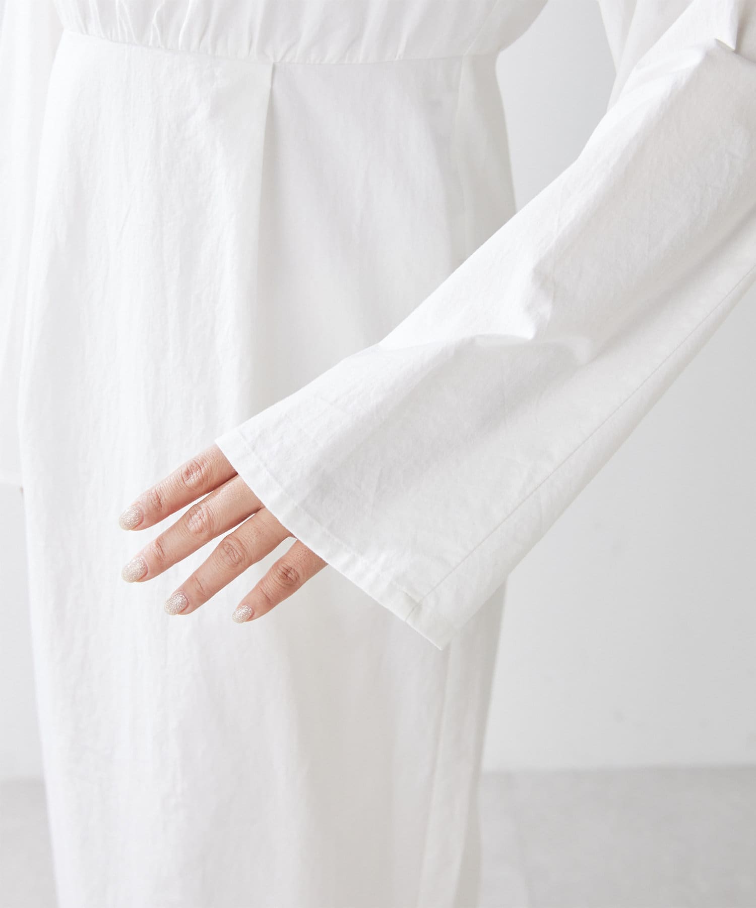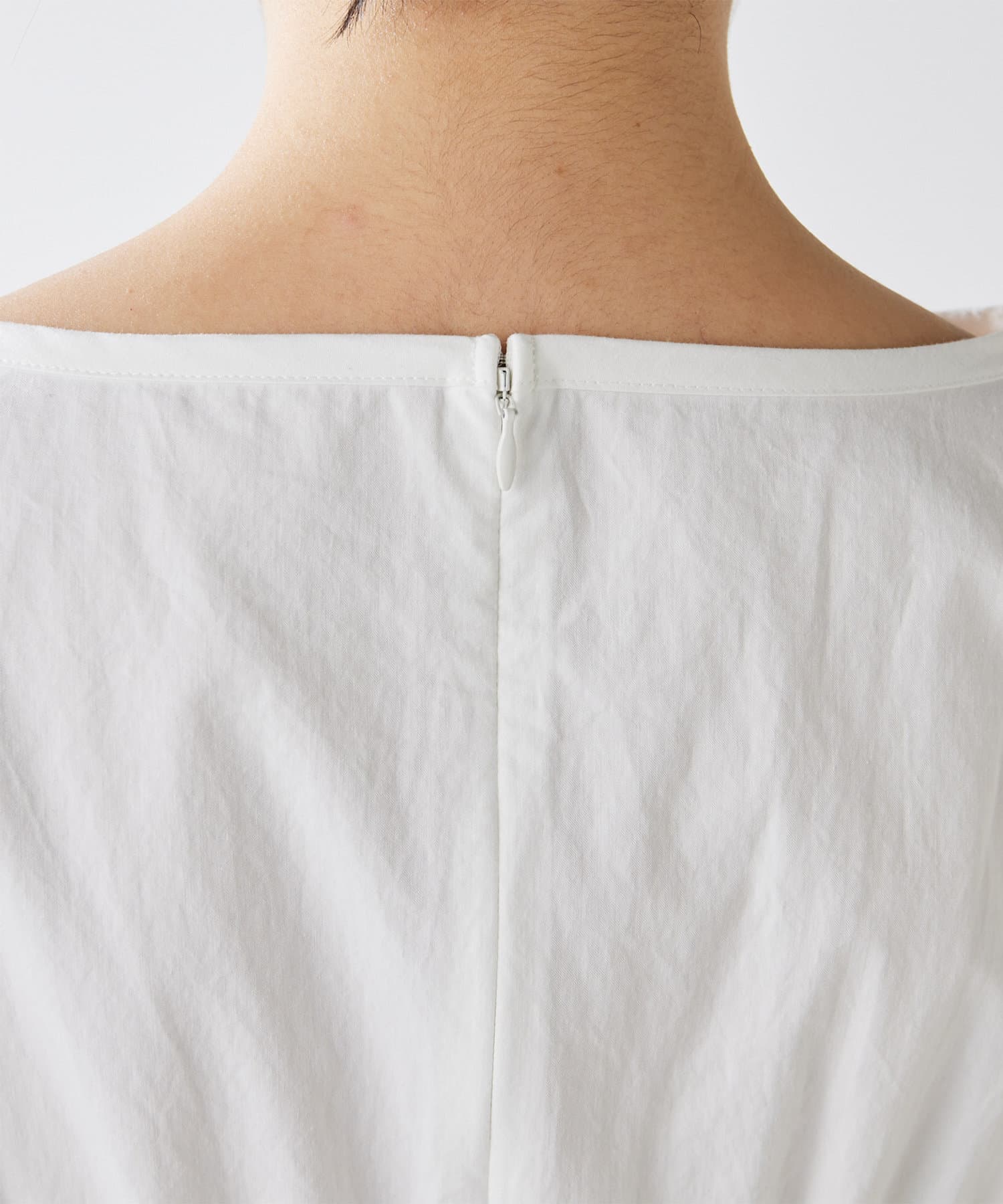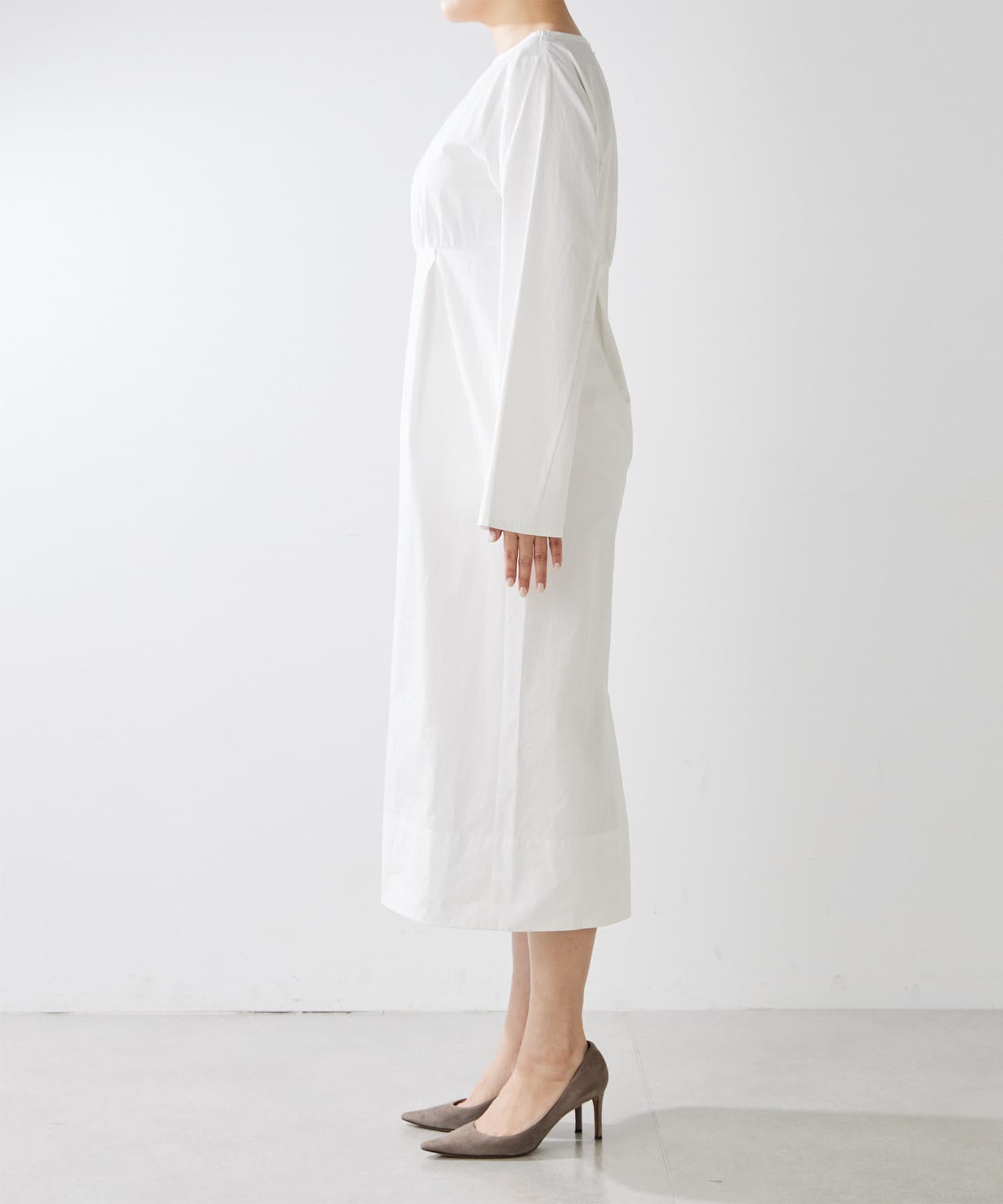 ■高いウエスト位置から上身頃にギャザー、下身頃にタックをプラスしたデザイン。